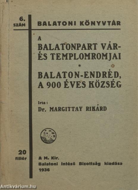 Első kiadás.Balatoni Könyvtár, no.: 6. sz. A Balatonpart vár- és templomromjai. Balaton-Endréd, a 900 éves község. Írta: Dr. Margittay Rikárd. A címlap előtti képtáblán két fekete-fehér fotóval illusztrált, valamint két oldalszámozáson belüli kottarészlettel kiegészített kötet. Nyomtatta Pesti Lloyd-nyomda. Néhány lapon értelmezést segítő jelölés látható. Kiadói varrott papírkötésben lévő példány feliratos címfedéllel, feliratozatlan könyvgerinccel, hátlapon a felelős kiadó feltüntetésével, tiszta belívekkel, hiánytalan, jó állapotban. A kötet szerzője Margittay Rikárd (1890-1944) újságíró, helytörténész, szerkesztő, Balaton-kutató. Jogi, kereskedelmi és zenei tanulmányokat végzett, majd az első világháború után a Kereskedelmi és Iparkamara fogalmazójaként és a Pester Lloyd közgazdasági szerkesztőjeként dolgozott. 1920-tól magánalkalmazásban állt; irodalommal és újságírással, valamint Buda múltjával foglalkozott. 1928-tól Balatonzamárdiban élt. 1936–1943 között a Balaton hetilapjának, a Balatoni Kurirnak volt munkatársa. Balatoni évei alatt értékes helytörténeti kutatásokat végzett, sokat tett a Balaton és vidékének népszerűsítéséért. Számos műemléket, irodalmi és művészeti emléket, népművészeti hagyományt mentett meg. Egyedülálló balatoni könyvtárat gyűjtött össze.