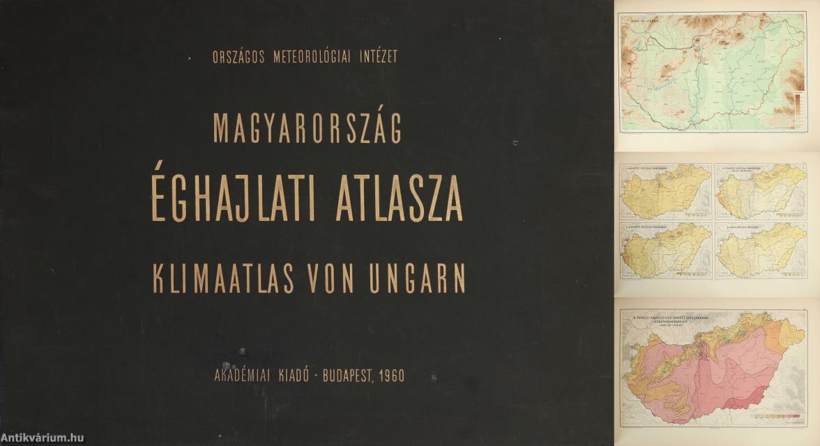 Magyarország éghajlati atlasza. Klima-Atlas von Ungarn. Az Országos Meteorológiai Intézet kutatóinak közreműködésével szerkesztette: Dr. Kakas József. A térképeket rajzolta: Dr. Faragó Istvánné, az Országos Meteorológiai Intézet rajzolója. 78 színes, feliratos éghajlati térképet tartalmazó meteorológiai atlasz. A kiadványhoz tartozik egy kétnyelvű (magyar-német), tűzött kötésű füzet is, amelyben részletes tartalomjegyzék, valamint a térképekhez fűzött magyarázatok kaptak helyet. A térképeket és a magyarázó füzetet az Offset Nyomda és az Akadémiai Nyomda nyomtatta. A tétel nem tartalmazza az atlaszhoz 1967-ben kiadott adattárat (Magyarország éghajlati atlasza II. Adattár). Kiadói egészvászon kötésben lévő példány aranyozott feliratos címfedéllel, feliratozatlan könyvgerinccel, színes, mintás kiadói előzéklapokkal, tiszta belívekkel, hiánytalan állapotban. Különálló, egyedi melléklet: a kötetben megőrzésre került további 8 színes, valamint 68 fekete-fehér térképlap és -vázlat (utóbbiak közül 4 hártyapapíron).