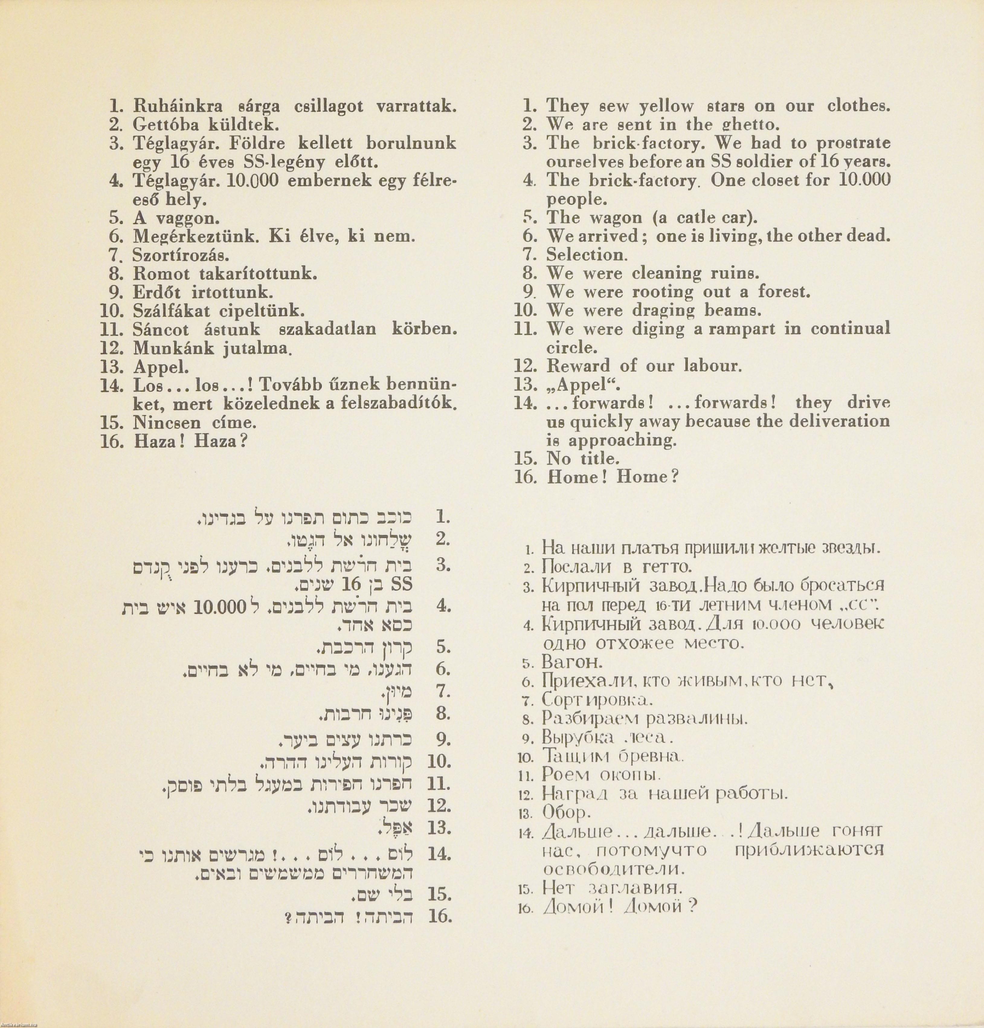 Ennek a könyvnek nincsen címe, mert a fogalomalkotó ember nem találhat szót, amellyel megközelítően is jelölni tudná azt, ami az európai zsidósággal az elmúlt esztendőkben történt. Szépírók tollából könyvek fognak megjelenni, dokumentumok és élmények felhasználásával hűséges vagy stilizált képet fognak az olvasó elé vinni. Az ő előadásuknak folyamatos módjával az élmények nem jelenetszerűen, hanem fejlődő cselekmény alakjában kerülnek majd az olvasó elé. Ő fog belőle képeket formálni, szemlélő-képzelő ereje szerint vízióvá szaggatva.