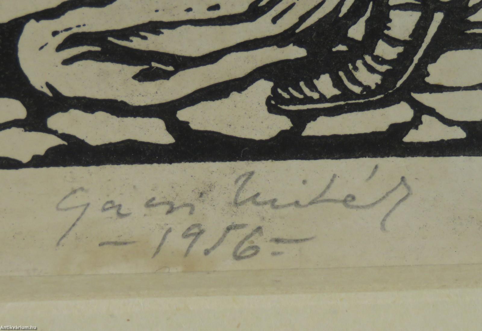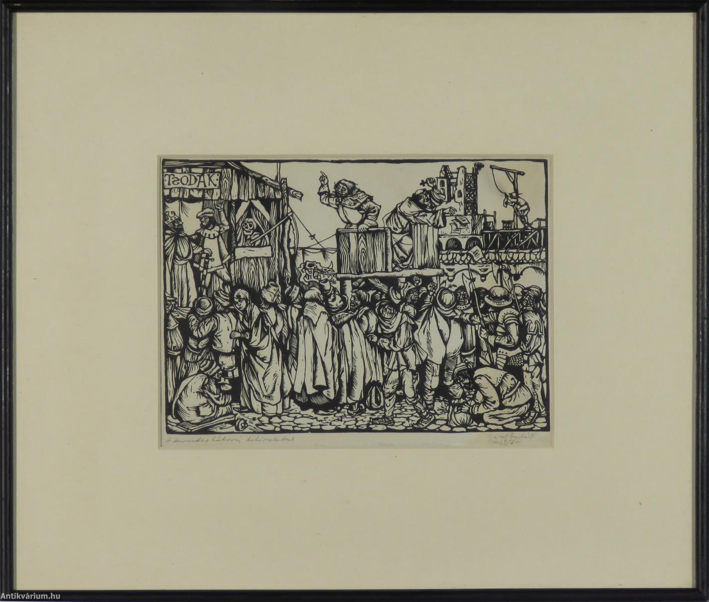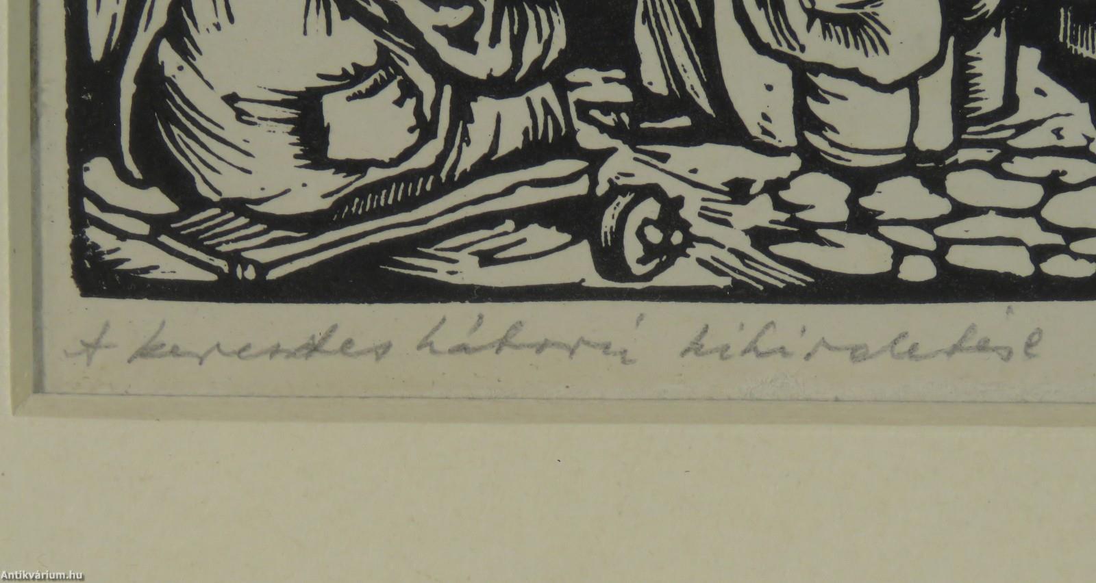 Jelezve balra lent: A keresztes háború kihirdetése (ceruzával), jobbra lent: Gácsi Mihály - 1956 - (ceruzával), linómetszet, papír.