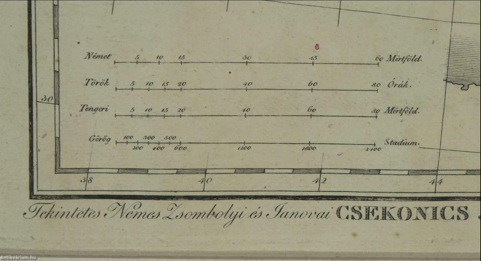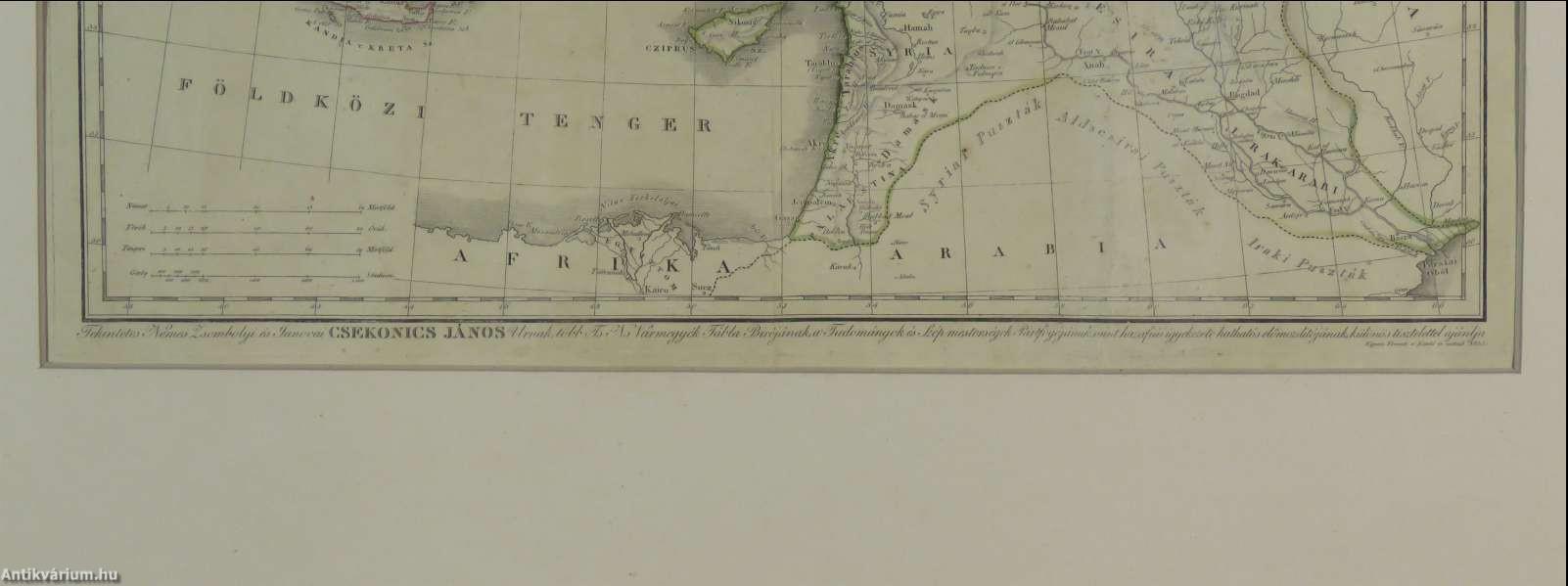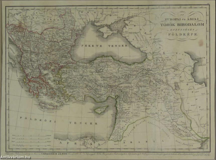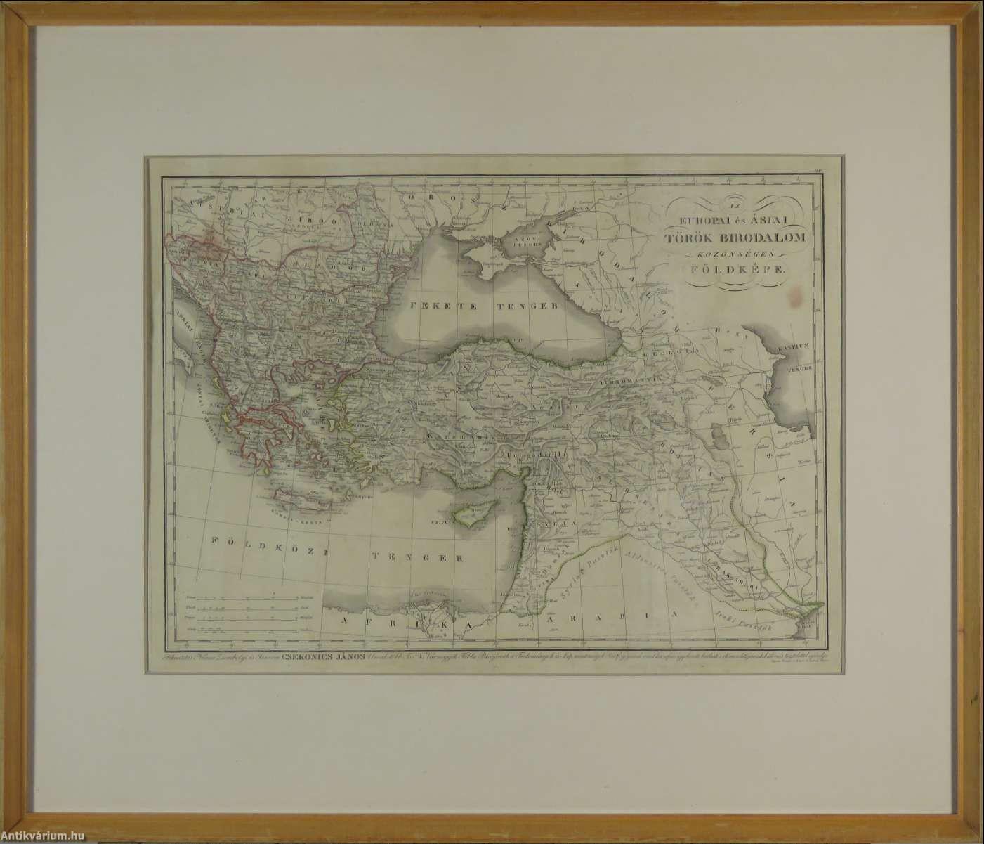 A Török Birodalom rézmetszetes térképe, színezett határvonalakkal, Nemes Zsombolyi és Janovai Csekonics Jánosnak szóló ajánlással, korabeli német, török, tengeri és görög mértékek feltüntetésével.