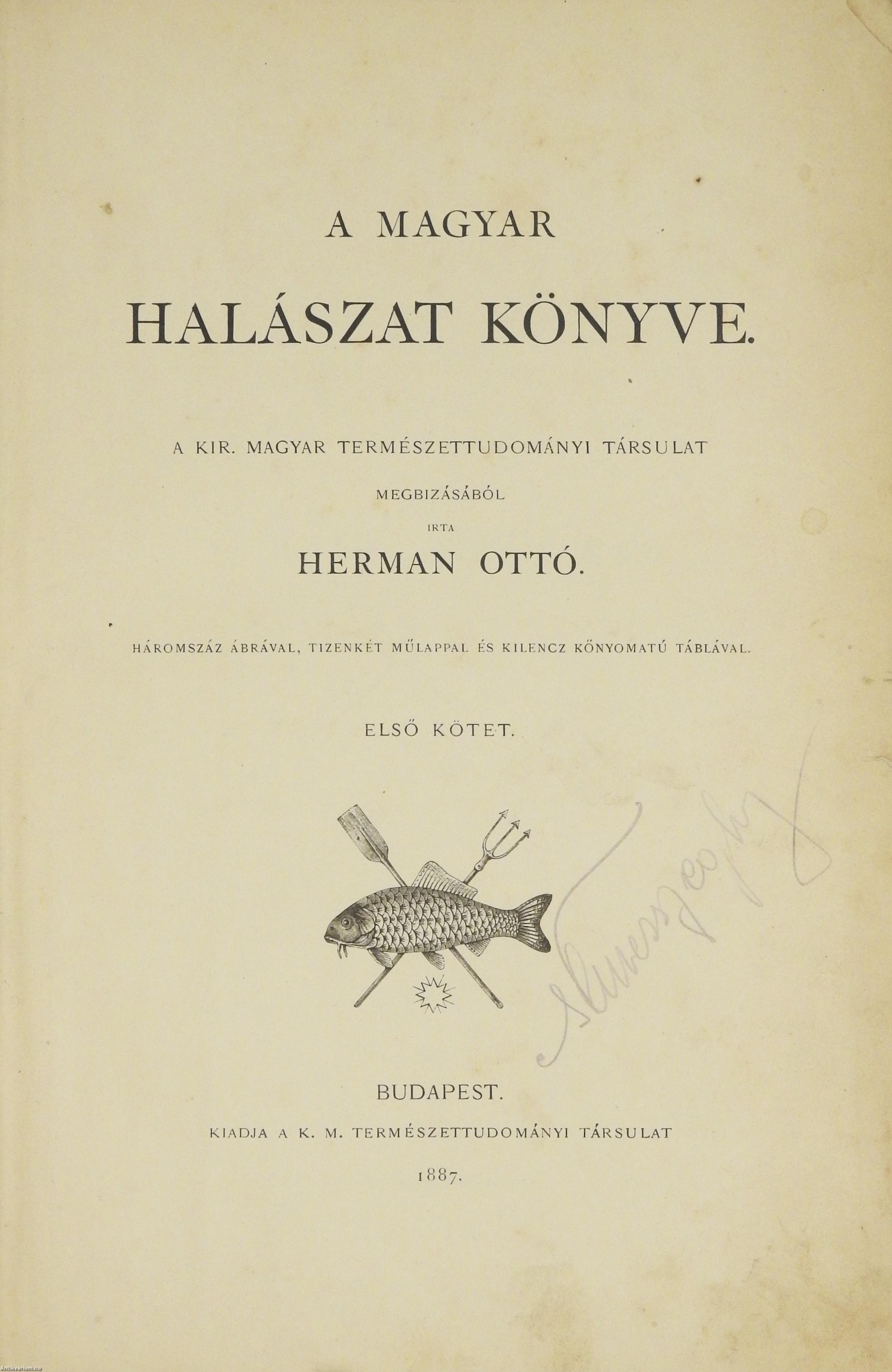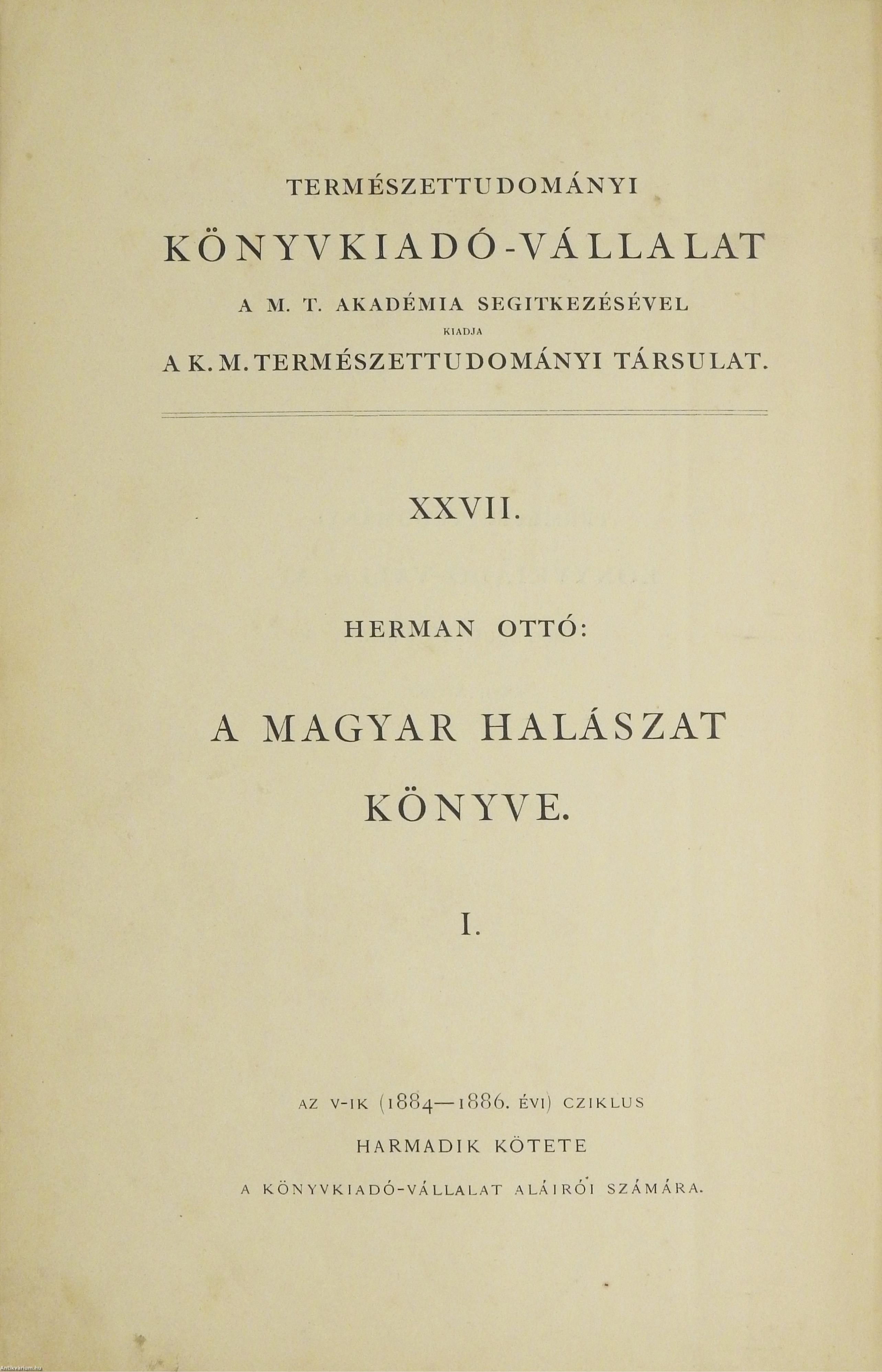A Természettudományi Könyvkiadó-Vállalat könyvsorozatának XXVII. és XXVIII., a könyvkiadó-vállalat aláirói számára az V-ik (1884-1886. évi) cziklus harmadik és negyedik kötetei. Első kiadás. A magyar halászat könyve I-II. (Egységes külön kötetekben.) A Kir. Magyar Természettudományi Társulat megbízásából írta: Herman Ottó.