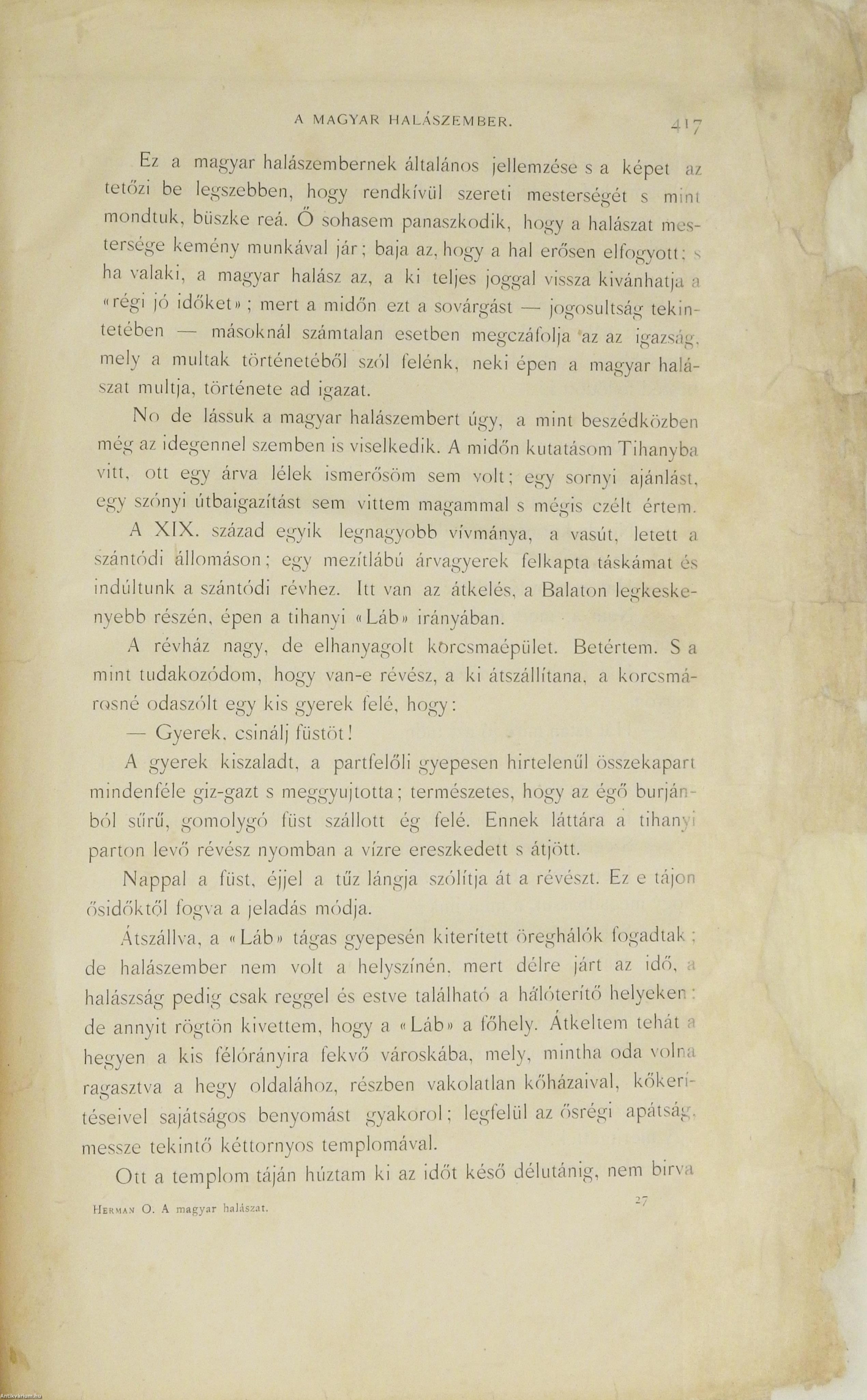 A kötet szerzője, Herman Ottó (Breznóbánya, 1835. június 26. – Budapest, 1914. december 27.) természetkutató, zoológus, néprajzkutató, régész, politikus. Sokoldalú tudományos tevékenysége nyomán az utolsó magyar polihisztornak és a madarak atyjának is nevezték, ezernél is több tudományos publikáció fűződik a nevéhez. A magyar őskőkorszak-kutatás és a hazai tudományos barlangkutatás egyik elindítója volt. Termékeny természetrajzi írói munkássága mellett mint tudományszervező is jeleskedett. A Természettudományi Füzetek és az Aquila c. madártani folyóirat szerkesztője, a Magyar Ornitológiai Központ alapító-igazgatója, a Magyar Néprajzi Társaság alapítótagja és elnöke, a tudományos ismeretterjesztés műfajának egyik magyarországi megteremtője.