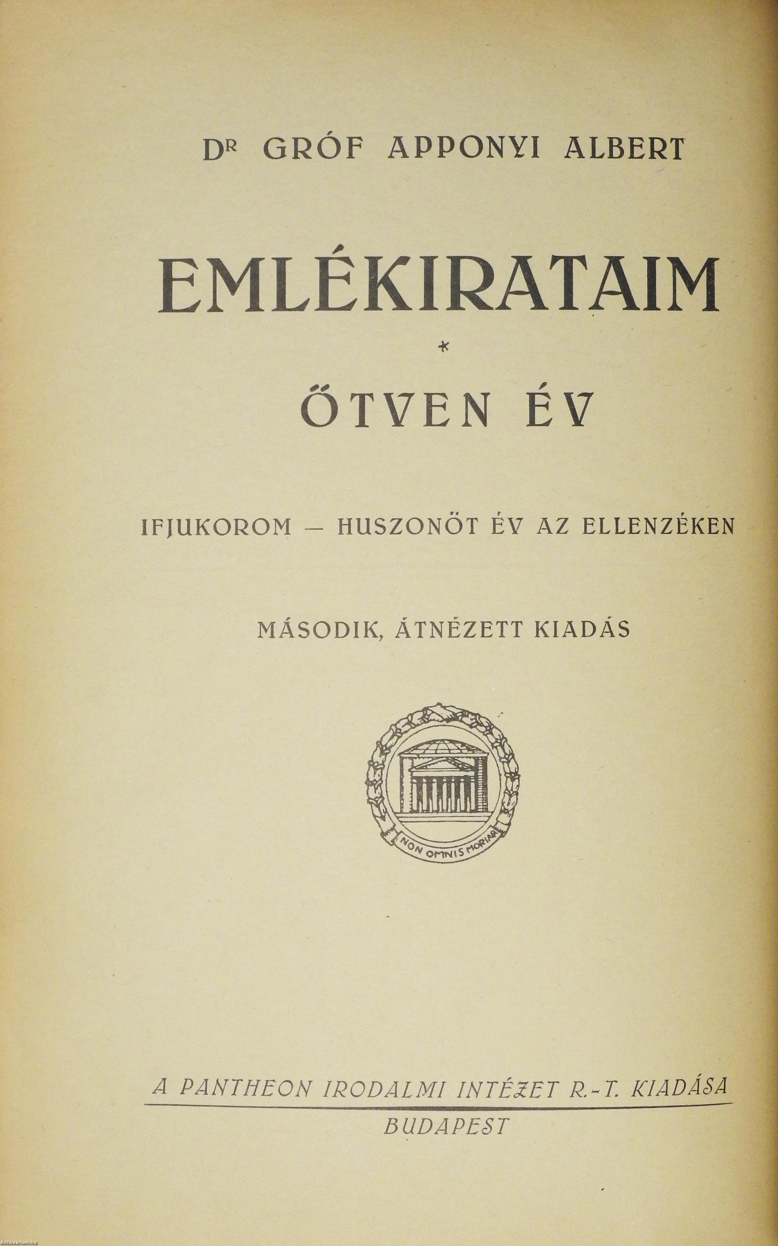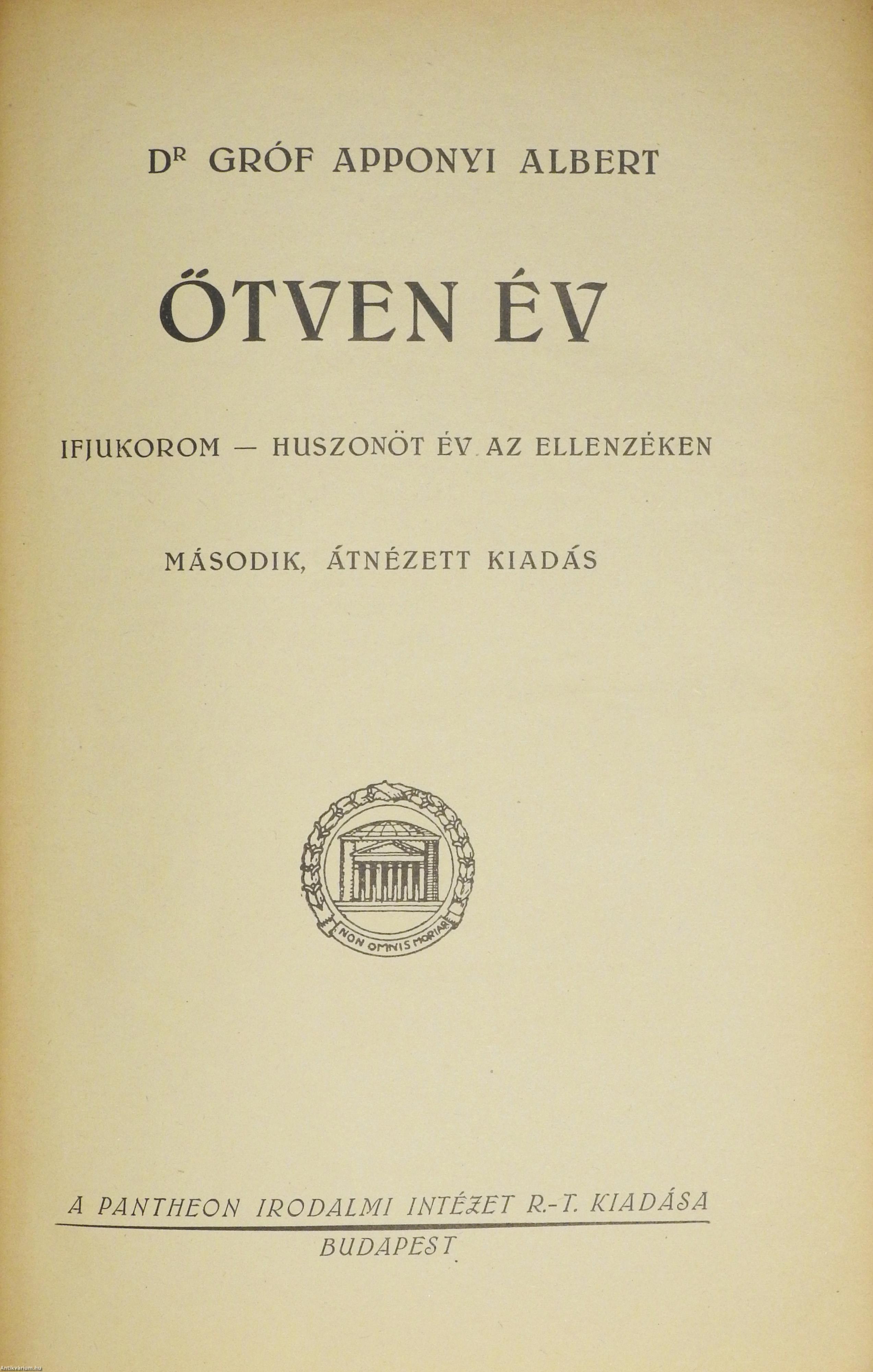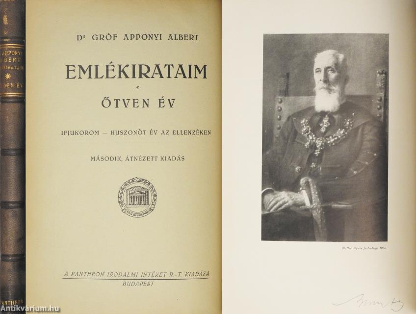 Szerző által aláírt példány. Ötven év. Ifjúkorom - huszonöt év az ellenzéken. Írta: Gróf Dr. Apponyi Albert.