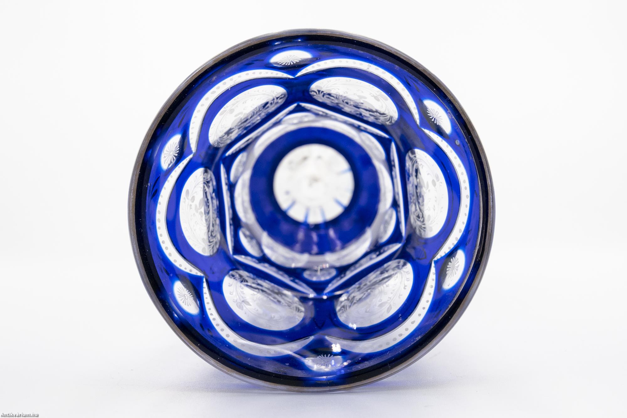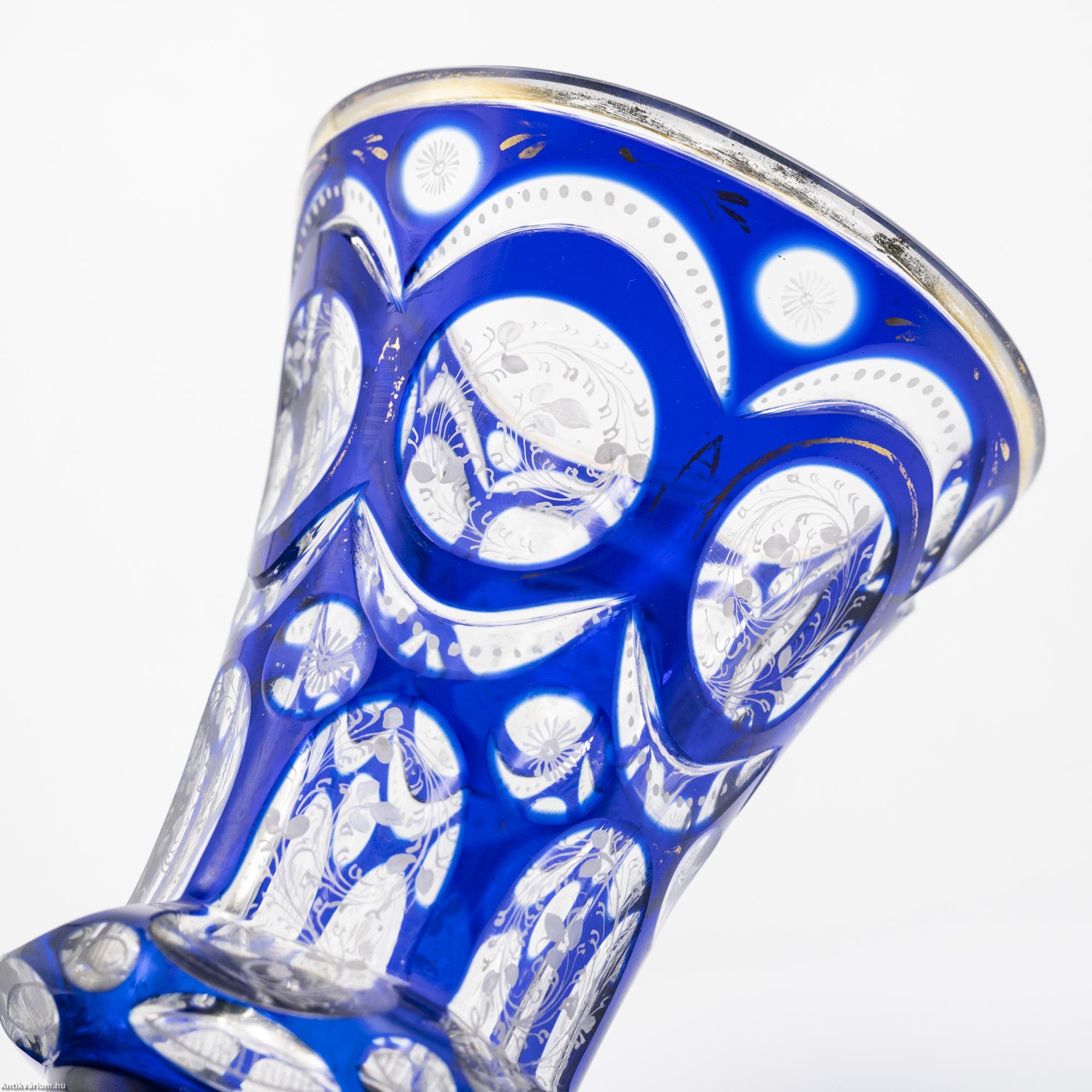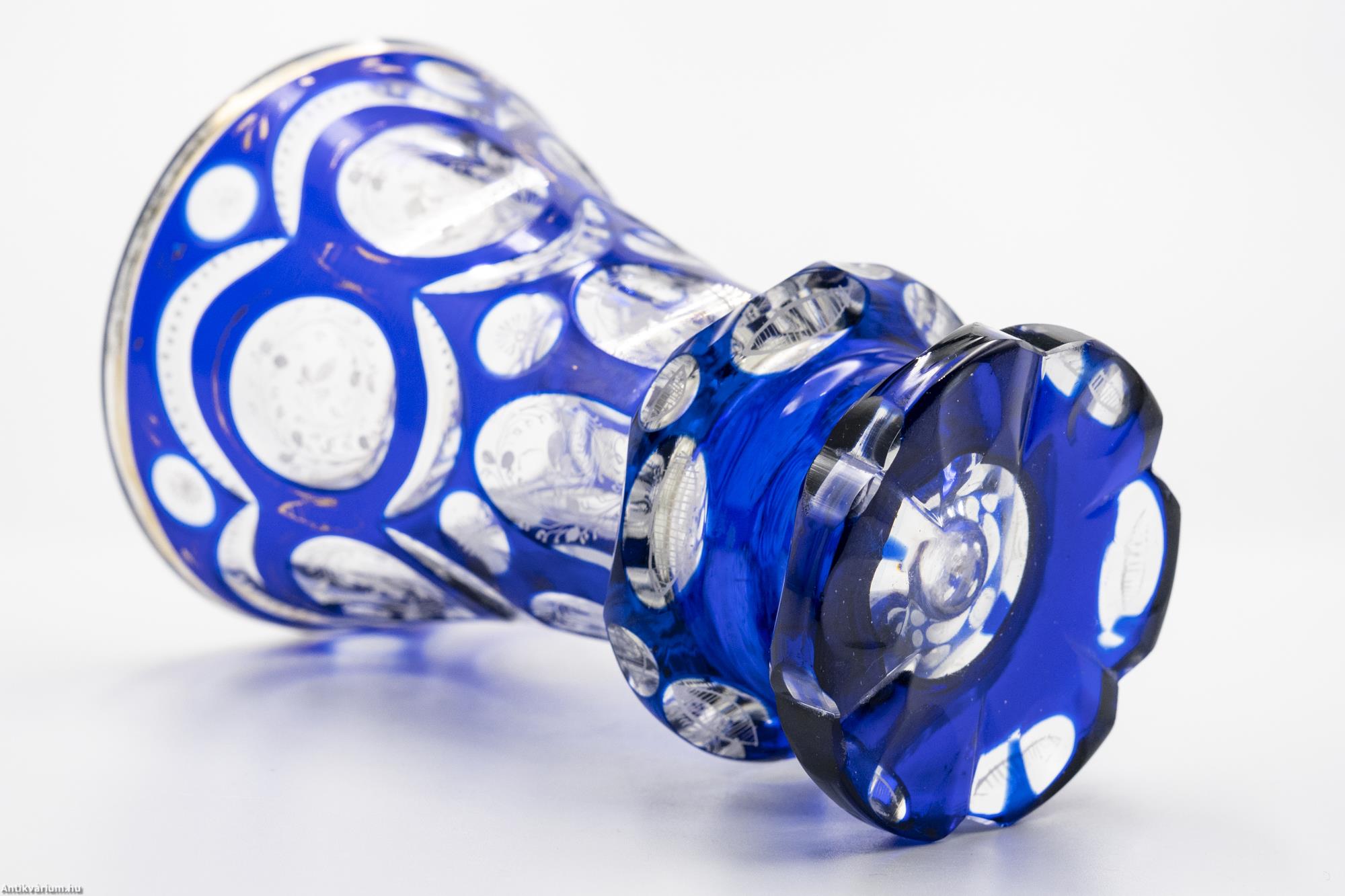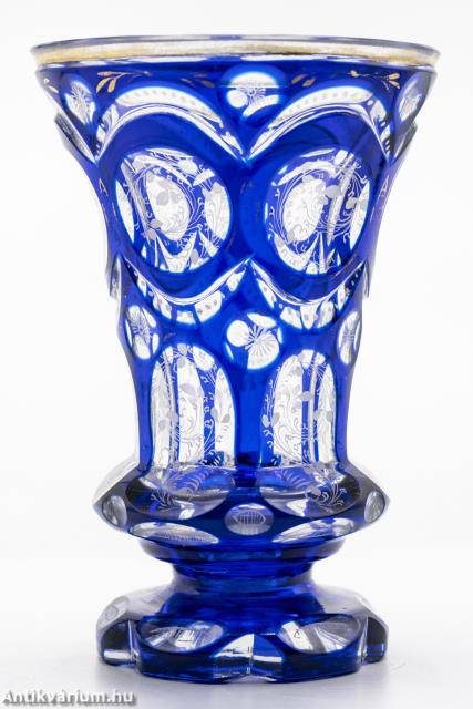 Hibátlan állapotú, fújt és kézzel formázott, finom csiszolású Haida kristály üveg pohár a 19. század második feléből. A vastagfalú, többrétegű üveg mélyen és egyenletesen vágott, kifinomult csiszolásokkal díszített, amelyek megjelennek az egész felületen. A külső üvegrétege kék színű, benne színtelen üvegrétegű kör alakú visszacsiszolások láthatóak. A szabályosan megjelenő, ismétlődő motívumnak kiváló hátteret ad az üveg pohár felfelé kiszélesedő alakja, amelynek felületén szinte megsokszorozódik az überfang csiszolás optikai képe. Az üveg pohár szára és talpa lapra csiszolt felületekből áll, amelyek tagolása az egész üveg tárgyon látható hat osztásos díszítési mintát követi. Az üveg pohár csiszolt mintázatát különleges, apró fehér virágokból álló kézzel festett motívum borítja. Talpa csiszolt. Különleges igényességgel készített jellegzetes üveg pohár a 19. század második feléből.