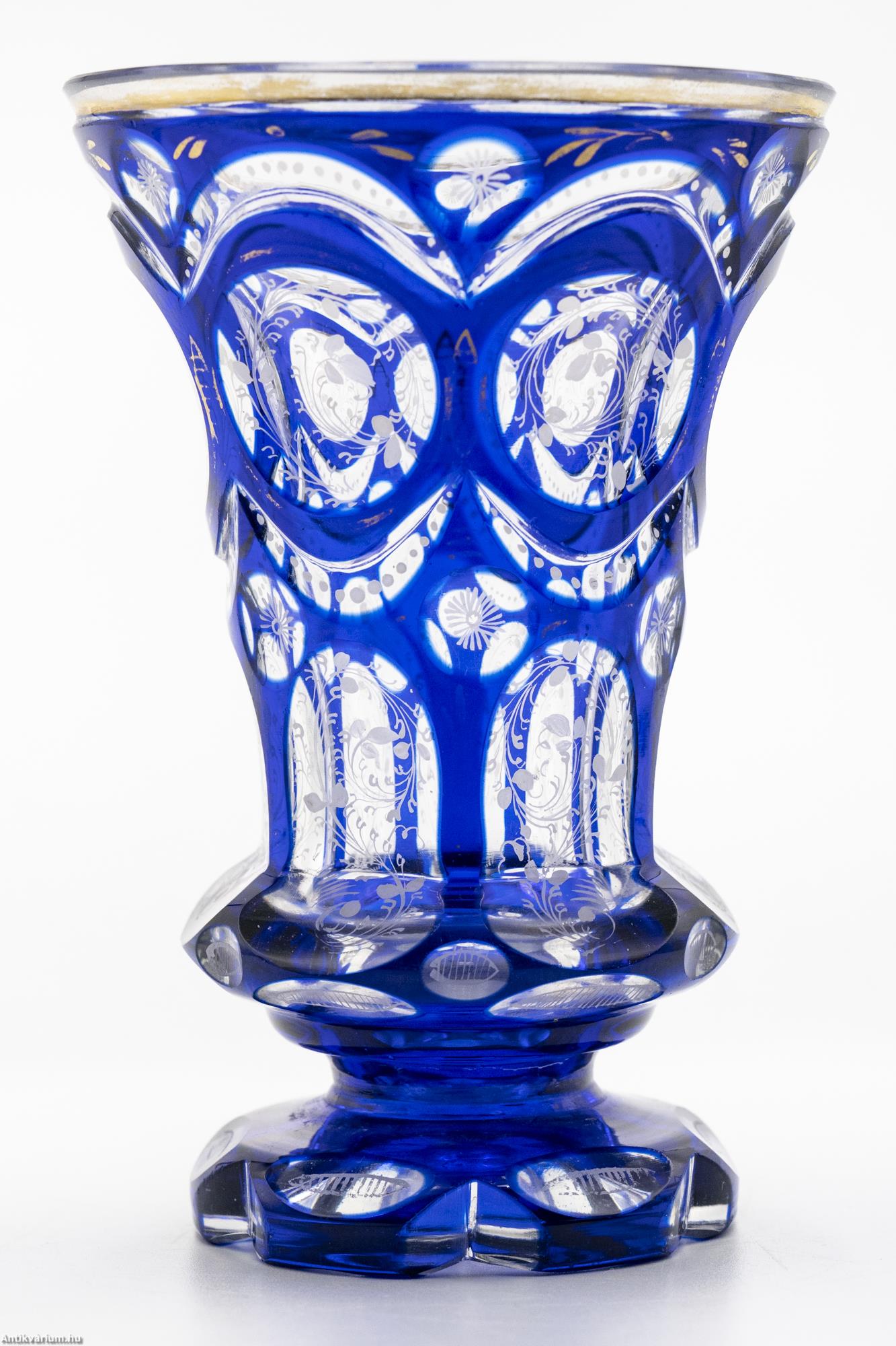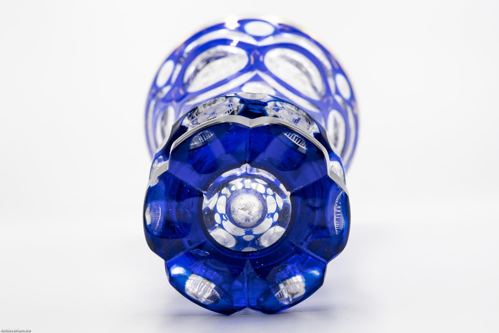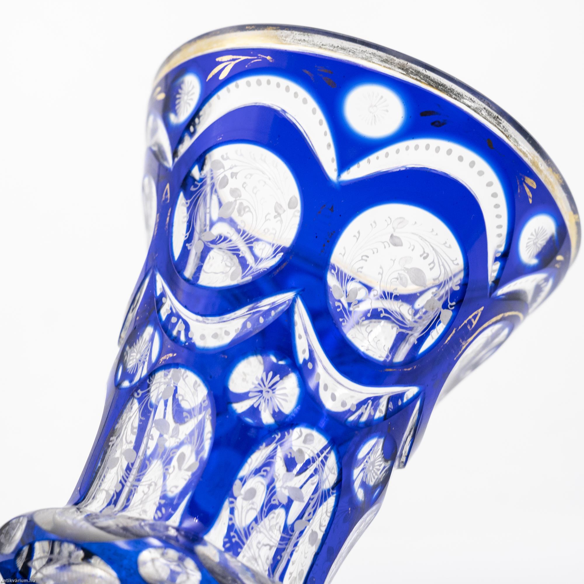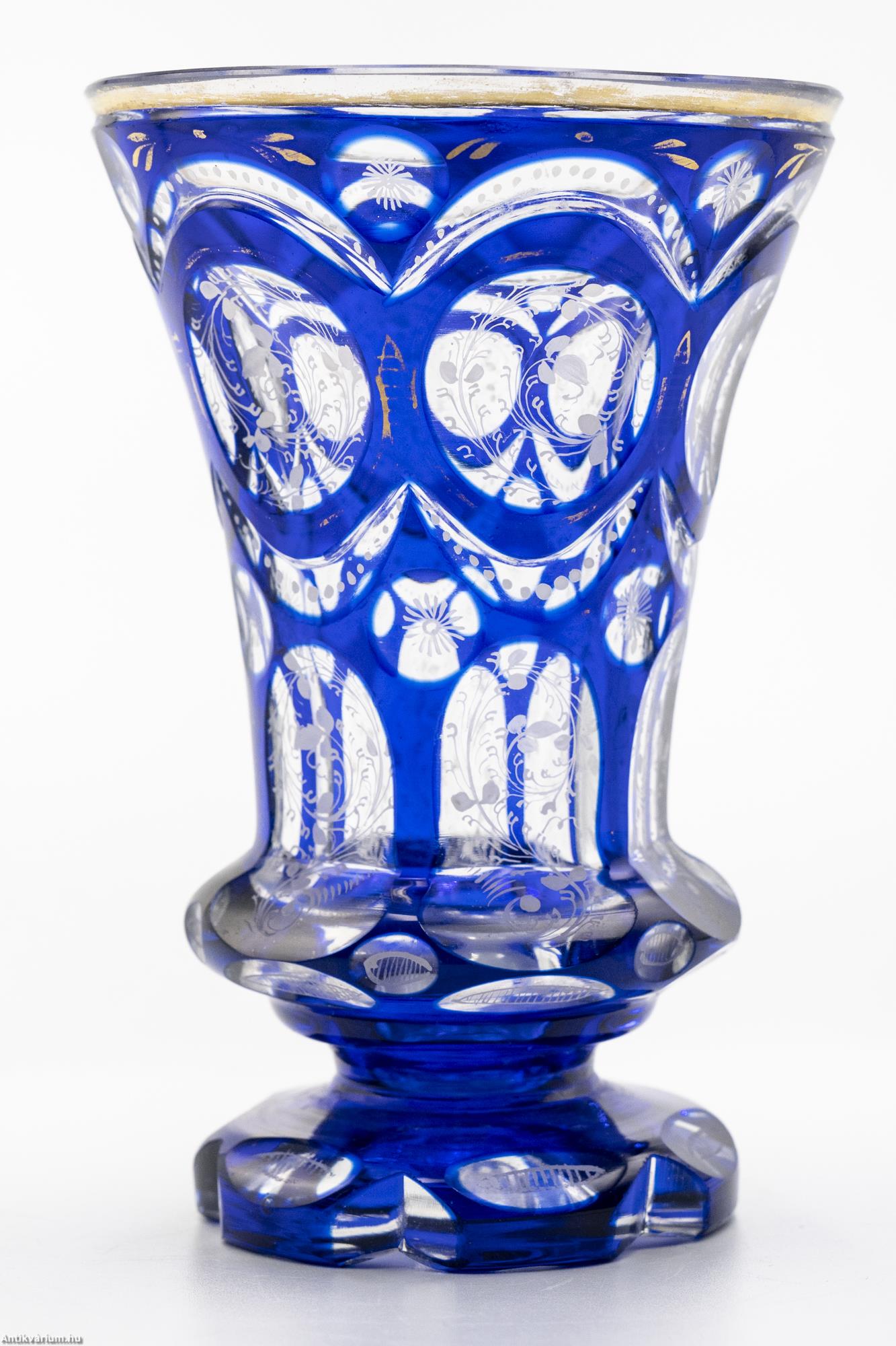 Hibátlan állapotú, fújt és kézzel formázott, finom csiszolású Haida kristály üveg pohár a 19. század második feléből. A vastagfalú, többrétegű üveg mélyen és egyenletesen vágott, kifinomult csiszolásokkal díszített, amelyek megjelennek az egész felületen. A külső üvegrétege kék színű, benne színtelen üvegrétegű kör alakú visszacsiszolások láthatóak. A szabályosan megjelenő, ismétlődő motívumnak kiváló hátteret ad az üveg pohár felfelé kiszélesedő alakja, amelynek felületén szinte megsokszorozódik az überfang csiszolás optikai képe. Az üveg pohár szára és talpa lapra csiszolt felületekből áll, amelyek tagolása az egész üveg tárgyon látható hat osztásos díszítési mintát követi. Az üveg pohár csiszolt mintázatát különleges, apró fehér virágokból álló kézzel festett motívum borítja. Talpa csiszolt. Különleges igényességgel készített jellegzetes üveg pohár a 19. század második feléből.