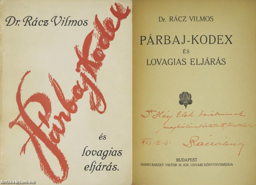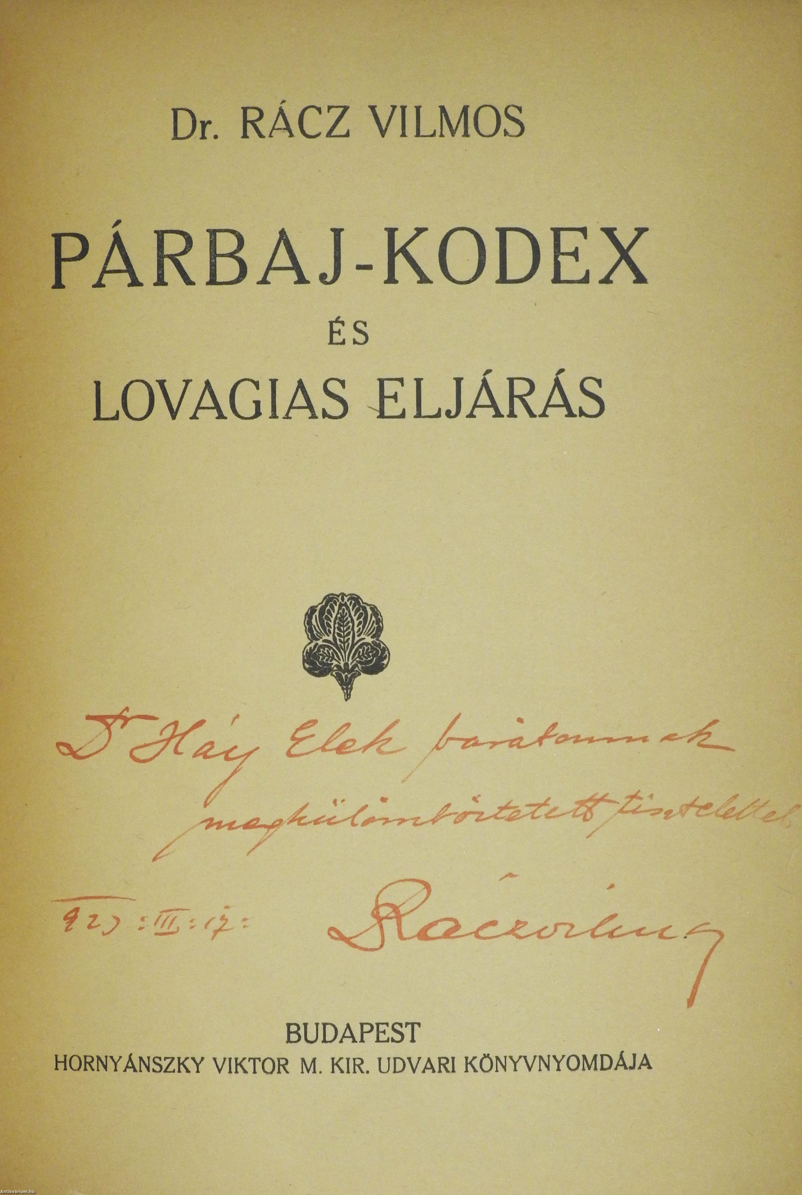 Rácz Vilmos, Dr.: Párbaj-kodex és lovagias eljárás (dedikált példány)
