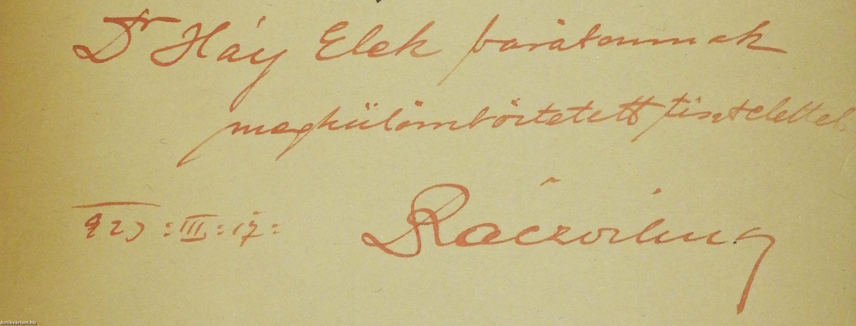 A címlapon a szerző, Rácz Vilmos tollal beírt, névre szóló dedikációja olvasható: "Dr. Háy Elek barátomnak megkülönböztetett tisztelettel Rácz Vilmos 925: III: 17:"
