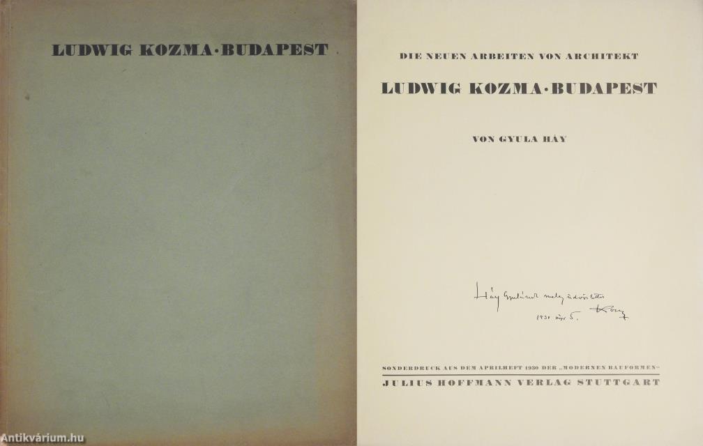 Kozma Lajos által dedikált példány. Die neuen Arbeiten von Architekt Ludwig Kozma - Budapest. Von Gyula Háy. Sonderdruck aus dem Aprilheft 1930 der "Modernen Bauformen."/ Kozma Lajos építész új munkái - Budapest. Írta: Háy Gyula. Különlenyomat a "Moderne Bauformen" 1930 áprilisi számából.