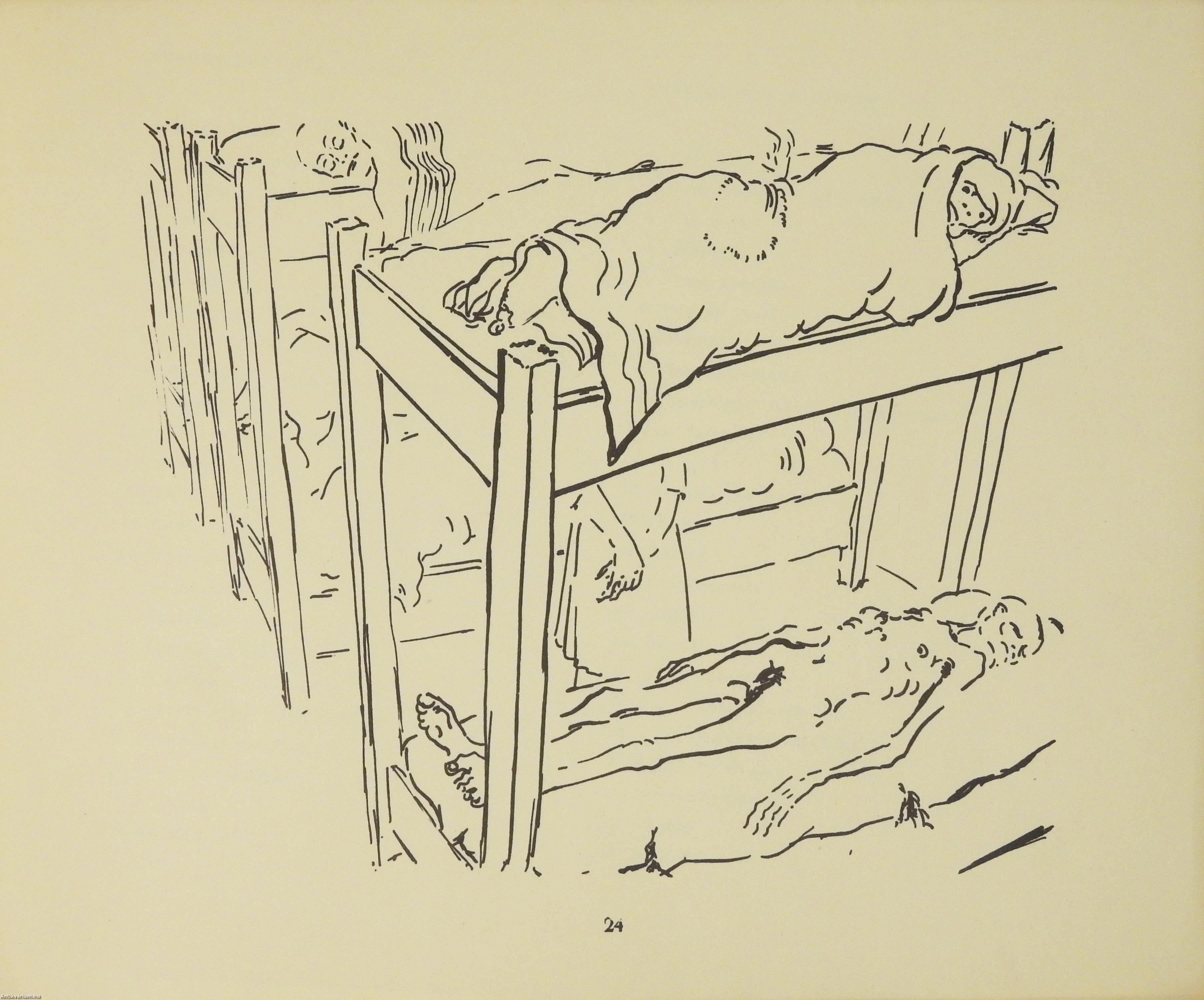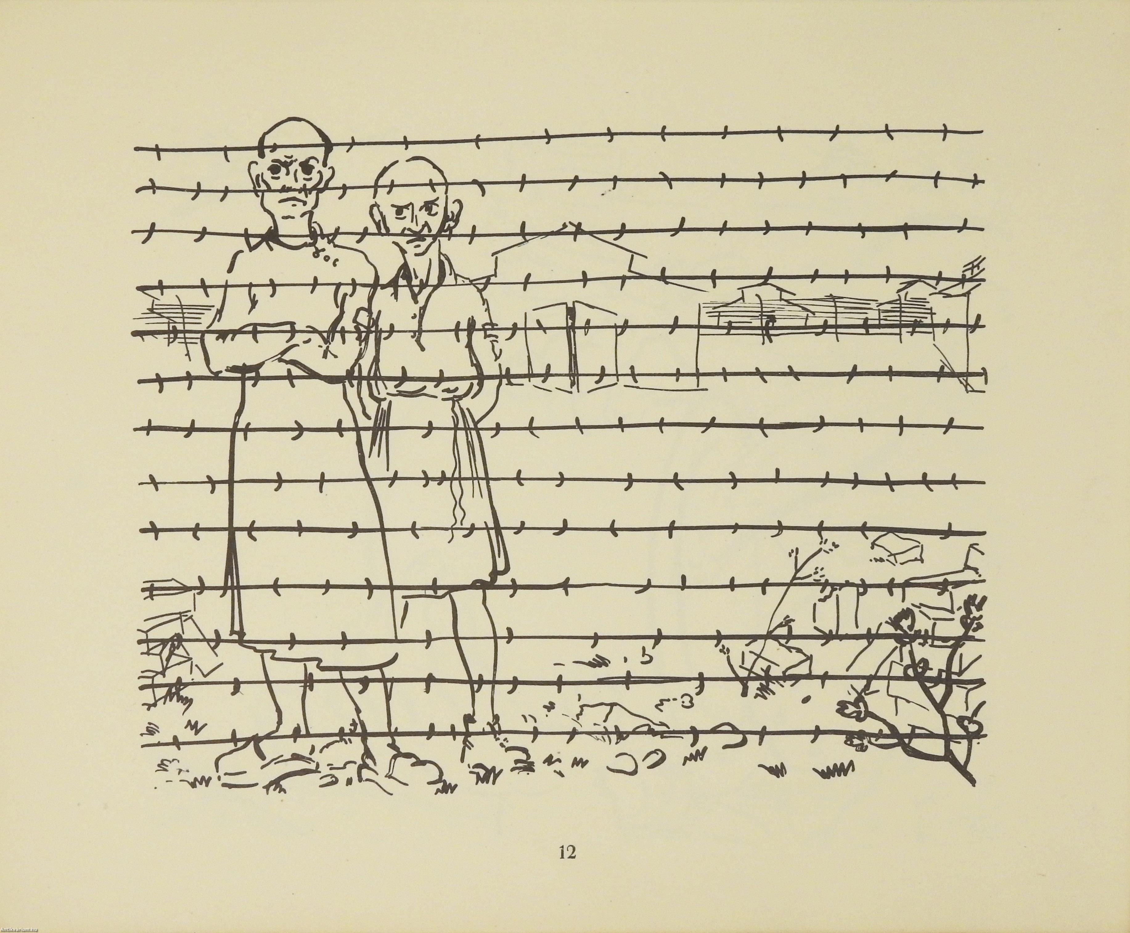 Első kiadás. Auschwitz: Női tábor. / Auschwitz: Women's Camp. Lukács Ágnes rajzsorozata. Lukács Ágnes fekete-fehér rajzai 24 különálló, számozott képtáblán. A gyűjtemény a rajzok mellett – szintén különálló lapok formájában – a kiadó előszavát és a művész önéletrajzát is tartalmazza, mindkettőt két nyelven (magyar-angol). Nyomatott Huschit Rezsőnél, Budapesten. Kiadói papírmappában lévő példány feliratos, Lukács Ágnes rajzával illusztrált mappafedéllel, tiszta képtáblákkal, hiánytalan állapotban. Lukács Ágnes (1920-2016) festőművész, grafikus, pedagógus, Lukács Gyula festőművész lánya. Már fiatalon a művészet felé fordult, gyerekkorától jelentek meg rajzai különféle folyóiratokban. Később a Képzőművészeti Főiskolán Szőnyi István tanítványa volt. 1944-ben rajz és művészettörténet szakos tanári oklevelet szerzett. Ugyanebben az évben az auschwitzi koncentrációs táborba deportálták, majd Németországba hurcolták, ahonnan 1945 tavaszán térhetett haza. Az elszenvedett megpróbáltatásokról készítette Auschwitz: Női tábor című híres rajzsorozatát, amely 1946-ban jelent meg. A háború után rajztanárként dolgozott, valamint műveivel rendszeresen részt vett kiállításokon is.