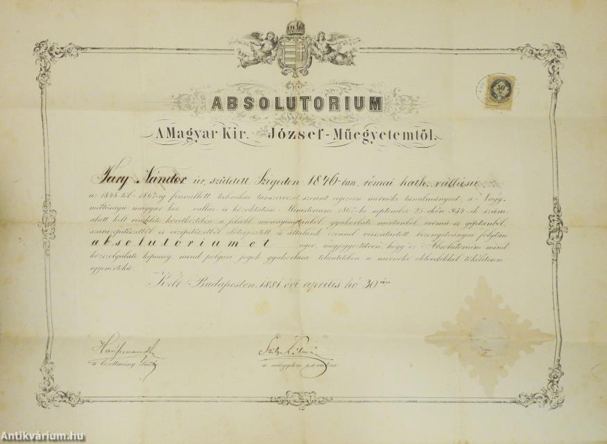 A Magyar Kir. József-Műegyetem által Tary Nándor részére kiállított absolutorium elnyeréséről szóló hivatalos okirat, melyet aláírásával hitelesített