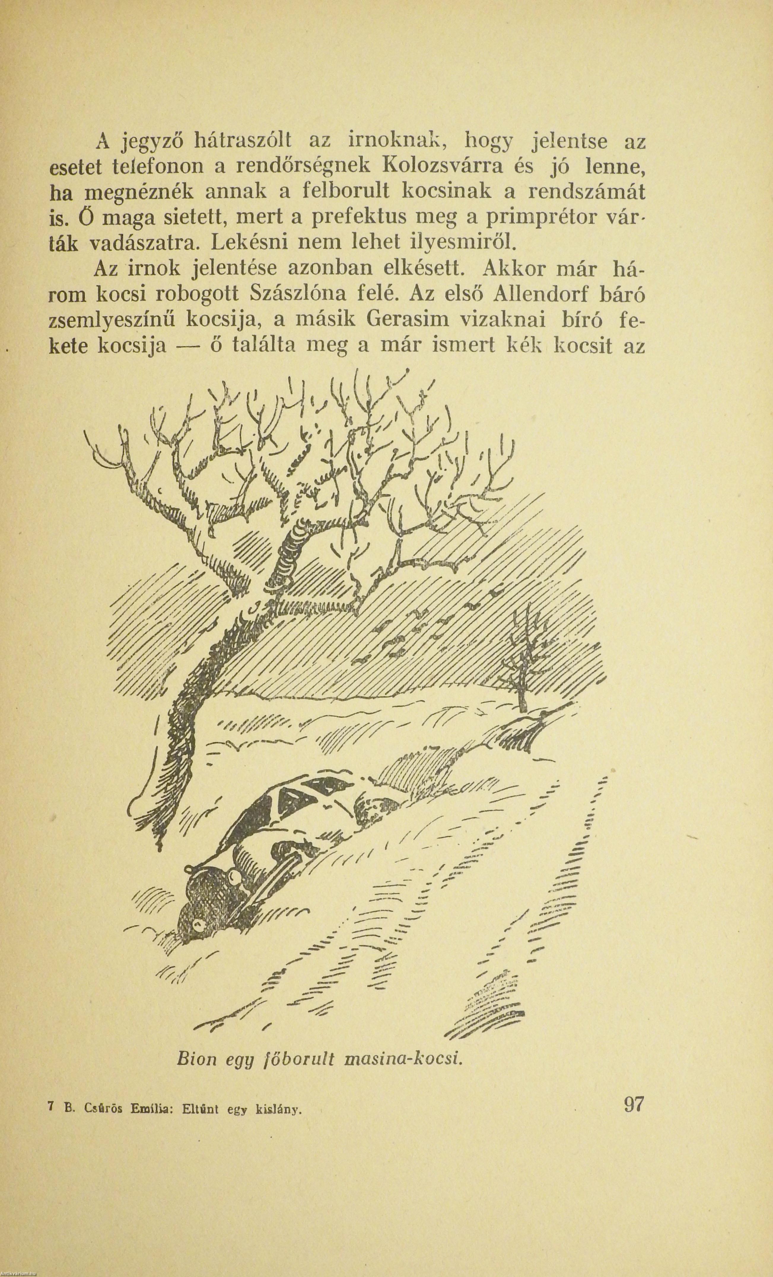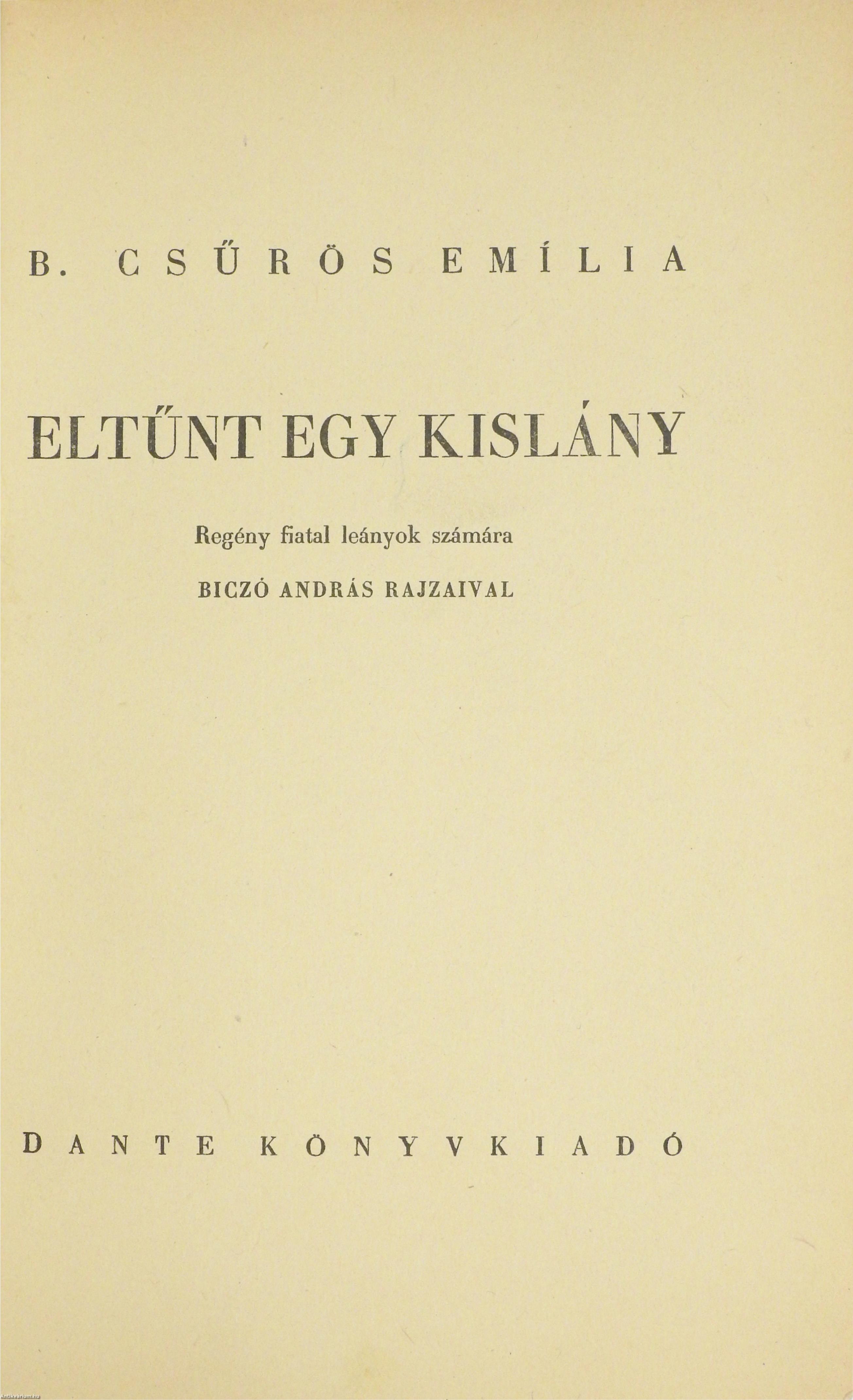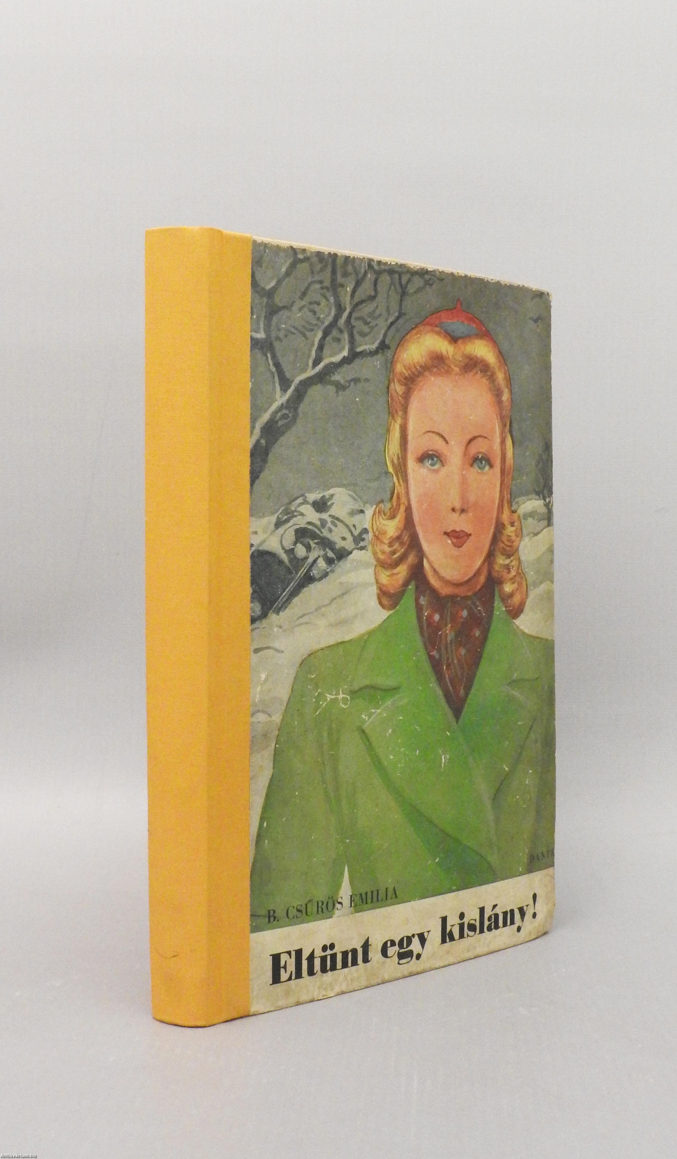 Első kiadás. Eltünt egy kislány! Regény fiatal leányok számára. Írta: B. Csűrös Emília. Biczó András szöveg közti, fekete-fehér rajzaival és egy fekete-fehér, feliratozott képtáblával illusztrált kötet. Nyomatott Krakauernél. Kiadói félvászon kötésben lévő példány, feliratozott, színes illusztrációval ellátott címfedéllel, feliratozatlan, könyvkötő által pótolt vászon könyvgerinccel, új előzéklapokkal, hiánytalan állapotban. A szerző, Csűrös Emília /Bérczes Istvánné/ (Dálya, 1897. október 5. – Budapest, 1970. szeptember 9.) ifjúsági író. A nagyenyedi református tanítóképzőben végzett. Benedek Elek Cimbora c. gyermeklapjának, Kolozsváron az Ellenzéknek és az Újságnak, majd Nagyváradon az Erdélyi Lapoknak volt a munkatársa. Írásai a Hírnök, a Jóbarát és az Új Cimbora hasábjain is megjelentek. Gyermekszíndarabjai és köszöntői, dalos játékai, ifjúsági regényei a nevelő célzatot a honszeretettel fűzték egybe, valamint szívesen újította fel az erdélyi hagyományokat.