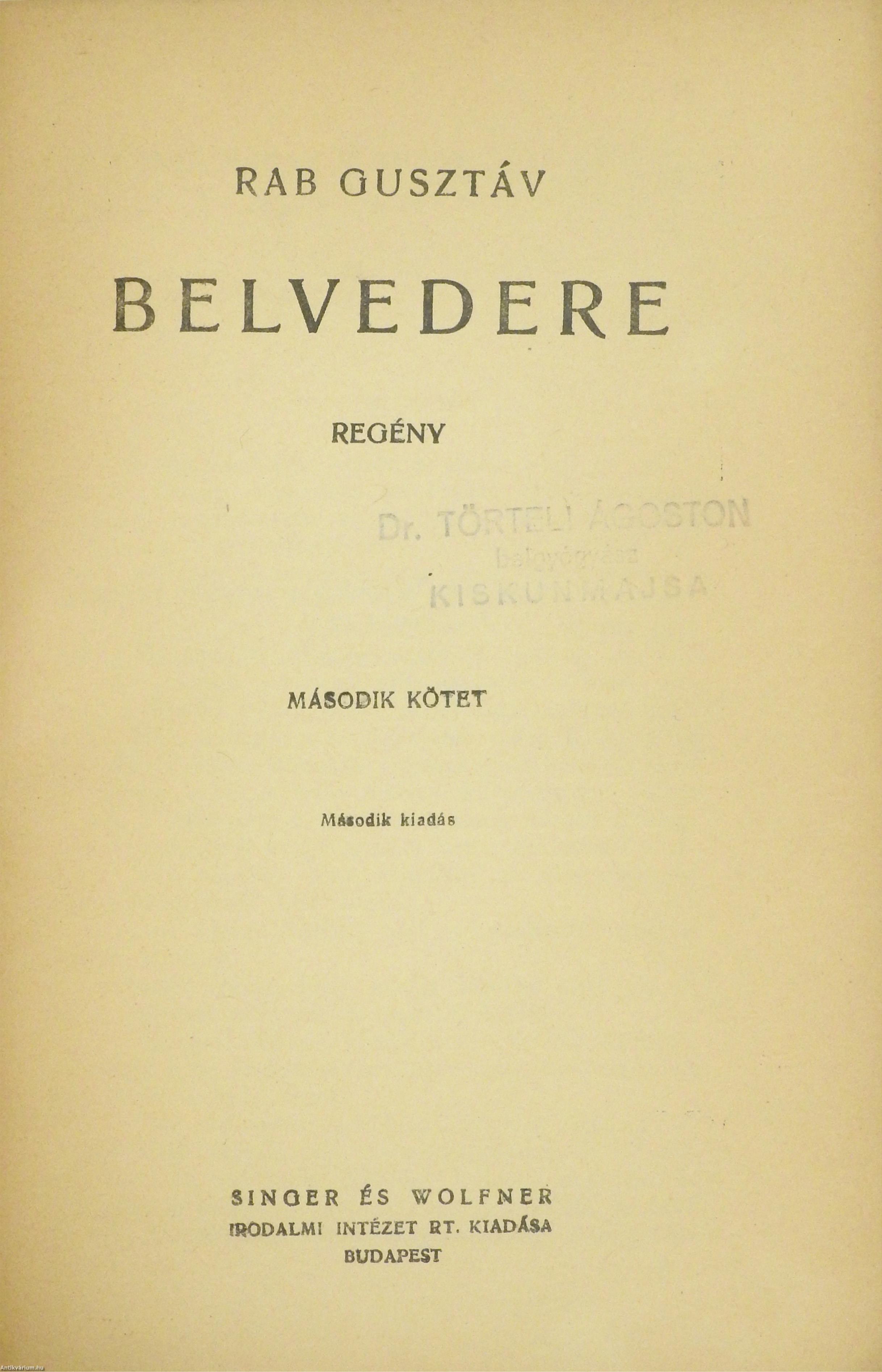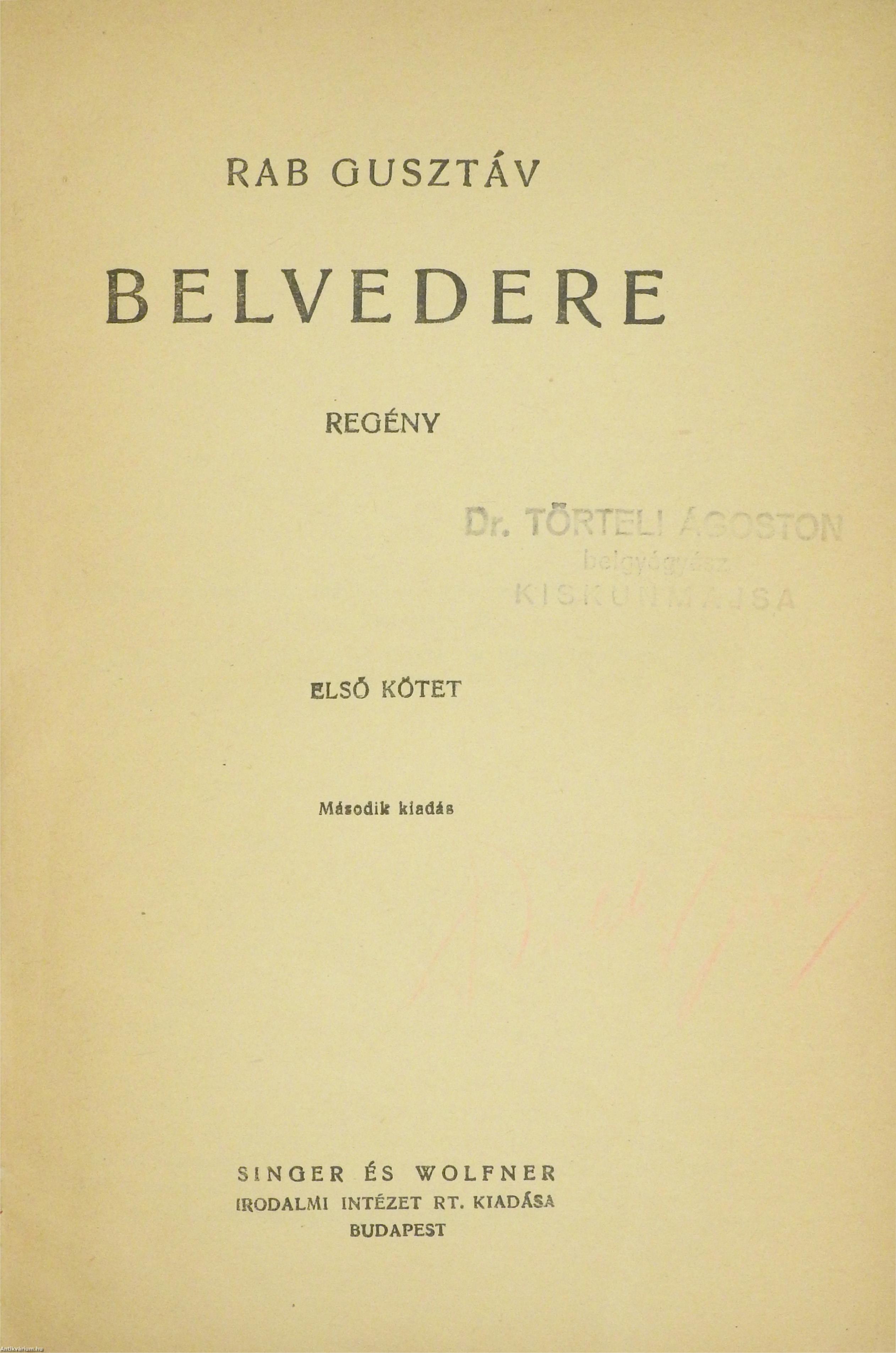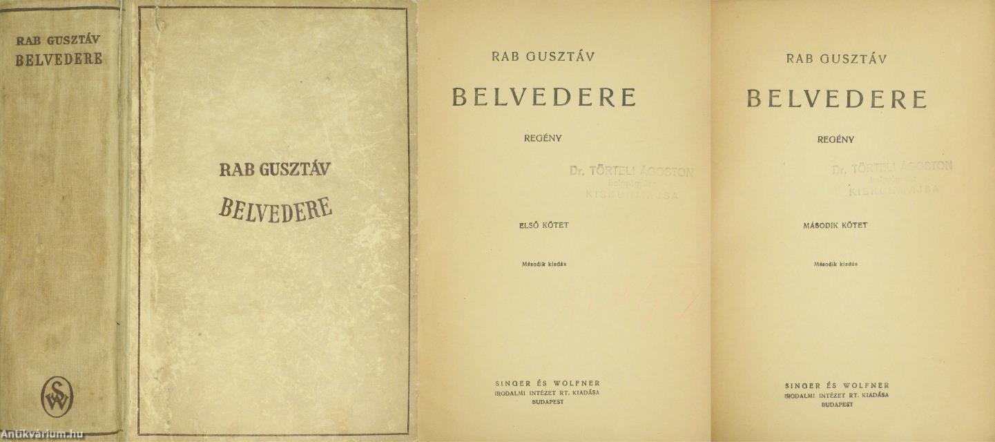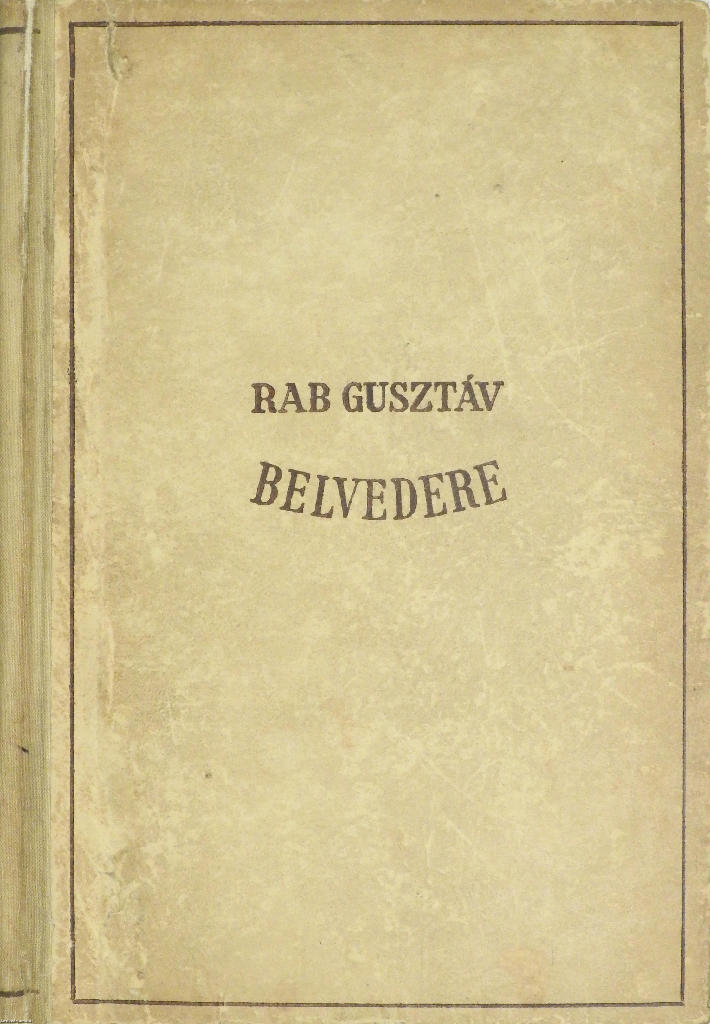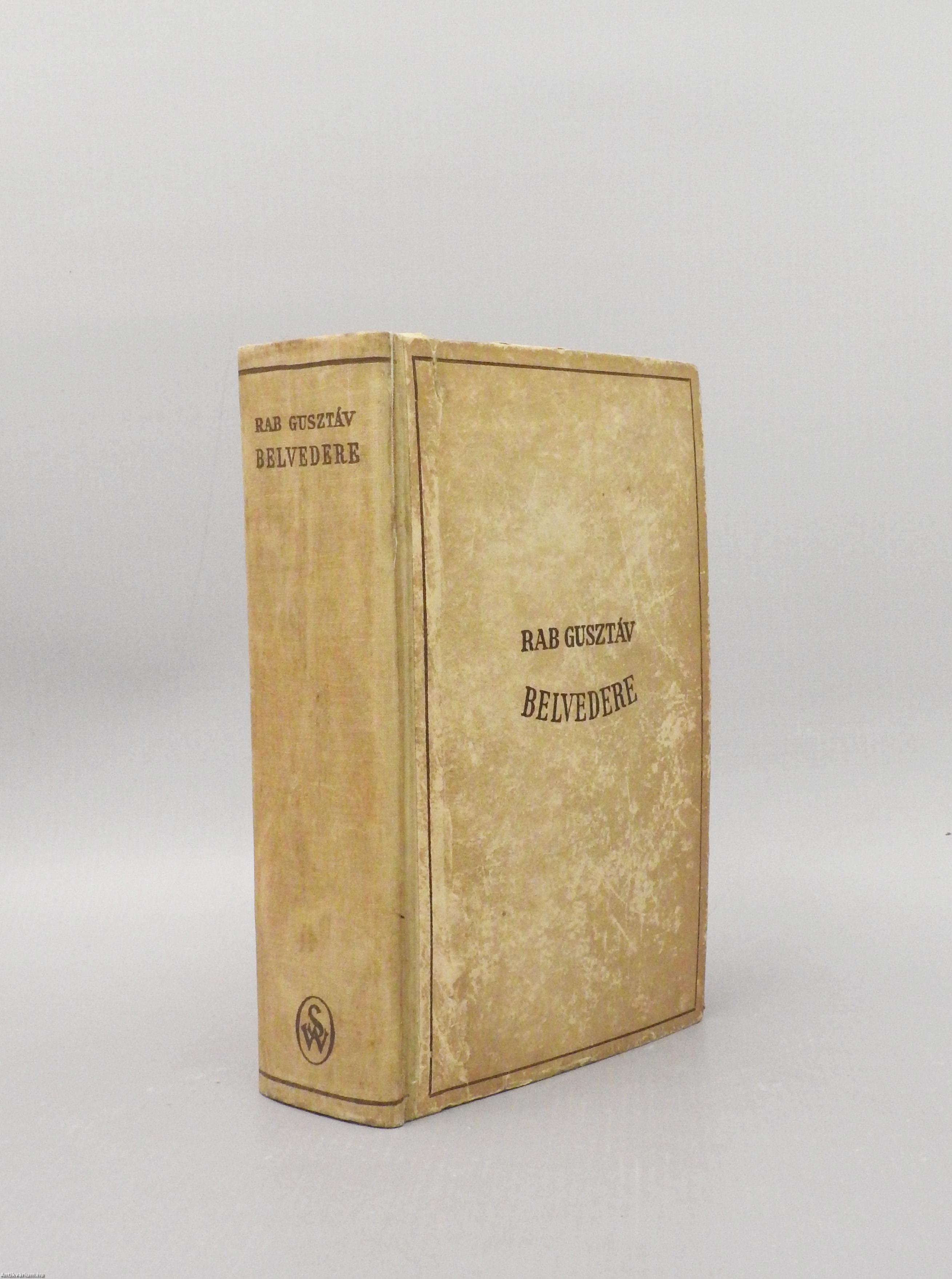 Belvedere I-II. (két kötet egy könyvben) Írta: Rab Gusztáv. Második kiadás. Könyvhirdetéssel kiegészített kötet. A címlapokon tulajdonosi bélyegzés, az egyiken tulajdonosi bejegyzés látható. Nyomatott a Krakauernél Budapesten. Kiadói félvászon kötésben lévő példány feliratozott, keretes címfedéllel, feliratos, javított könyvgerinccel, feliratozatlan hátlappal, új előzéklapokkal, hiánytalan állapotban. A szerző, Rab Gusztáv (Sárospatak, 1901. május 14. – Dreux, 1963. január 4.) író, újságíró. Jogi tanulmányait abbahagyva először a Világ, majd az Est lapok munkatársaként tevékenykedett. 1939-től a Pest c. kormánylapnál volt vezércikkíró, azt követően rovatvezető. 1945 után eltiltották két évre az újságírástól Belvedere c. regényének irredenta részletei és a Pestnél vállalt szerepe eredményeképp. Később földmérőként dolgozott a Keleti-főcsatorna építésénél, majd 1958-ban elköltözött Franciaországba. Ezután az Amerika Hangja rádióadó kulturális munkatársaként munkálkodott. Külföldön is folytatta munkásságát, riportokat, elbeszéléseket és regényeket írt.