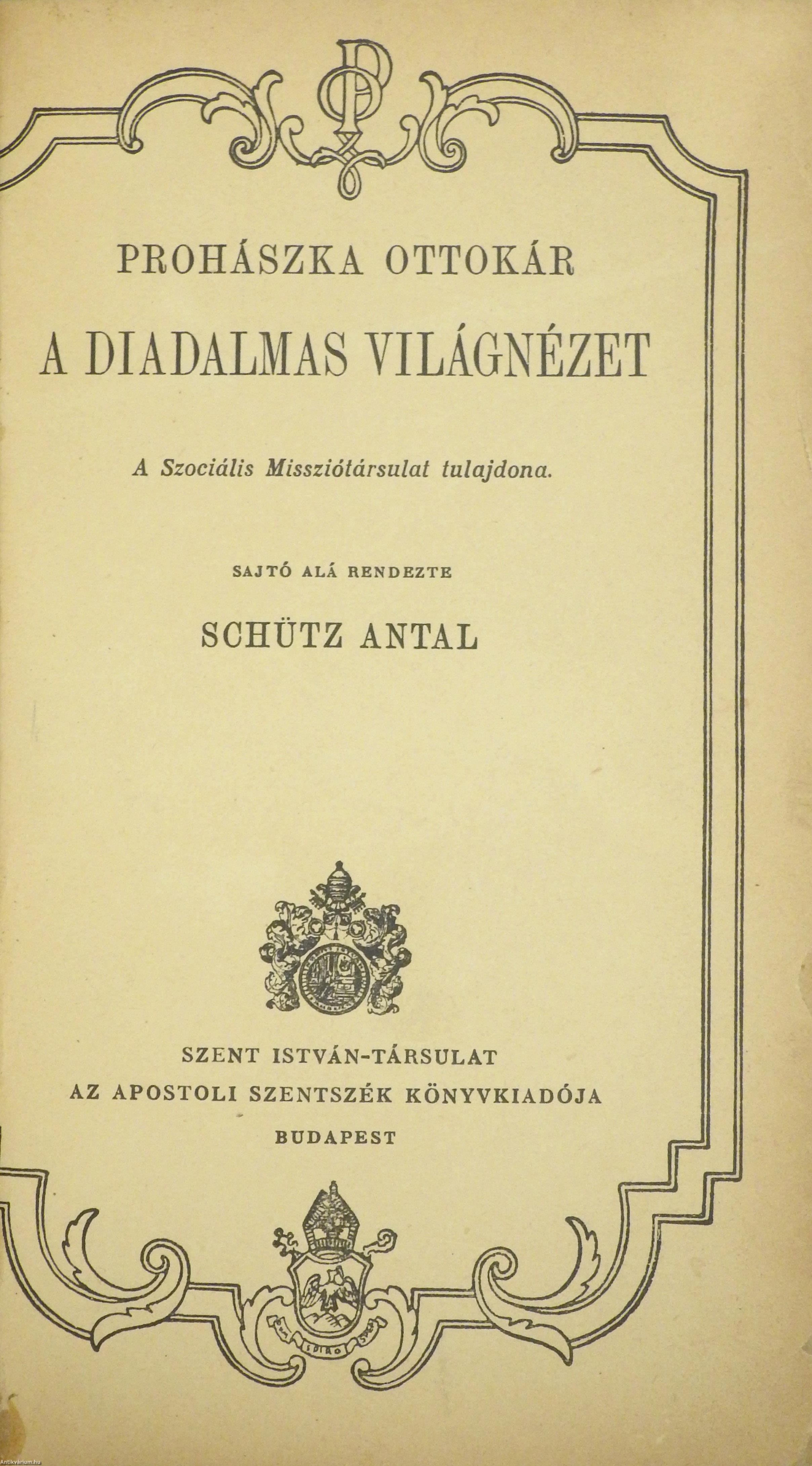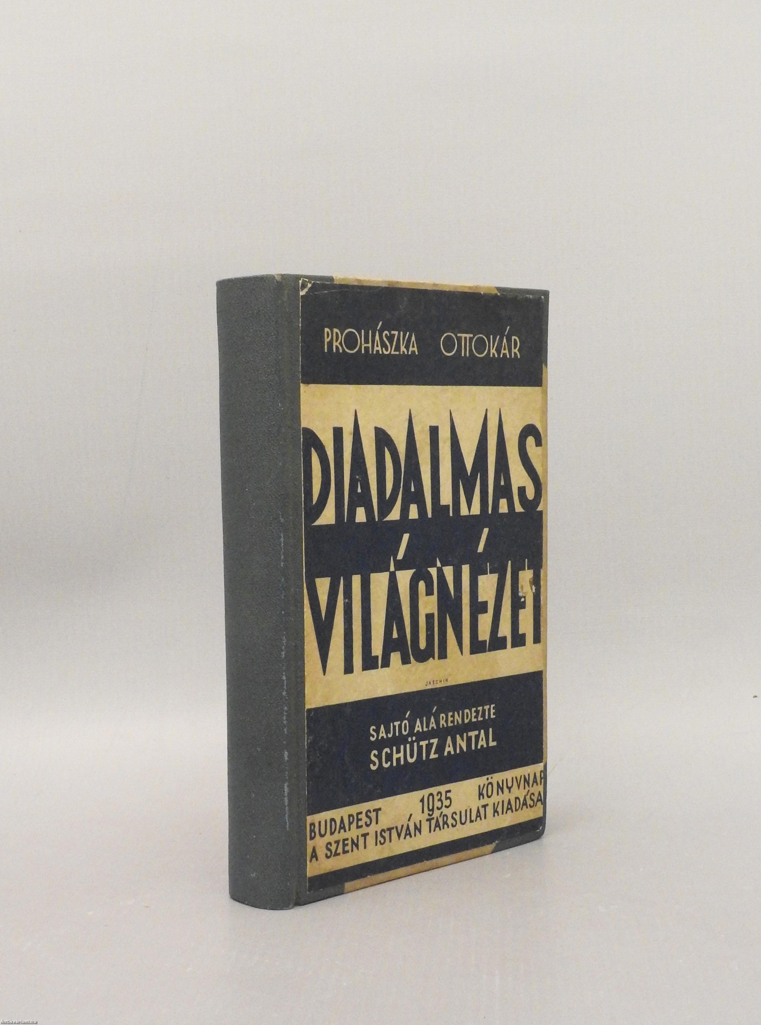 A Diadalmas Világnézet. Írta: Prohászka Ottokár. Sajtó alá rendezte: Schütz Antal. Hatodik kiadás. A Szociális Missziótársulat tulajdona. Bevezetéssel és függelékkel kiegészített kötet. A kiadói címfedelet Jaschik Álmos tervezte. Nyomtatta a Stephaneum Nyomda és Könyvkiadó Rt. Budapesten. Könyvkötői félvászon kötésben lévő példány, a címfedélre kasírozott, eredeti, feliratozott, kiadói címfedéllel, feliratozatlan könyvgerinccel és hátlappal, néhány oldalon ceruzás jelölésekkel és aláhúzásokkal, hiánytalan állapotban. A szerző, Prohászka Ottokár (Nyitra, 1858. október 10. – Budapest, 1927. április 2.) római katolikus pap, egyházi író, politikus, a székesfehérvári egyházmegye püspöke (1905-27). Prohászka a 20. század eleji magyar egyháztörténet és politika egyik legnagyobb hatású és legvitatottabb személyisége. Egyrészt a hazai keresztényszocializmus és a liberális, az egyház megújulását, demokratizálódását sürgető mozgalmak legfőbb hangadója volt; másrészről élesen bírálta a modern polgári gondolkodókat és új kulturális áramlatokat. Politikai nacionalizmusa a korban egyre nagyobb teret nyerő antiszemitizmustól sem volt mentes, támogatója volt az 1920-as numerus clausus törvénynek.