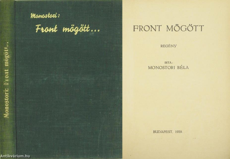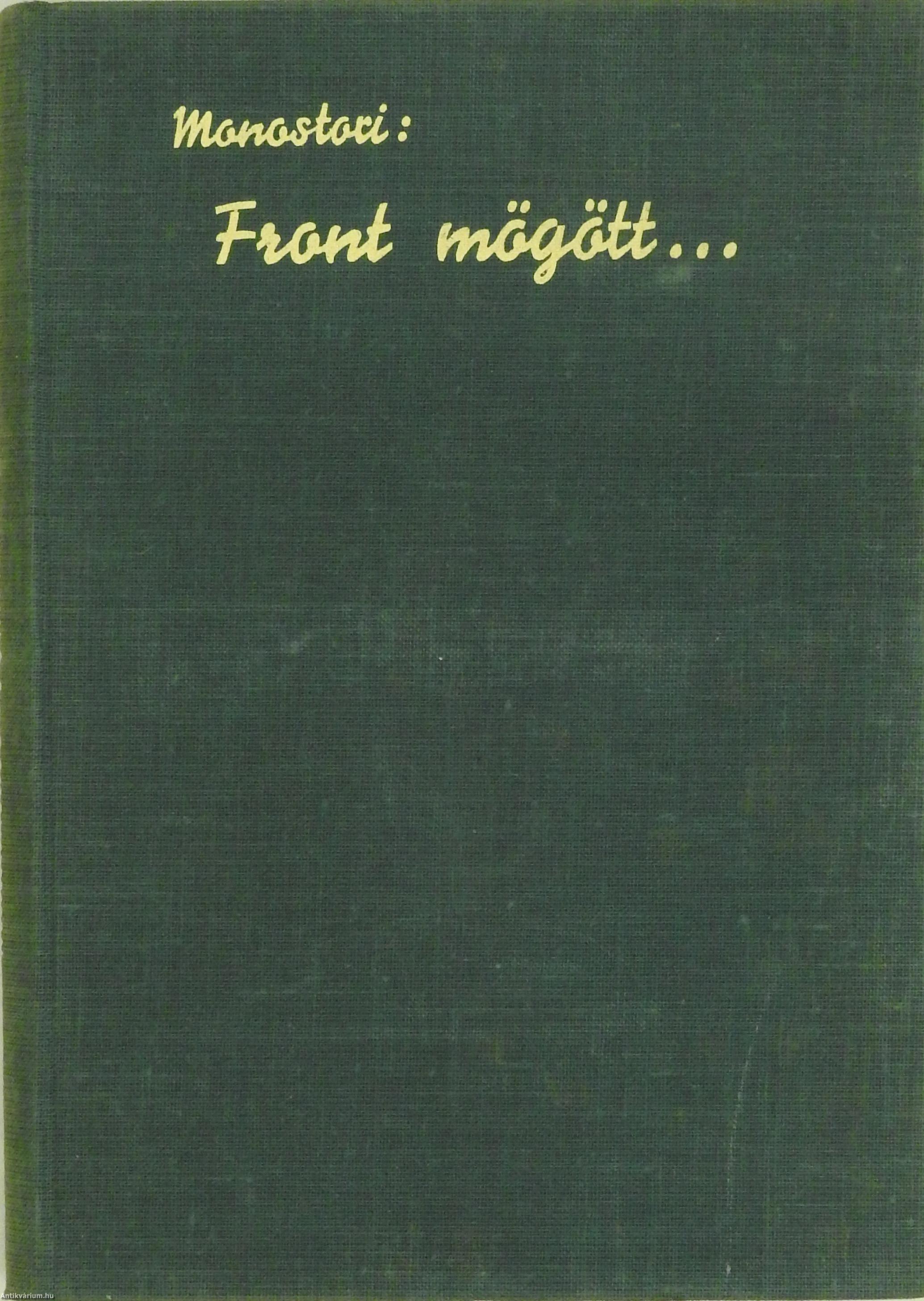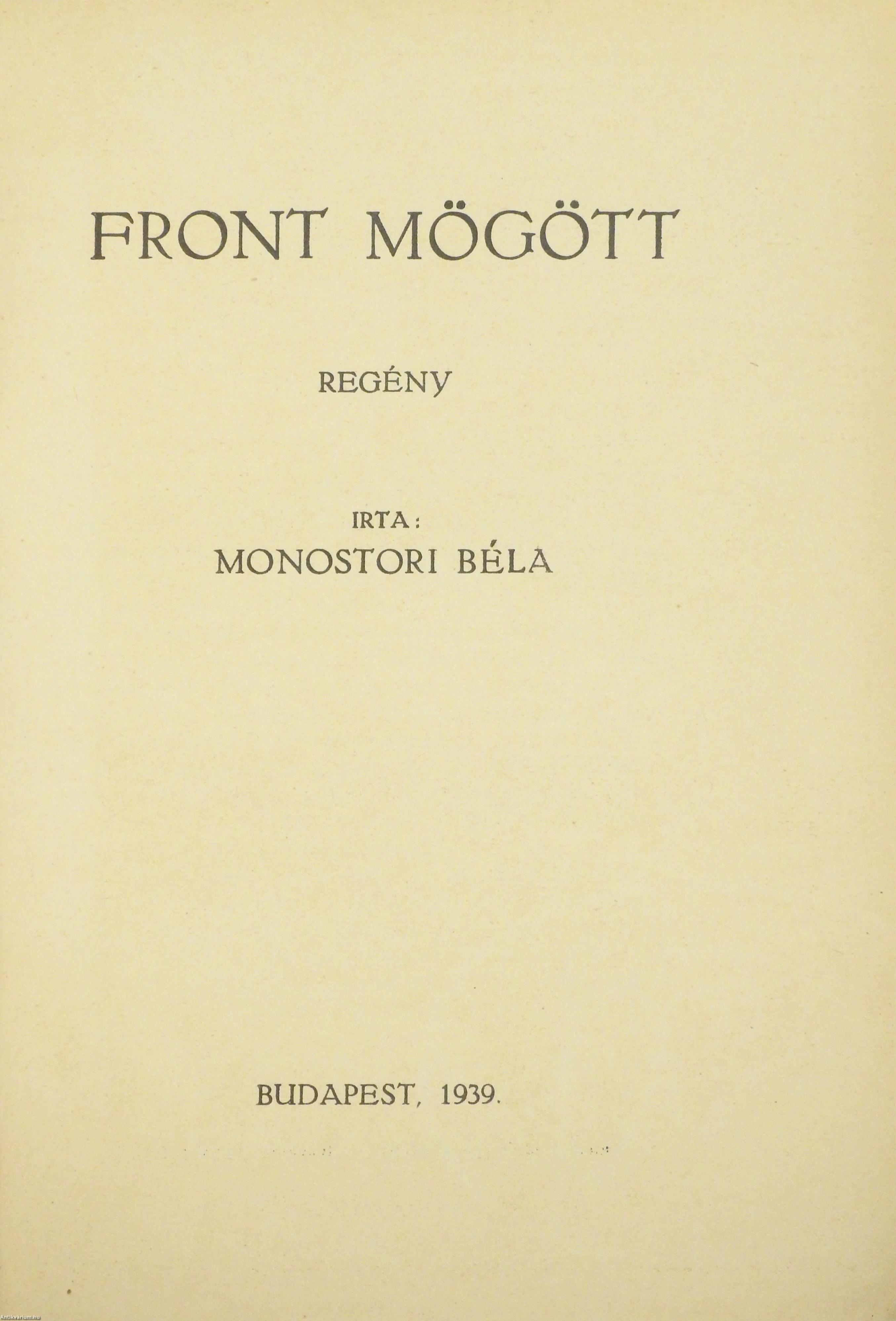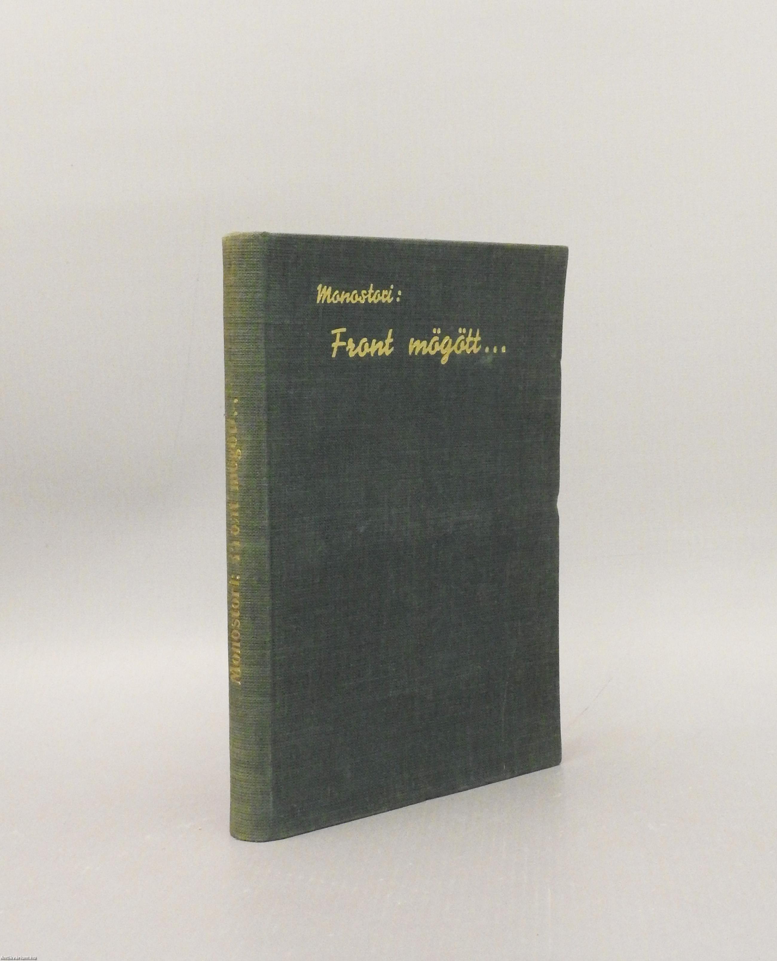 Első kiadás. Front mögött. Regény. Írta: Monostori Béla. A címfedél belső oldalán tollal írt tulajdonosi bejegyzés látható. A könyvet az "Élet" Irodalmi és Nyomda Rt. nyomtatta Budapesten. Kiadói egészvászon kötésben lévő példány aranyozott feliratozású címfedéllel és könyvgerinccel, kiadói előzéklapokkal, feliratozatlan hátlappal, hiánytalan, jó állapotban. "Monostori Béla regénye a Front mögött jó regény, cselekményekben gazdag és jól mutatja meg a »Front mögötti« világot" - írja Kosáryné Réz Lola író, műfordító.