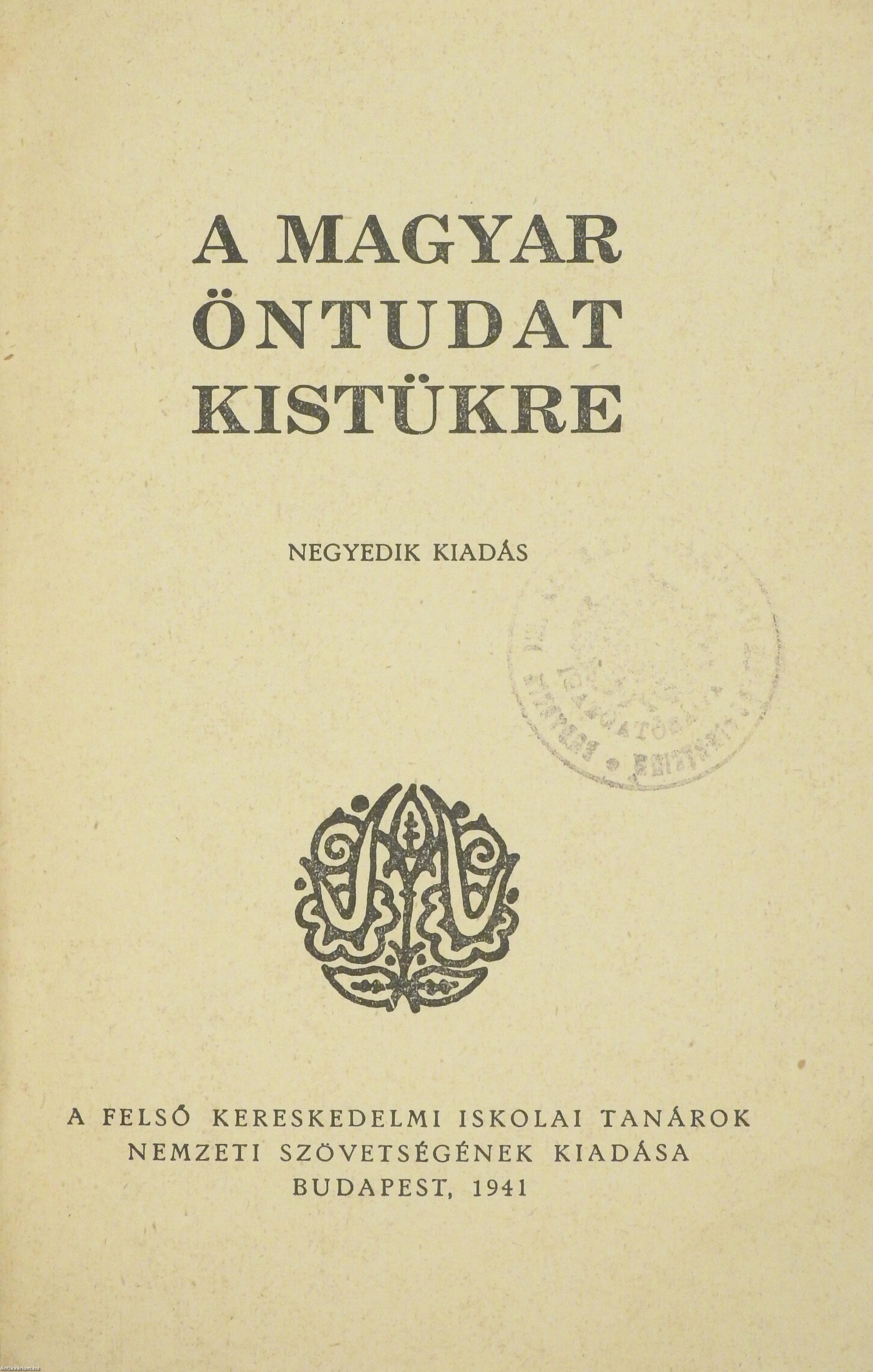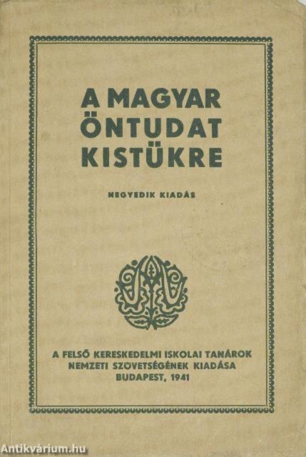 A magyar öntudat kistükre. Negyedik kiadás. A címfedélen és a címlapon tulajdonosi bélyegzés látható. Előszóval, tartalomjegyzékkel és a magyarságtudomány irodalmának jegyzékével kiegészített kötet. Nyomtatta a Királyi Magyar Egyetemi Nyomda, Budapesten. Kiadói varrott papírkötésben lévő példány, feliratozott, díszes címfedéllel, feliratos könyvgerinccel, hátlapon a nyomda feltüntetésével, néhány oldalon ceruzás aláhúzással és jelöléssel, hiánytalan állapotban. "...Nemzetünk szellemi és anyagi értékeit, egyéni sajátosságait, az emberiség egyetemének tett szolgálatainkat, mai helyzetünket és jövő feladatainkat rövid, összefoglaló áttekintésben adja meg e munka. A mindkét nembeli érettebb középiskolai ifjúság számára készült, kiegészítője a tankönyveknek s foglalata mindazoknak az ismereteknek, melyeket egy öntudatos magyar ifjúnak hazájáról, nemzetéről tudnia kell, hogy magyar voltát hivatásnak és büszkeségnek tekintse..." - (Kereskedelmi Szakoktatás, 1935. június 30./42. évfolyam/10. szám).