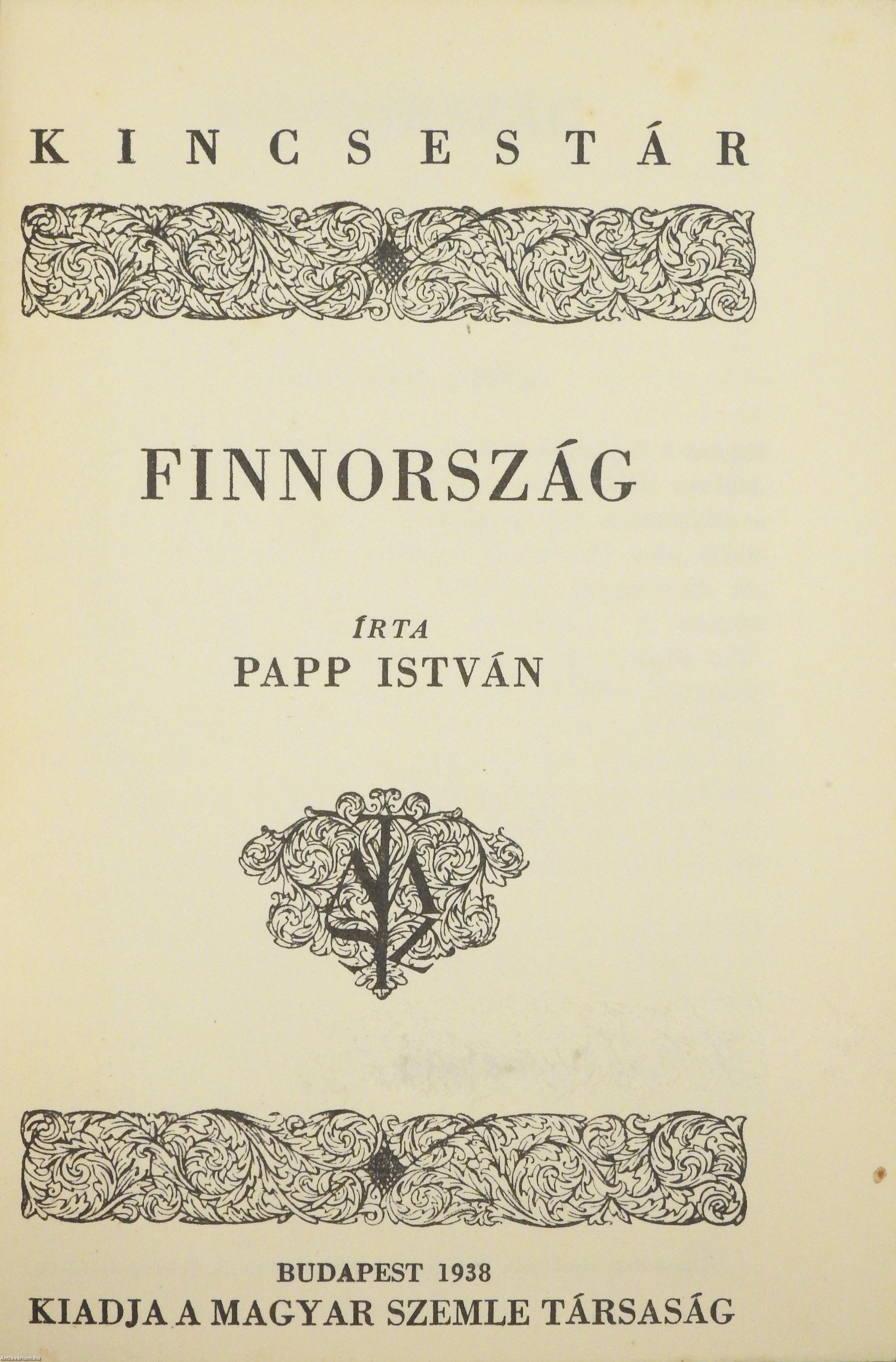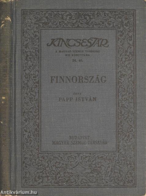 Első kiadás. Kincsestár a Magyar Szemle Társaság kis könyvtára. No.: 24. sz. Finnország. Írta: Papp István. Irodalom- és tartalomjegyzékkel kiegészített kötet. Nyomtatta a Tipográfiai Műintézet, Budapesten. Kiadói egészvászon kötésben lévő példány, feliratozott, díszes keretezéssel ellátott címfedéllel, feliratos könyvgerinccel, feliratozatlan hátlappal, a sorozatban szereplő könyvek jegyzékével ellátott, kiadói előzéklapokkal, hiánytalan állapotban. A szerző, Papp István (Kisvárda, 1901. szeptember 12. – Debrecen, 1972. április 11.) nyelvész, egyetemi tanár, a nyelvtudományok doktora. Az általános és magyar nyelvészet, valamint a finn-ugrisztika területén fejtett ki tudományos munkásságot. Érdeklődésének középpontjában a mondattan állt. Az egyoldalú logikai felfogással szemben az érzelmi és stilisztikai szempontokat is figyelembe vevő mondatszerkezetet igyekezett kidolgozni.