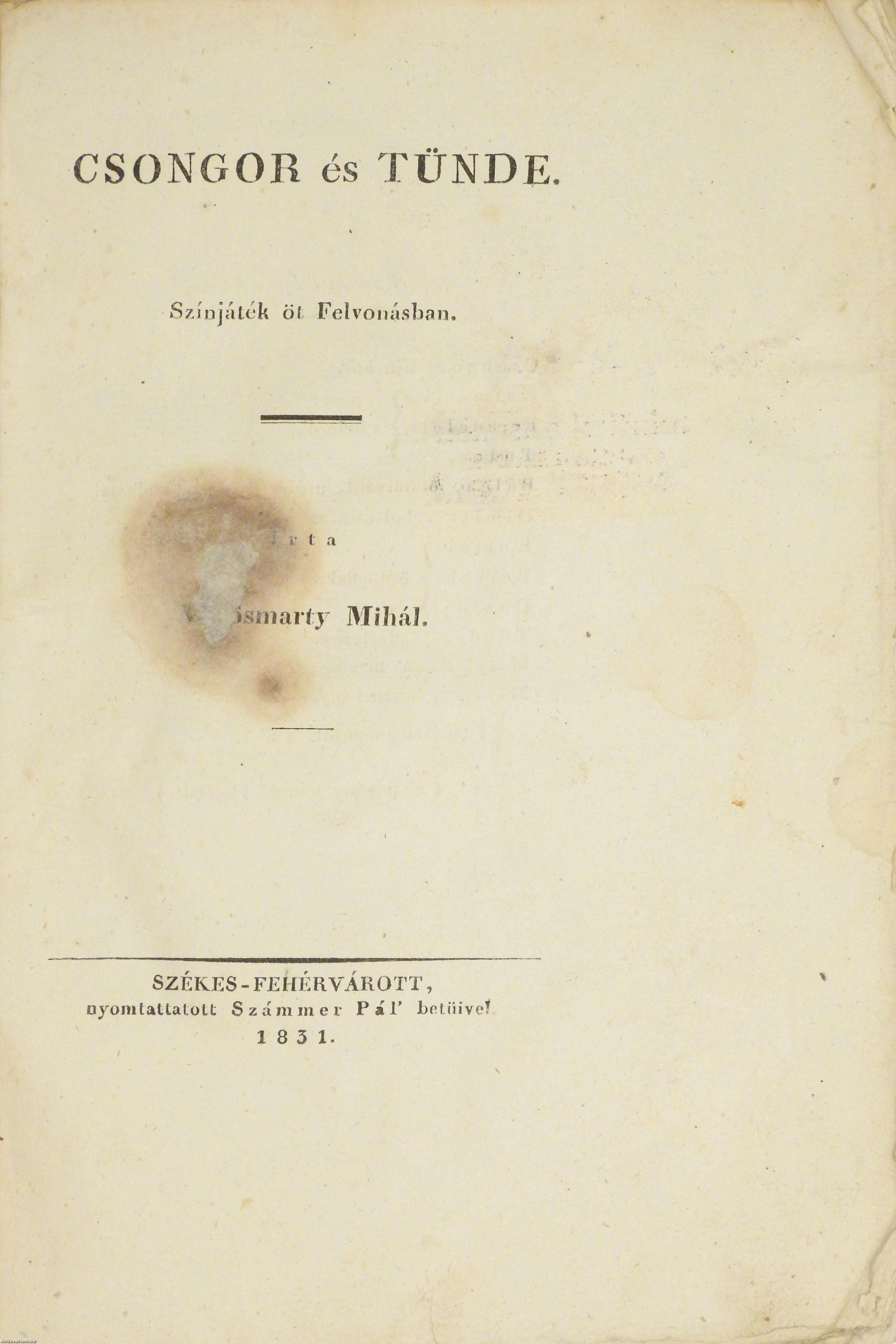 (1.) Csongor és Tünde. Színjáték öt Felvonásban. Irta Vörösmarty Mihál. Székes-Fehérvárott nyomtattatott Számmer Pál betüivel. 1831.