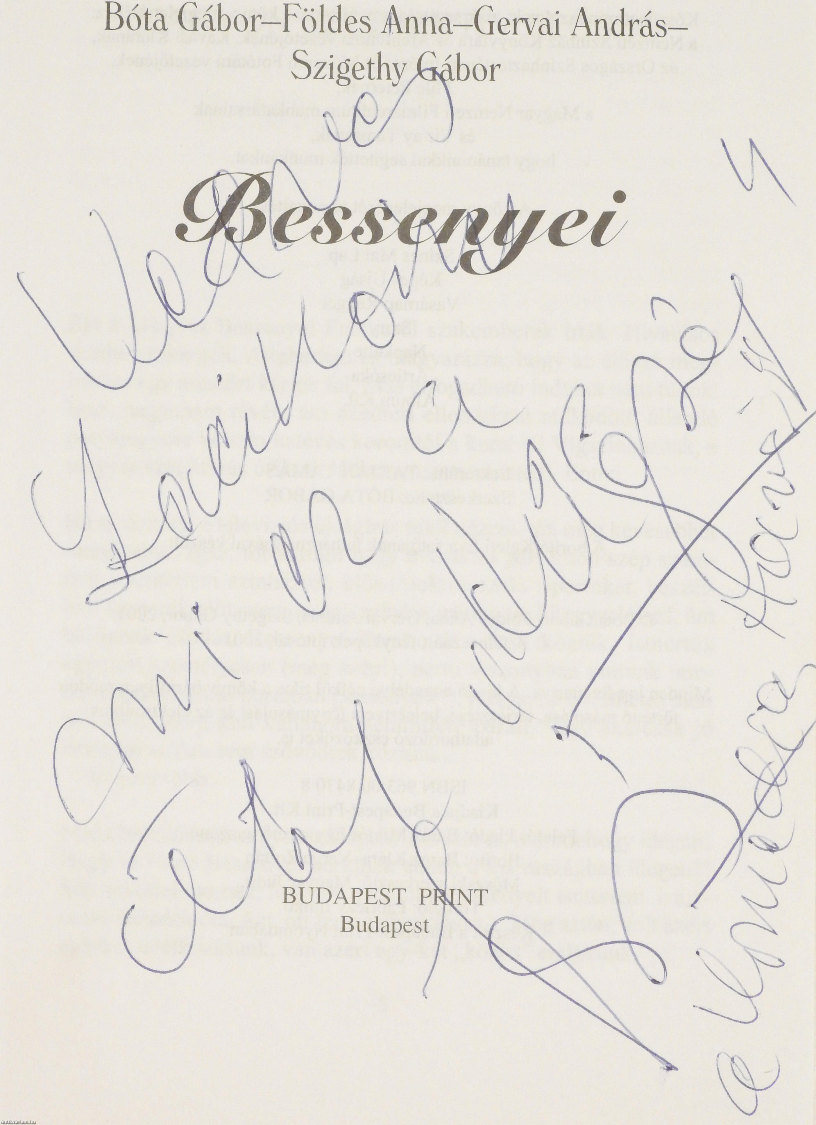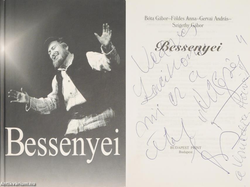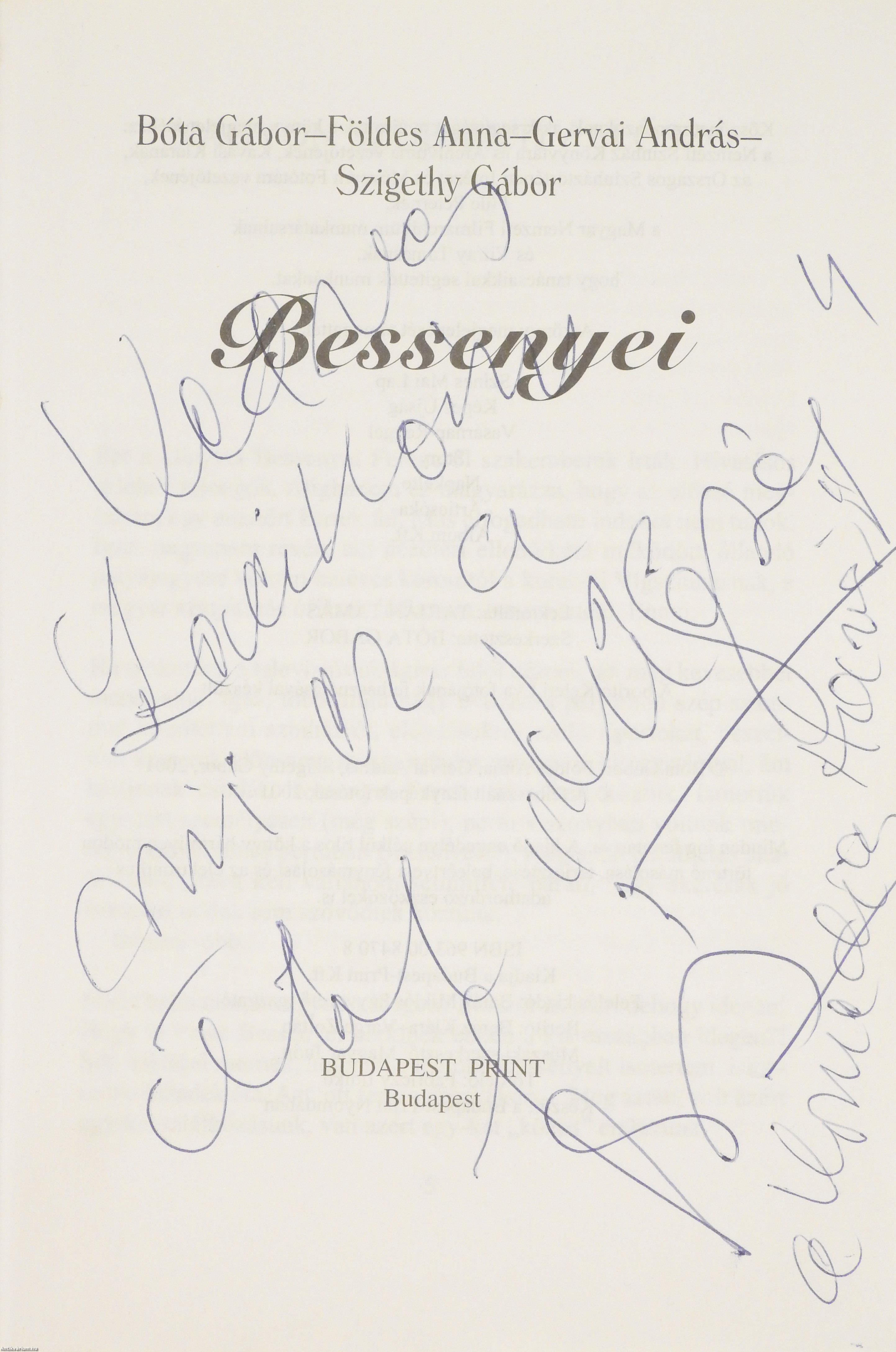 Bessenyei Ferenca Nemzet Színésze címmel kitüntetett, kétszeres Kossuth-díjas színművész által dedikált példány. Első kiadás. A nemzet színészei c. sorozatban (számjelzés nélkül) megjelent mű. Bessenyei. Írta: Bóta Gábor, Földes Anna, Gervai András és Szigethy Gábor. Szerkesztette: Bóta Gábor. A címlapon Bessenyei Ferenc tollal beírt, névre szóló dedikációja olvasható: "Kedves L.-kám mi ez a "hülyeség" ölel Bessenyei Ferenc a komédiás haver?". Szöveg közti, fekete-fehér képekkel és 32 képtáblán számos színes és fekete fehér fényképpel illusztrált, valamint előszóval, bibliográfiával, a könyvben lévő fotók készítőinek jegyzékével és tartalomjegyzékkel kiegészített kötet. A borító Keleti Éva fotójának felhasználásával készült. Borító: Baráz Klára és Varga Zoltán. Nyomtatta a Budapest-Print Nyomda. Kiadói fűzött kemény papírkötésben lévő példány Bessenyei Ferenc fényképével illusztrált, feliratozott címfedéllel, feliratos könyvgerinccel és szöveges hátlappal, hiánytalan, jó állapotban. A kötetet dedikálta Bessenyei Ferenc (Hódmezővásárhely, 1919. február 10. – Lajosmizse, 2004. december 27.), a Nemzet Színésze címmel kitüntetett, kétszeres Kossuth-díjas magyar színművész, érdemes és kiváló művész, a Halhatatlanok Társulatának örökös tagja. 1940-ben a szegedi Városi Színházban kezdte pályáját, később számos színházban – köztük a Miskolci és a Pécsi Nemzetiben, a budapesti Madách Színházban és a Nemzeti Színházban – játszott. Közel 80 filmben is szerepelt. Orgánuma, elegáns, szuggesztív egyénisége a 20. század egyik legnépszerűbb magyar színművészévé tette.