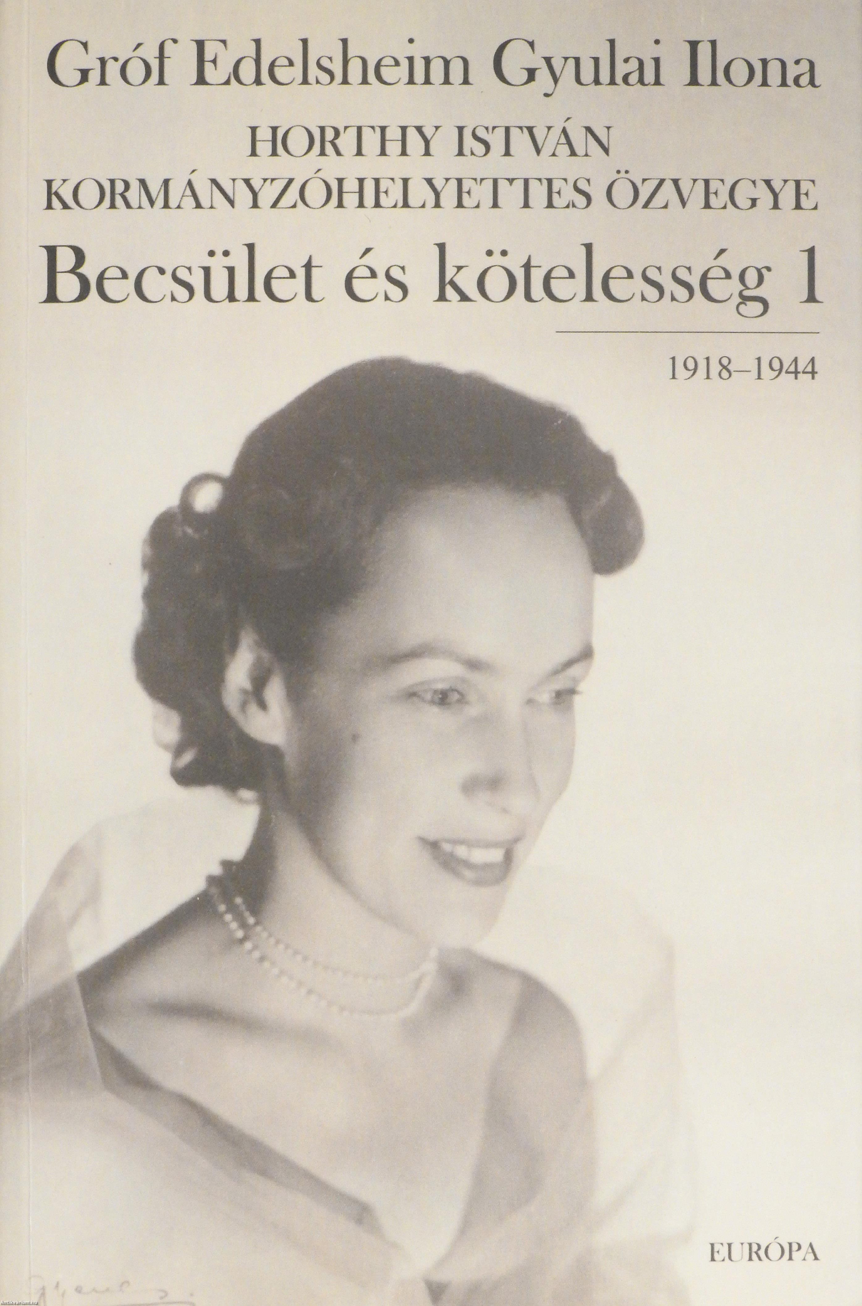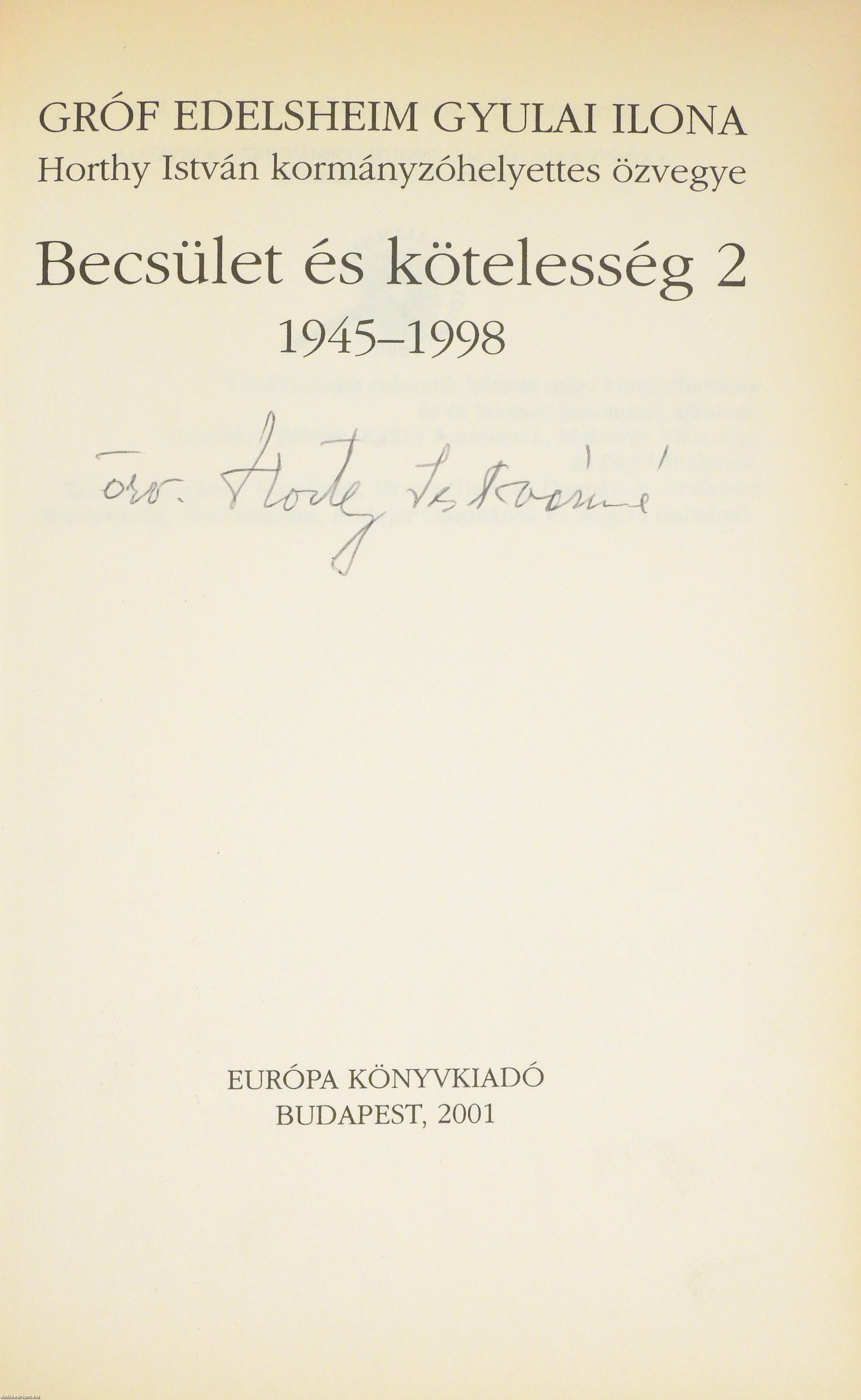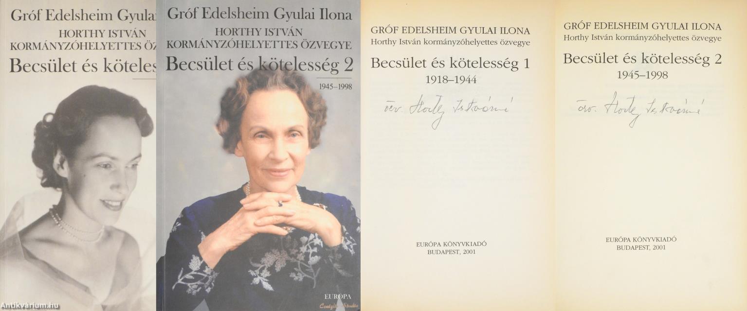 Szerző által aláírt példányok. Becsület és kötelesség 1-2. 1918-1944. – 1945-1998. (Egységes külön kötetekben.) Írta: gróf Edelsheim Gyulai Ilona (Horthy István kormányzóhelyettes özvegye). Szerkesztette: Ocsovai Gábor. Mindkét kötet címlapján a szerző, gróf Edelsheim Gyulai Ilona tollal beírt, jól olvasható aláírásai láthatók. A képeket válogatta: Stemlerné Balog Ilona. A kötetet tervezte: Kállay Judit. Az angol nyelvű részeket fordította: Gaál Csaba és Magyarics Tamás. Számos fekete-fehér, feliratos fényképpel illusztrált, valamint névmutatóval és tartalomjegyzékkel ellátott kötetek. A könyveket az Alföldi Nyomda Rt. nyomtatta Debrecenben. Kiadói ragasztott papírkötésben lévő kötetek feliratos, a szerző fekete-fehér és színes fotójával illusztrált címfedéllel, feliratos könyvgerinccel, fülszöveggel, tiszta belívekkel, hiánytalan, jó állapotban. A kötet szerzője, gróf marosnémethi és nádaskai Edelsheim-Gyulai Ilona Mária Andrea Gabriella (Budapest, 1918. január 14. – Lewes, 2013. április 18.) Horthy István kormányzóhelyettes felesége, a második világháborúban önkéntes ápolónő. Gróf Edelsheim-Gyulai Lipót és verőczei gróf Pejacsevich Gabriella harmadik lányaként született. Gyermekkorát családja felvidéki birtokán, az akkor már Csehszlovákiához tartozó Felsőelefánton töltötte. 1940. február 1-jén ismerkedett meg jövendőbeli férjével, majd 1940. április 27-én feleségül ment vitéz nagybányai Horthy Istvánhoz, Horthy Miklós kormányzó fiához, aki 1942. augusztus 20-án repülőszerencsétlenségben életét vesztette. Szerteágazó közéleti, majd megözvegyülése után reprezentatív szerepet játszott. A II. világháború során vöröskeresztes nővérként dolgozott. Szerepet vállalt a zsidók megmentésében: ő juttatta el Horthy Miklóshoz az Auschwitz-jegyzőkönyvet, amiből világossá vált, hogy a magyarországi zsidókat nem munkaszolgálatra, hanem koncentrációs táborokba viszik. A jegyzőkönyv hatására szüntette be a deportálásokat a kormányzó. Követte a kormányzót a német fogságba, az amerikai hadifogságba, majd a portugáliai emigrációba is, ahol a volt kormányzó levelezését intézte. Emlékiratai "Becsület és kötelesség" címen jelentek meg. A rendszerváltozást követően többször járt Magyarországon, ahol Horthy Miklós végakaratának megfelelően intézte a kormányzó és felesége kenderesi újratemetését. 2013. április 18-án hunyt el angliai otthonában. Földi maradványait 2013. május 2-án a Horthy család mauzóleumában, a kenderesi temetőben helyezték örök nyugalomra.