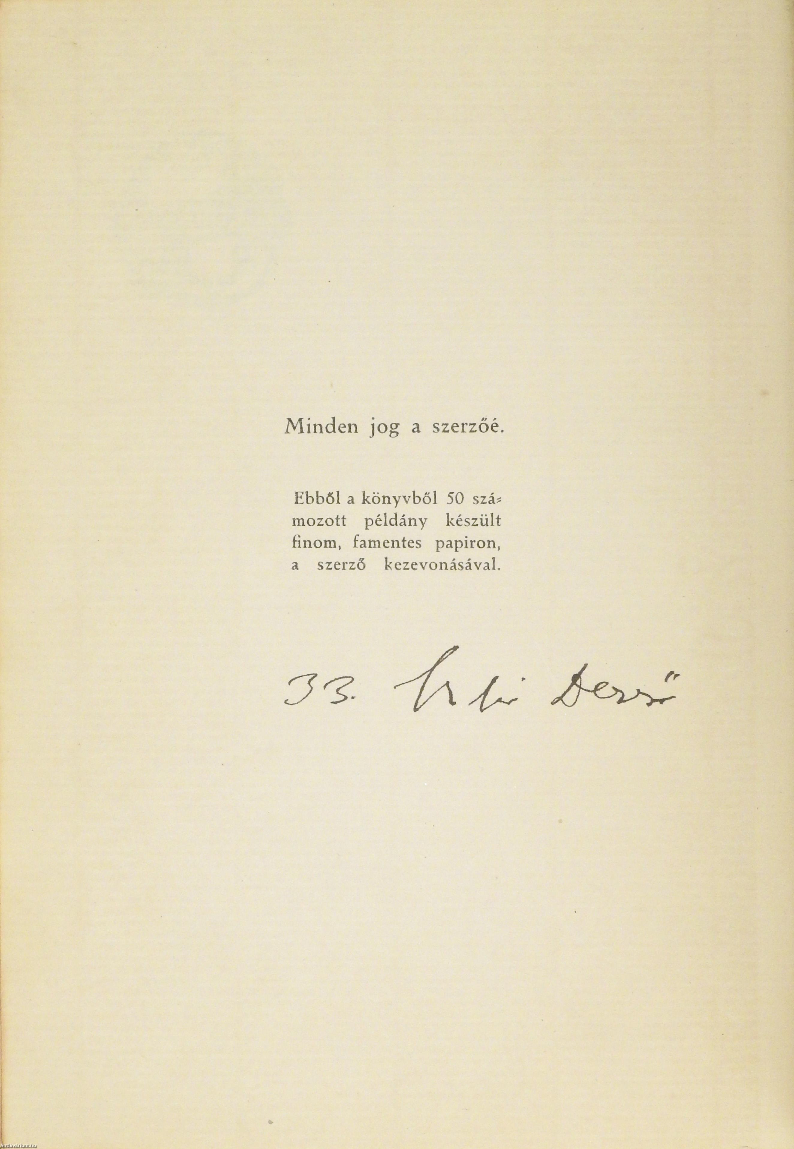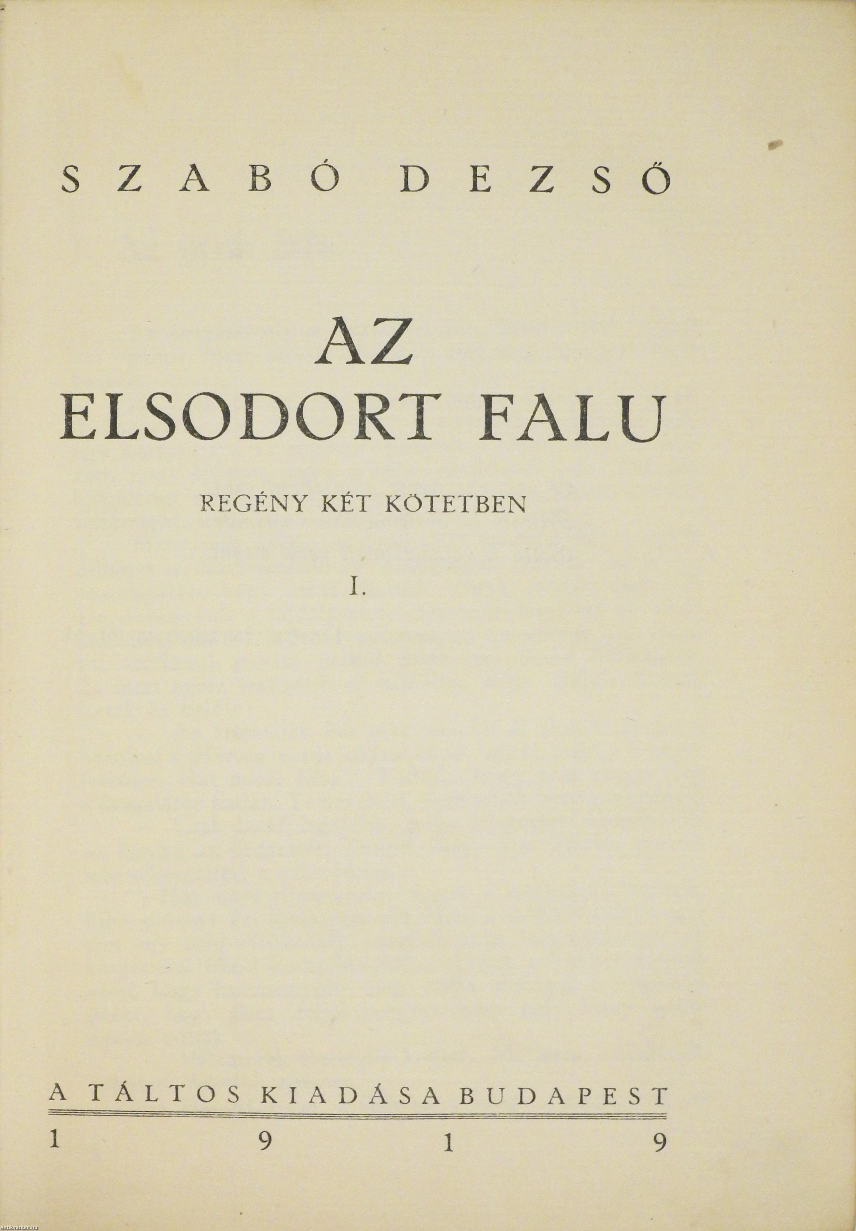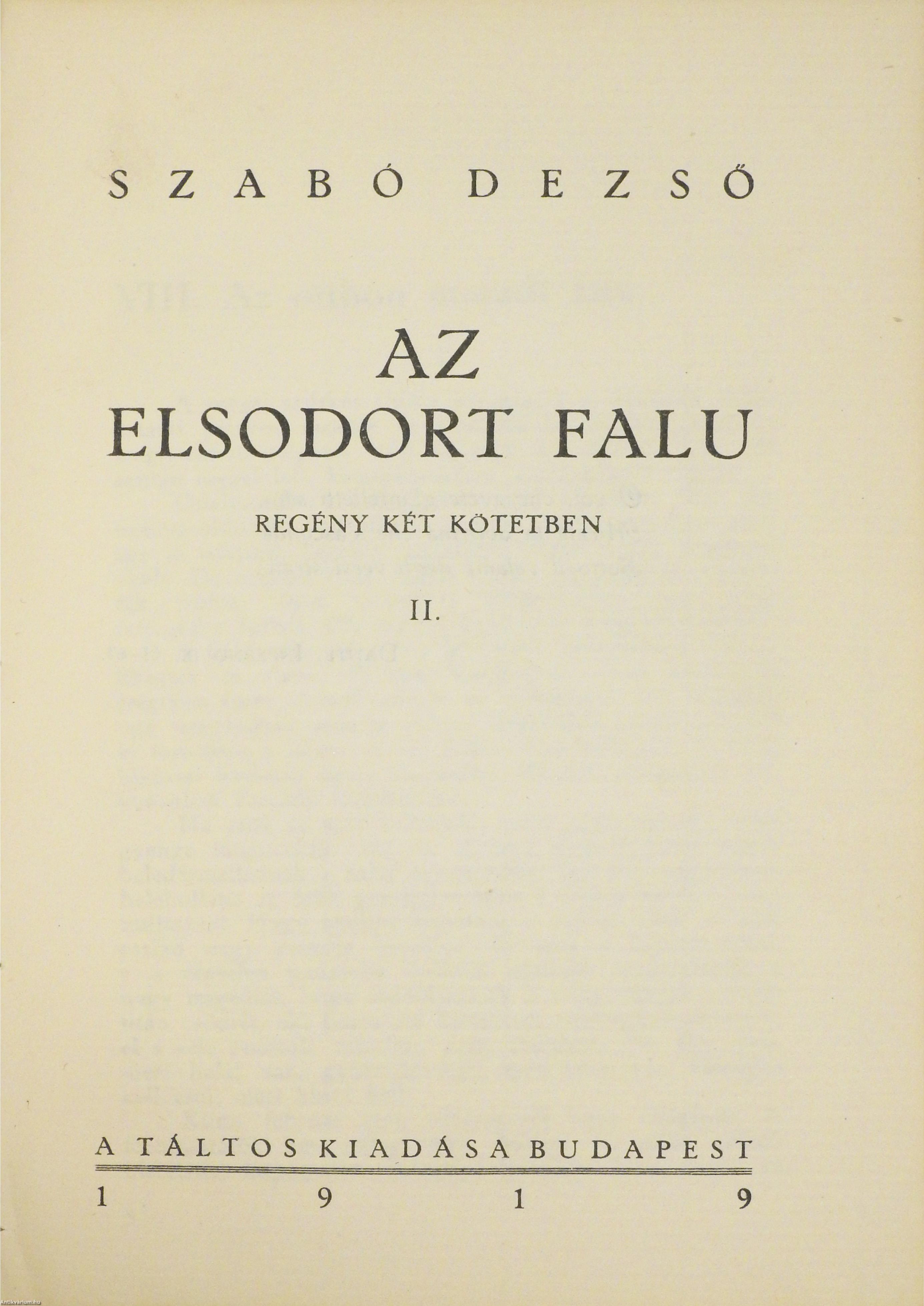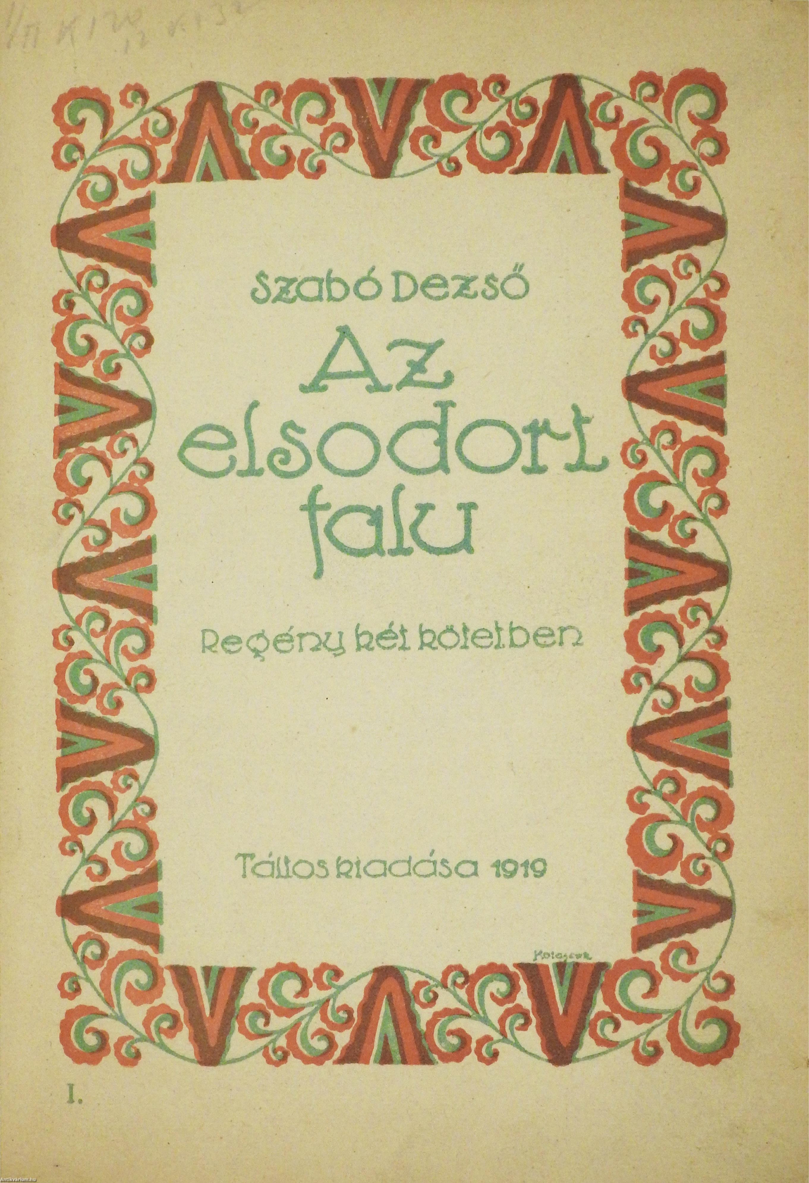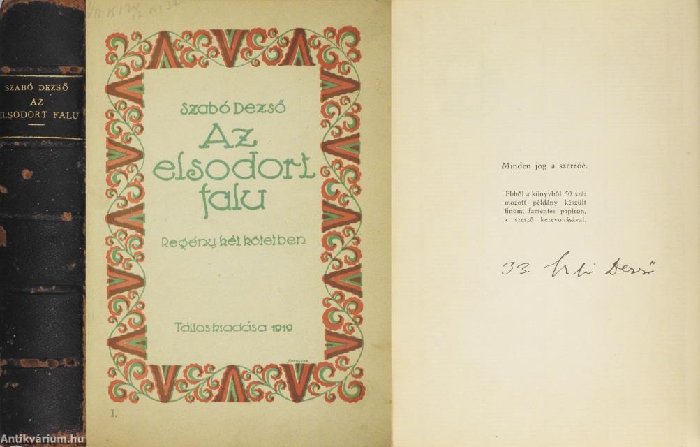 Szerző által aláírt példány. Első, számozott, bibliofil kiadás. Az elsodort falu I-II. (két kötet egy könyvben) Írta: Szabó Dezső. Az I. kötet előlapjának verzóján a szerző, Szabó Dezső tollal beírt, jól olvasható aláírása látható. "Ebből a könyvből 50 számozott példány készült finom, famentes papiron, a szerző kezevonásával". Ez a 33. kézzel számozott példány. Tartalomjegyzékkel kiegészített kötetek. Az előzéklap verzóján kereskedelmi címke (Weichner és Fia Műkönyvkötészet) látható. Nyomattak a Hunnia-nyomdánál, Budapesten. Korabeli félbőr kötésben lévő példány, feliratozatlan címfedéllel, aranyozott feliratozású, ötbordás könyvgerinccel, színes, mintás előzéklapokkal, az eredeti, kiadói címfedél megtartásával, hiánytalan állapotban. A kötet szerzője Szabó Dezső (Kolozsvár, 1879. június 10. – Budapest, 1945. január 13.) író, kritikus, publicista, tanár. A két világháború közötti magyar irodalom kiemelkedő, nagy hatású képviselője. Első novellái a Nyugatban jelentek meg. A Virradat c. jobboldali lap publicistája, az Auróra felelős szerkesztője, az Előörs társszerkesztője. Nagy sikerű politikai tanulmányaival, közéleti írásaival és elhíresült Ludas Mátyás Füzeteivel nagy hatást gyakorolt a korabeli közgondolkodásra és politikára. Az 1919-ben megjelent Az elsodort falu c. regénye egy székely falu világán keresztül ad képet a világháborúba sodródott magyar társadalom válságáról.