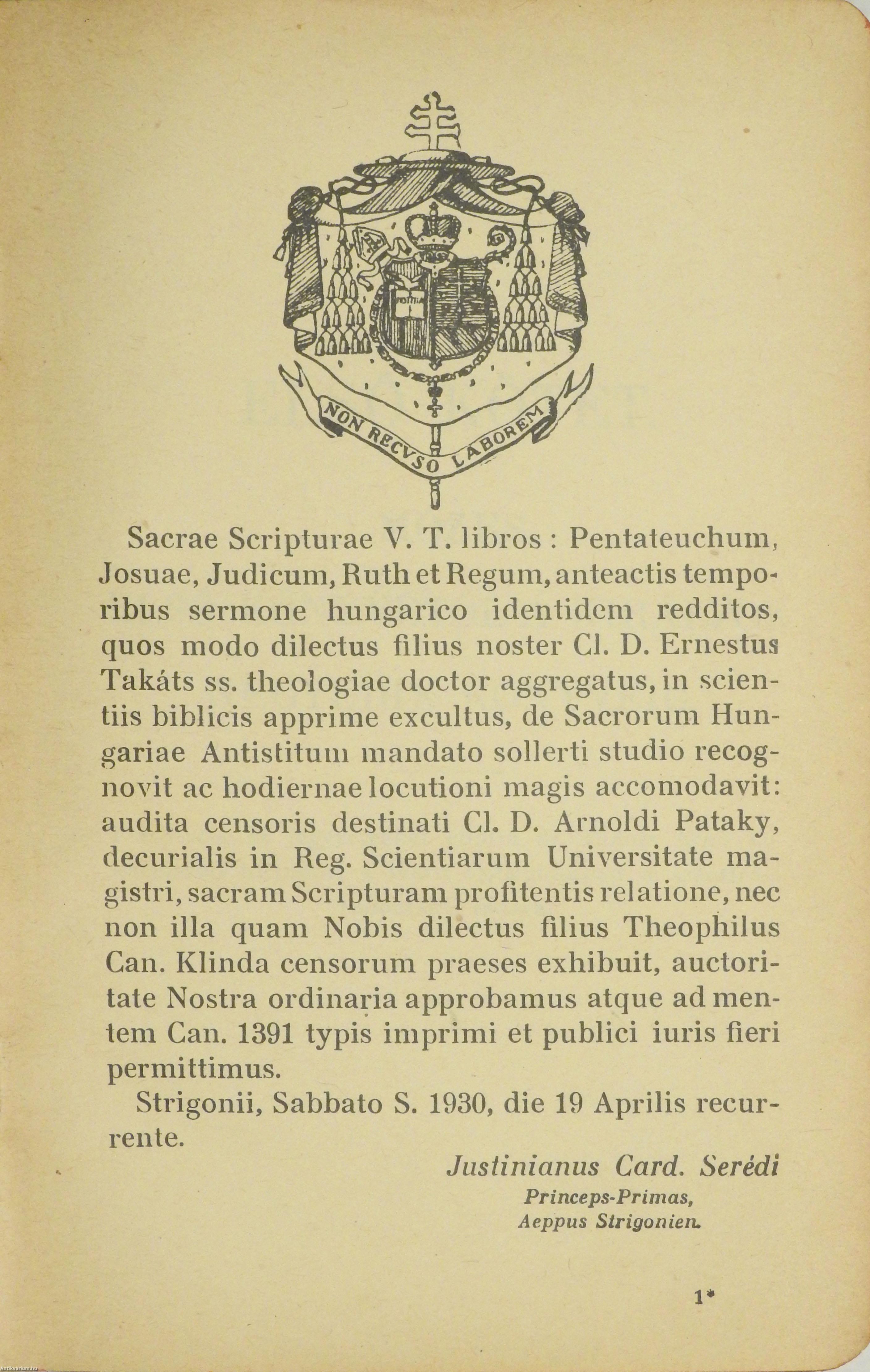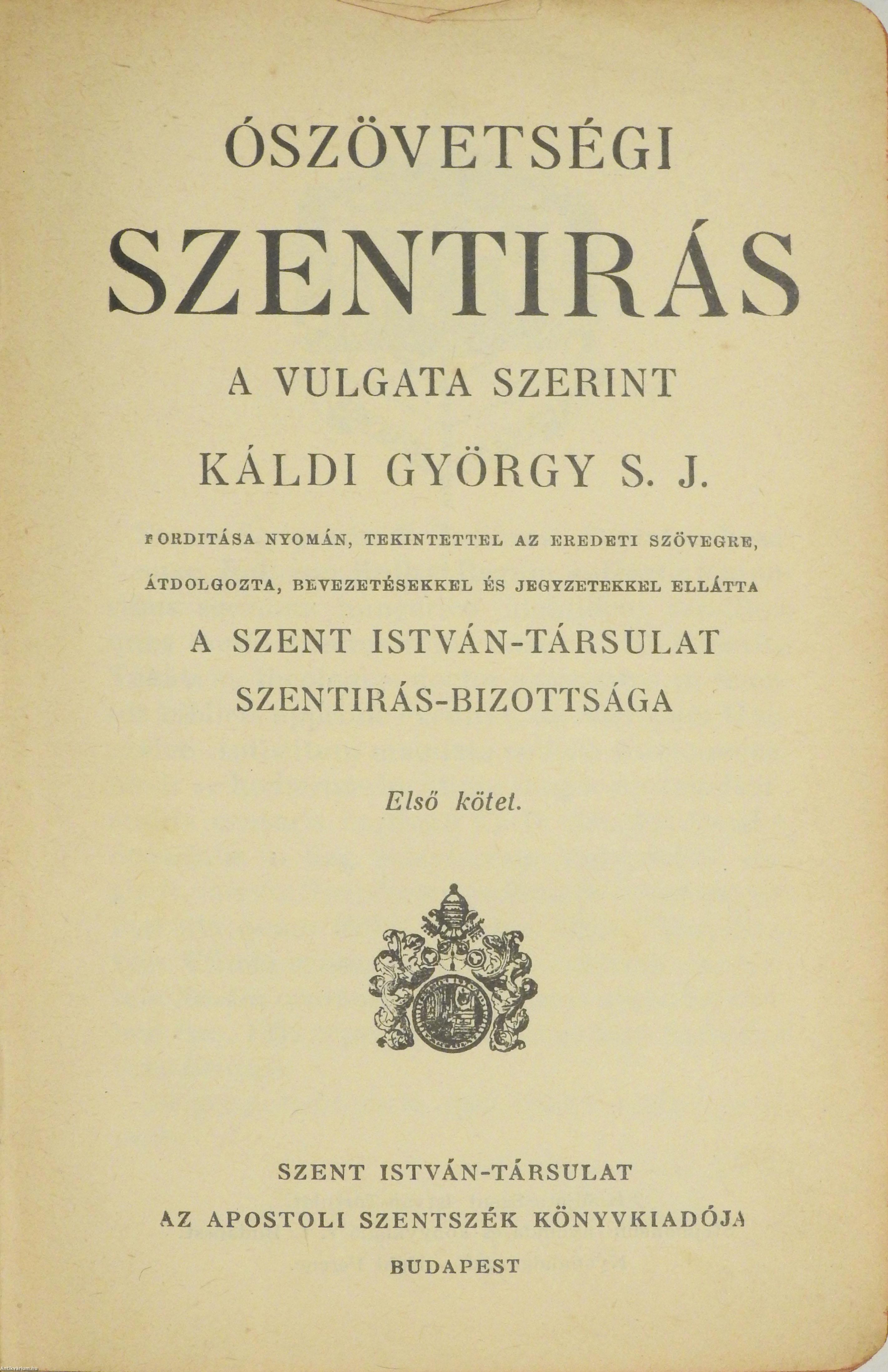 - I. kötet: Mózes első könyvétől a Királyok negyedik könyvéig. Egy színes és egy fekete-fehér, kihajtható térképpel (Előázsia. Az izraeliták útja Egyiptomból-Kánaánba a hagyományos vélemény szerint; Palesztina térképe. Móz. I. - Kir. IV. történetéhez) illusztrált kiadás. Budapest, é. n., Szent István-Társulat, 1019 p. + [1] p. + [2] térk.: ill