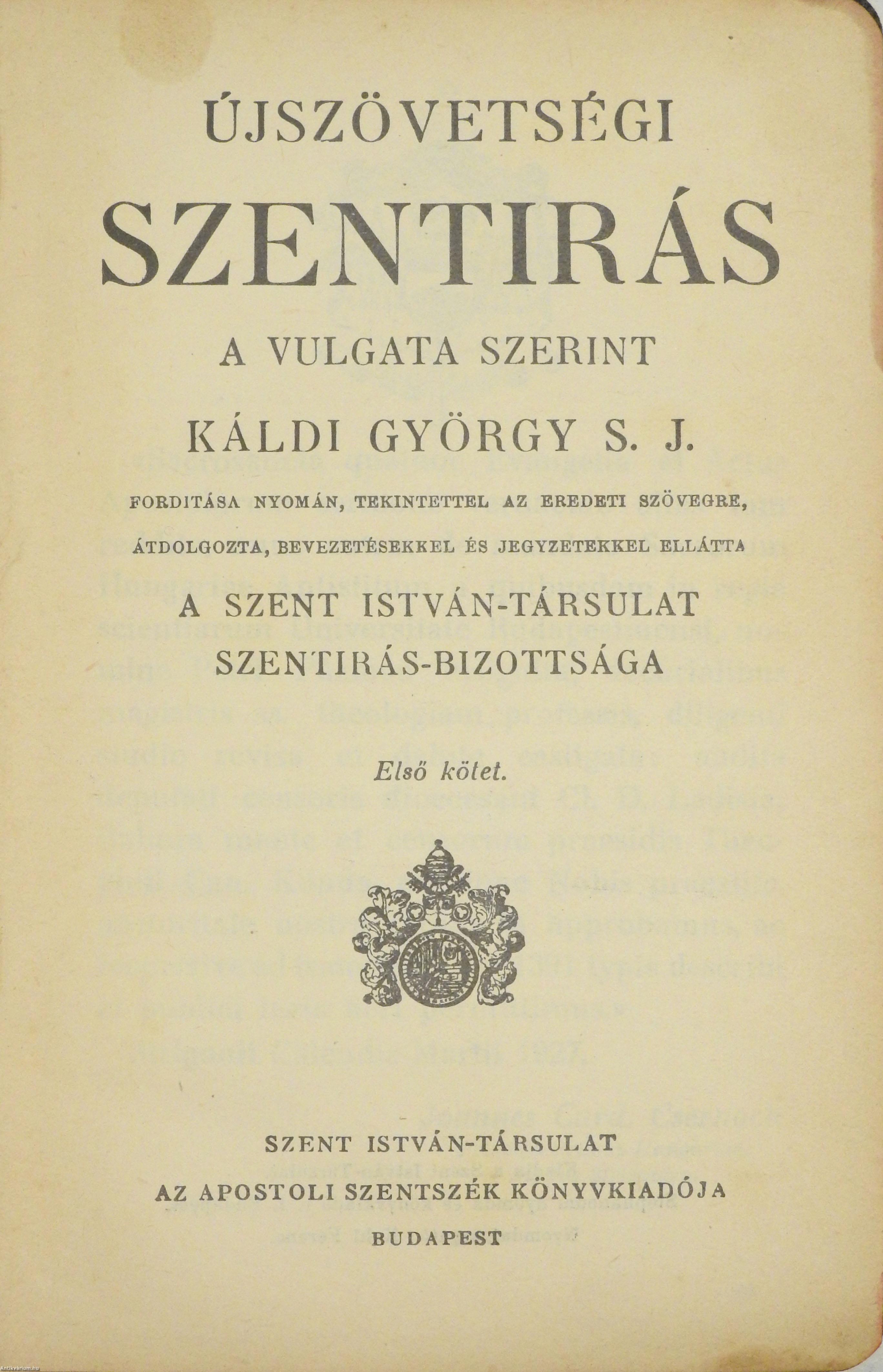 - I. kötet: Jézus Krisztus négy szent evangéliuma és az apostolok cselekedetei. Két színes, kihajtható térképpel (Palesztina vázlatos térképe; Szent Pál apostol útjai) illusztrált kiadás. Budapest, é. n., Szent István-Társulat, 554 p. + [2] térk.: ill