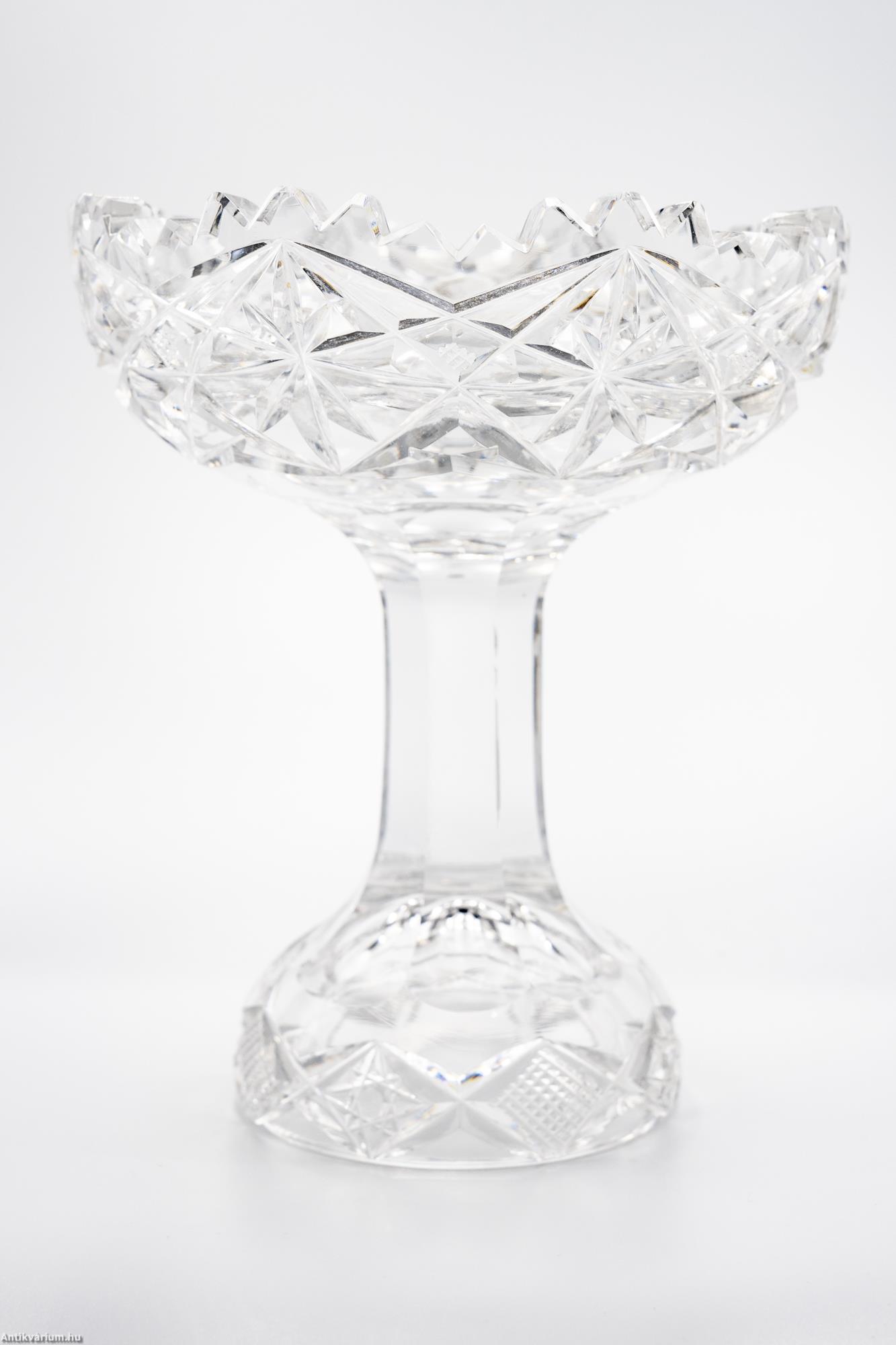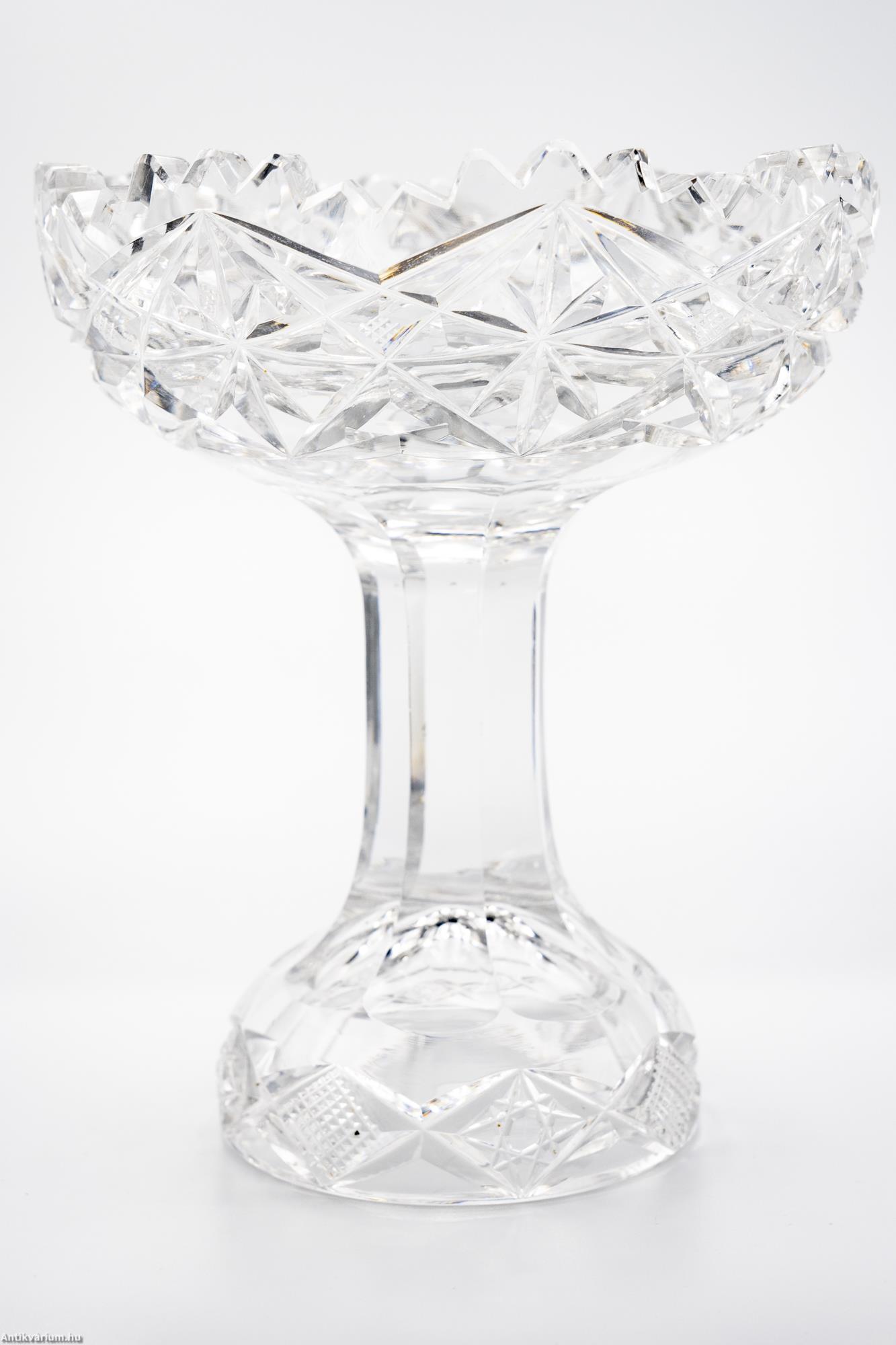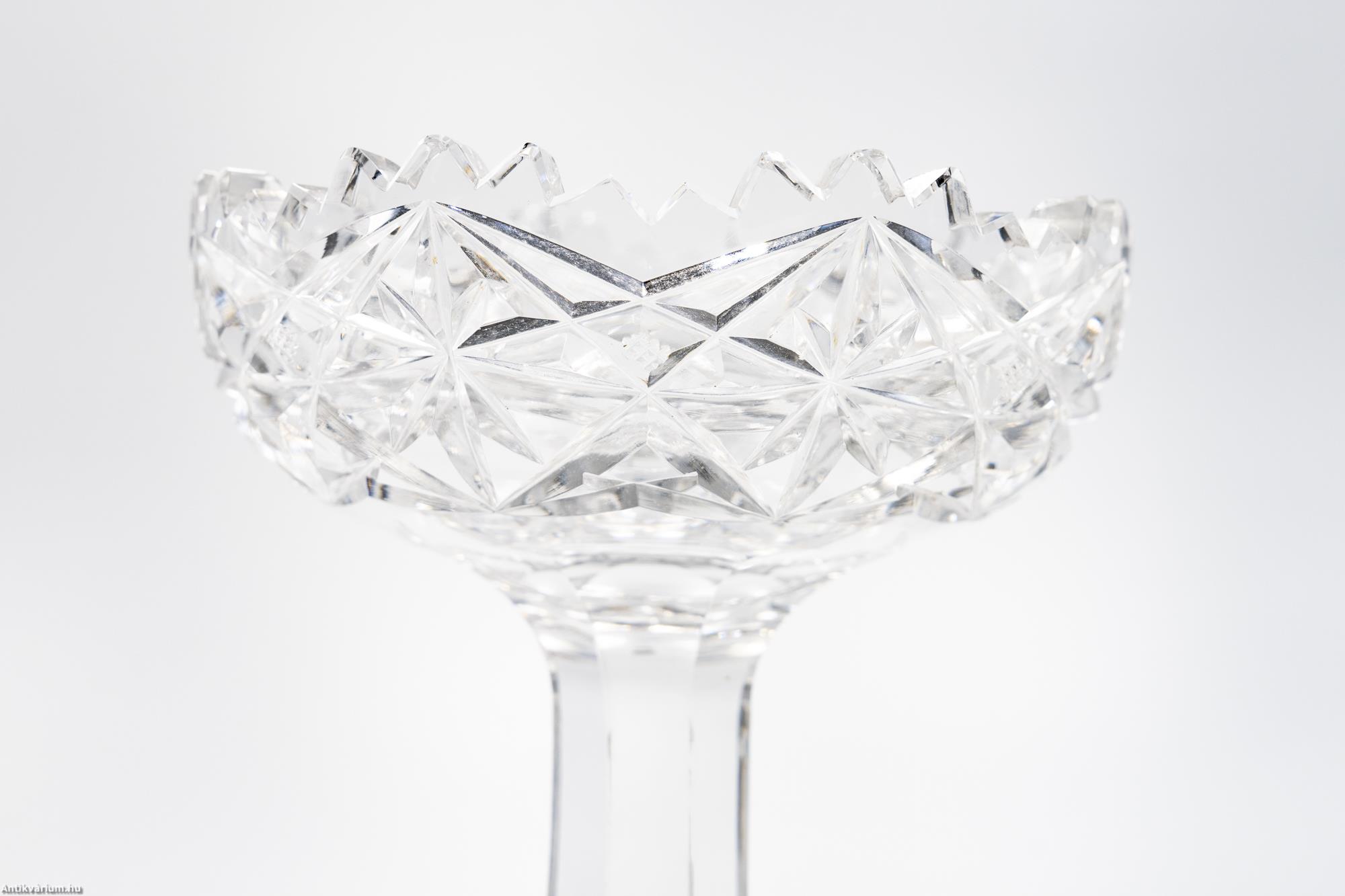 Hibátlan állapotú, fújt és kézzel formázott, cseh art deco csiszolt kristály asztalközép üveg tál a 20. század első feléből. Vastagfalú, nagysúlyú üveg tál színtelen, átlátszó üvegből és csiszolt mintázattal készítve. Szára hámozott üvegből készült, félgömb alakú csiszolt talprésze üreges. Kehely részén az üveg mélyen és egyenletesen csiszolt, ismétlődő csillag alakú mintával díszített, amely végigfut az egész felületen és különleges optikai hatást keltő fény - árnyék hatást eredményez. Ezen az alkotáson megfigyelhető az egy szín használat (amely gyakran színtelen vagy fehér és annak árnyalatai) és a tömör üvegréteg kialakítás, ezek együttesen mind jellemzői ennek a fényesen csillogó, igényesen megmunkált, nagy tisztaságú üvegből készített talpas üveg asztalközép tálnak.
