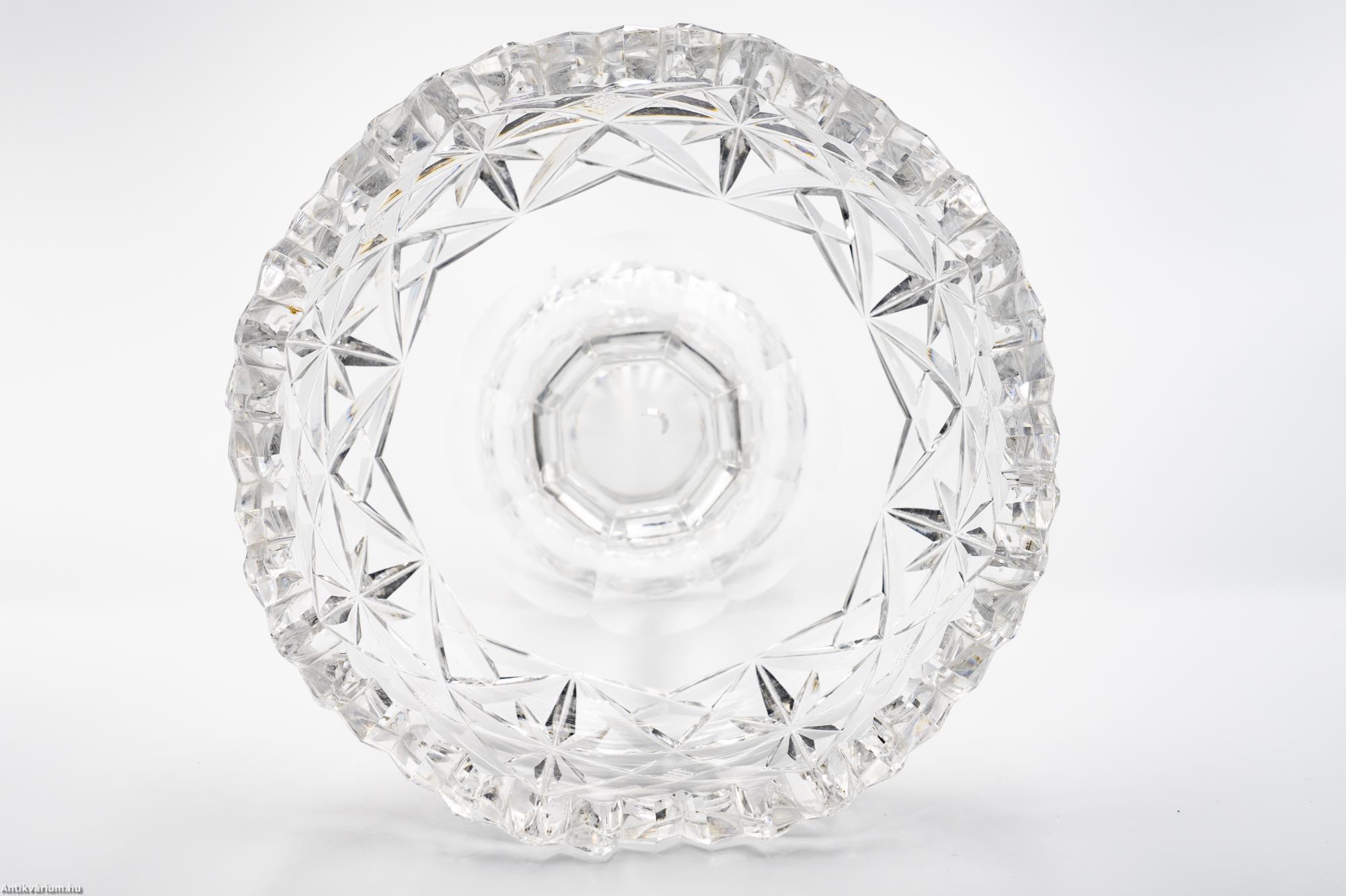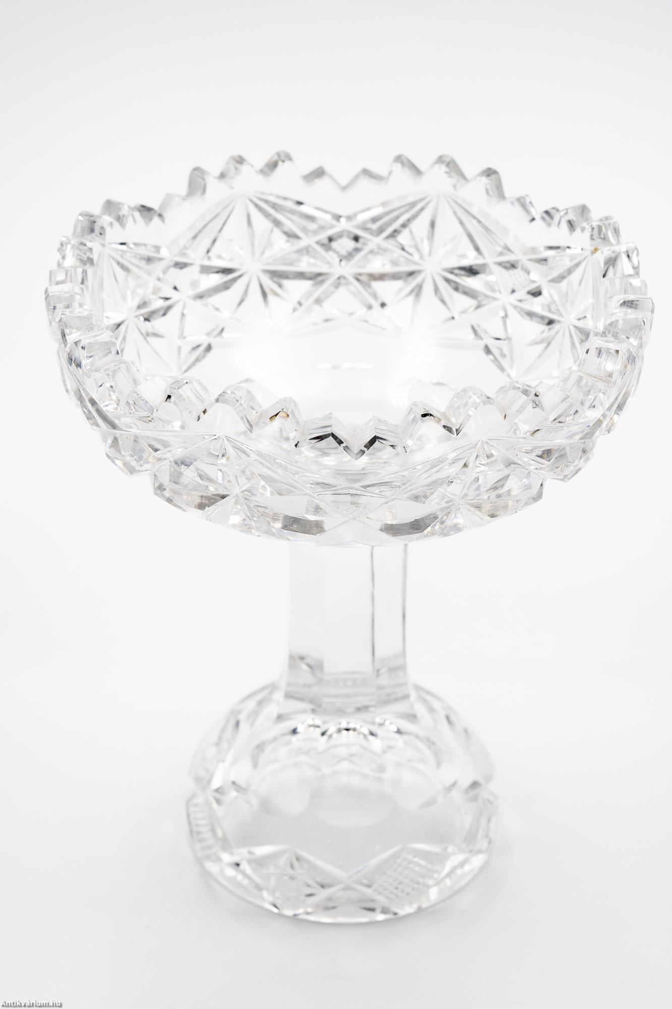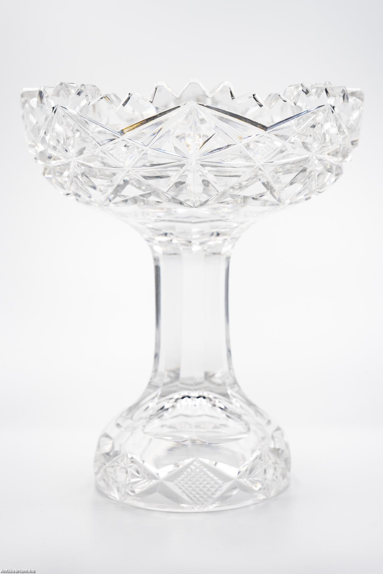 Hibátlan állapotú, fújt és kézzel formázott, cseh art deco csiszolt kristály asztalközép üveg tál a 20. század első feléből. Vastagfalú, nagysúlyú üveg tál színtelen, átlátszó üvegből és csiszolt mintázattal készítve. Szára hámozott üvegből készült, félgömb alakú csiszolt talprésze üreges. Kehely részén az üveg mélyen és egyenletesen csiszolt, ismétlődő csillag alakú mintával díszített, amely végigfut az egész felületen és különleges optikai hatást keltő fény - árnyék hatást eredményez. Ezen az alkotáson megfigyelhető az egy szín használat (amely gyakran színtelen vagy fehér és annak árnyalatai) és a tömör üvegréteg kialakítás, ezek együttesen mind jellemzői ennek a fényesen csillogó, igényesen megmunkált, nagy tisztaságú üvegből készített talpas üveg asztalközép tálnak.