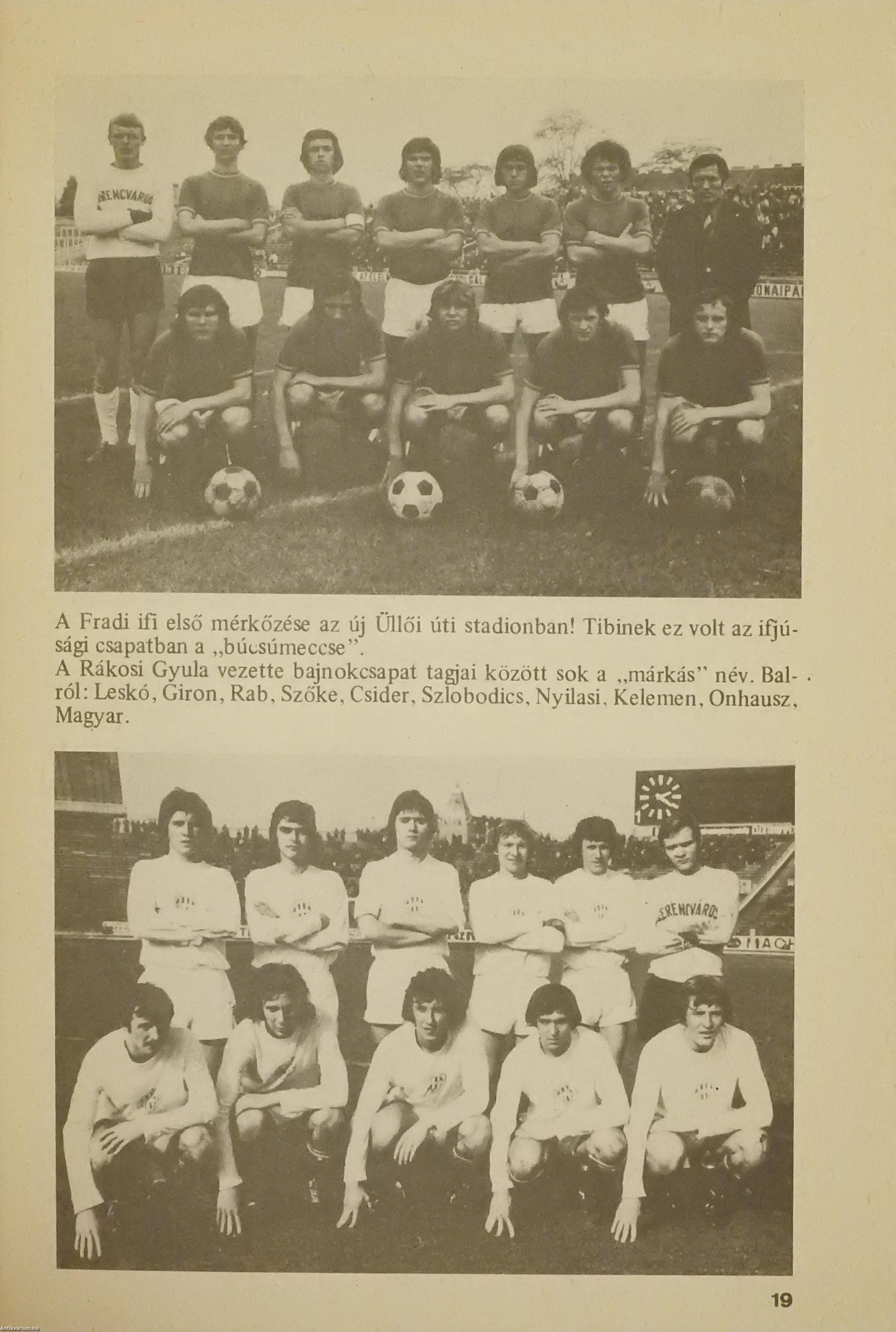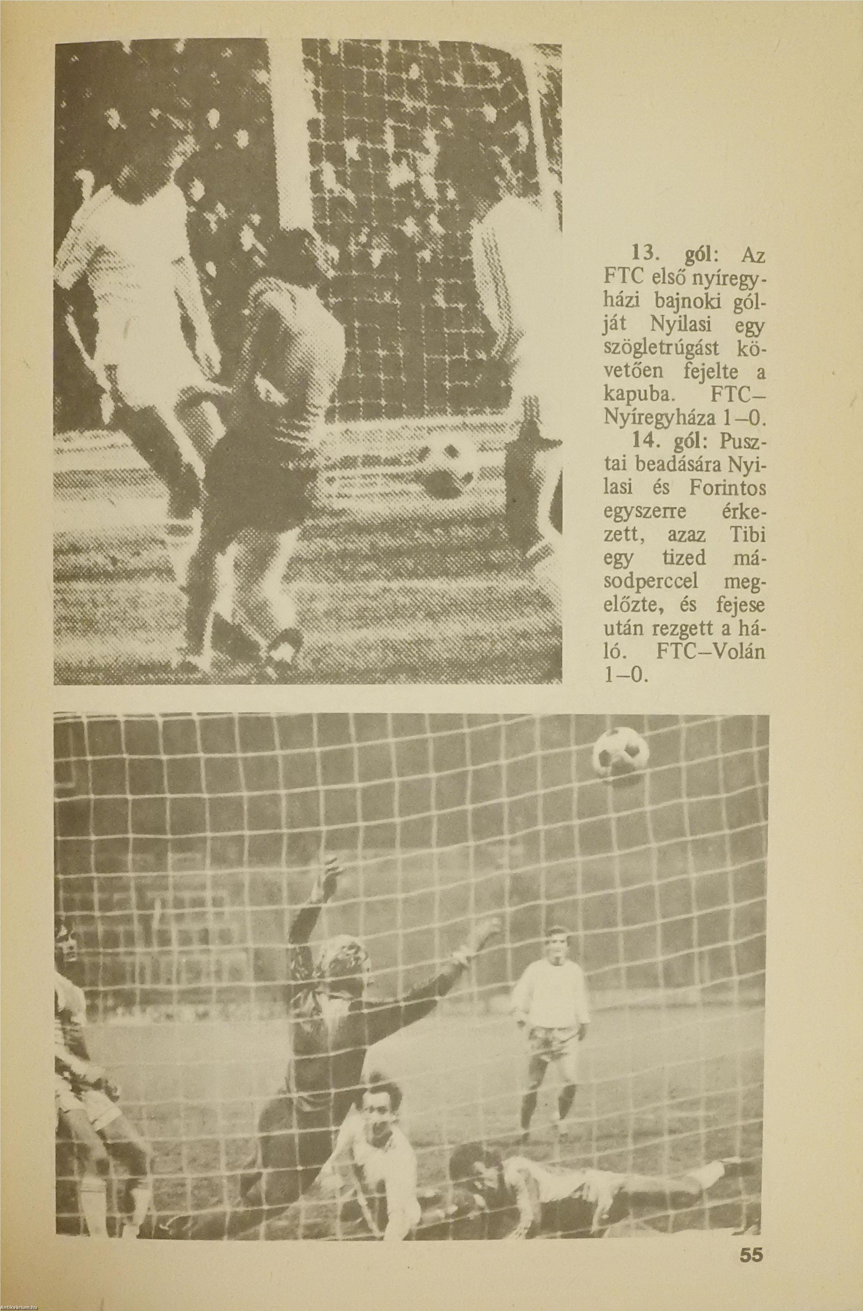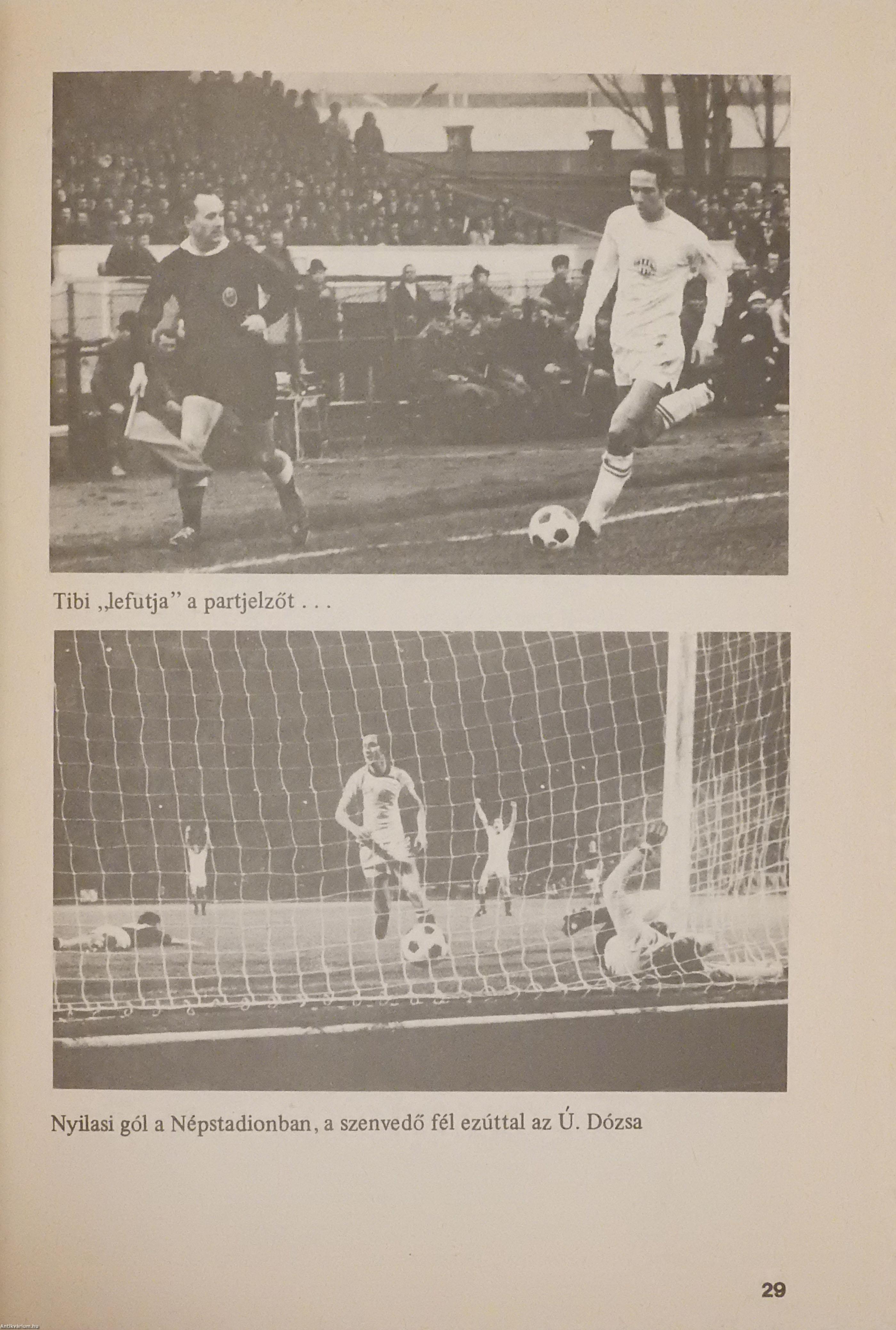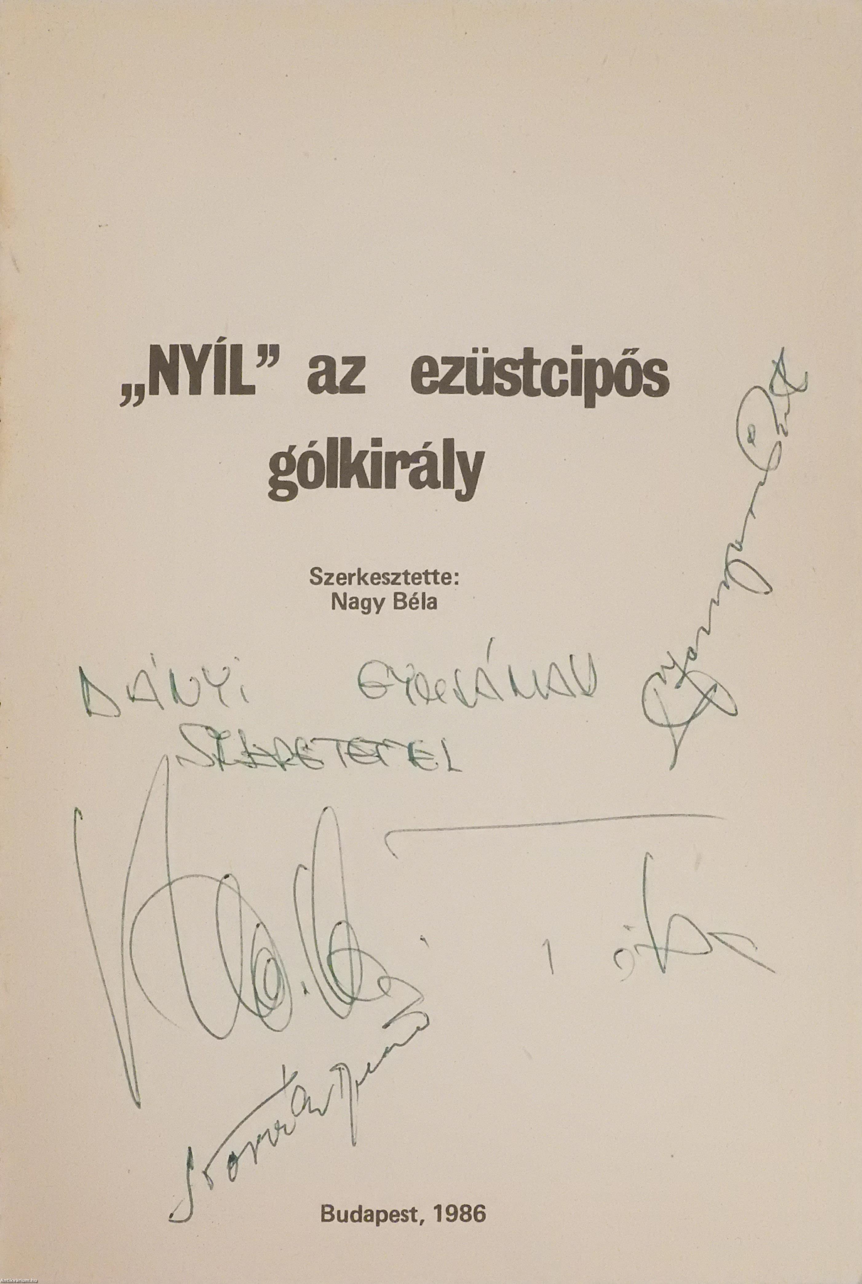 Három magyar labdarúgó által dedikált példány. Első kiadás. "Nyíl" az ezüstcipős gólkirály. Fradisták fényképalbuma. Szerkesztette: Nagy Béla. A címlapon Nyilasi Tibor, Novák Dezső és Fenyvesi Máté válogatott magyar labdarúgók dedikációja olvasható: "D. Gy.-nak szeretettel Nyilasi Tibor, Novák Dezső, Fenyvesi Máté". Szöveg közti, fekete-fehér képekkel gazdagon illusztrált, valamint előszóval és hirdetésekkel kiegészített kötet. Nyomtatta az NS Nyomda. Kiadói ragasztott papírkötésben lévő példány, feliratozott, színes illusztrációval ellátott címfedéllel, feliratozatlan könyvgerinccel, illusztrált hátlappal, hiánytalan, jó állapotban.