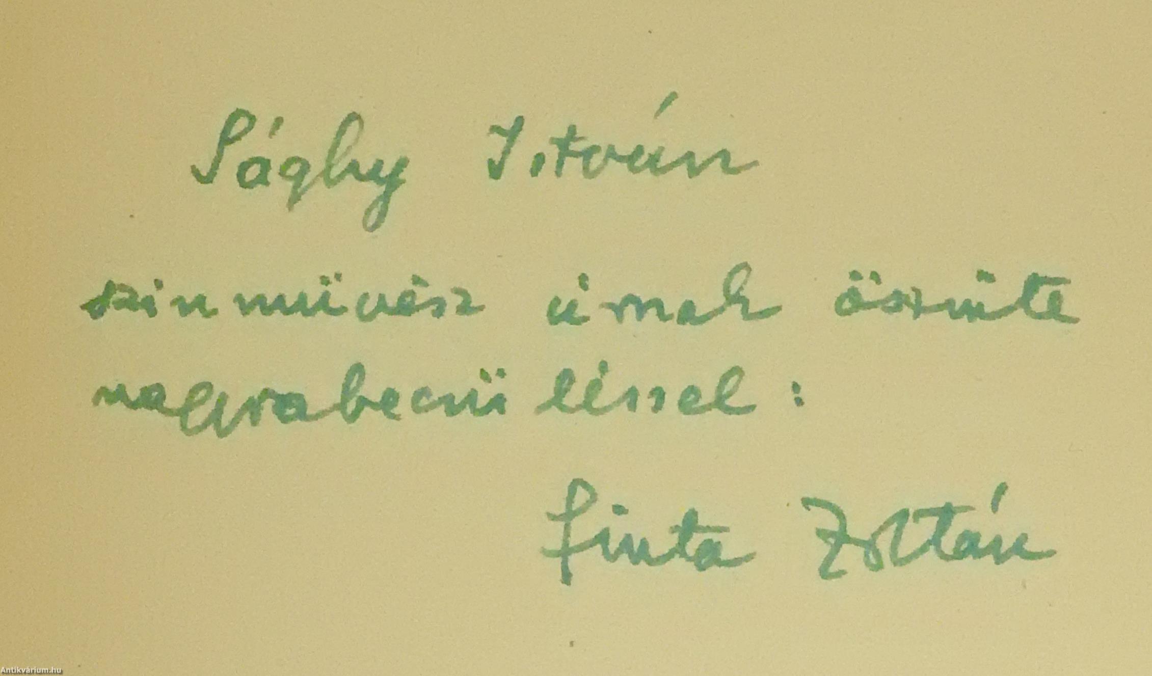 Az előlapon a szerző, Finta Zoltán tollal beírt, névre szóló dedikációja olvasható: "Sághy István színművész úrnak őszinte nagyrabecsüléssel: Finta Zoltán".