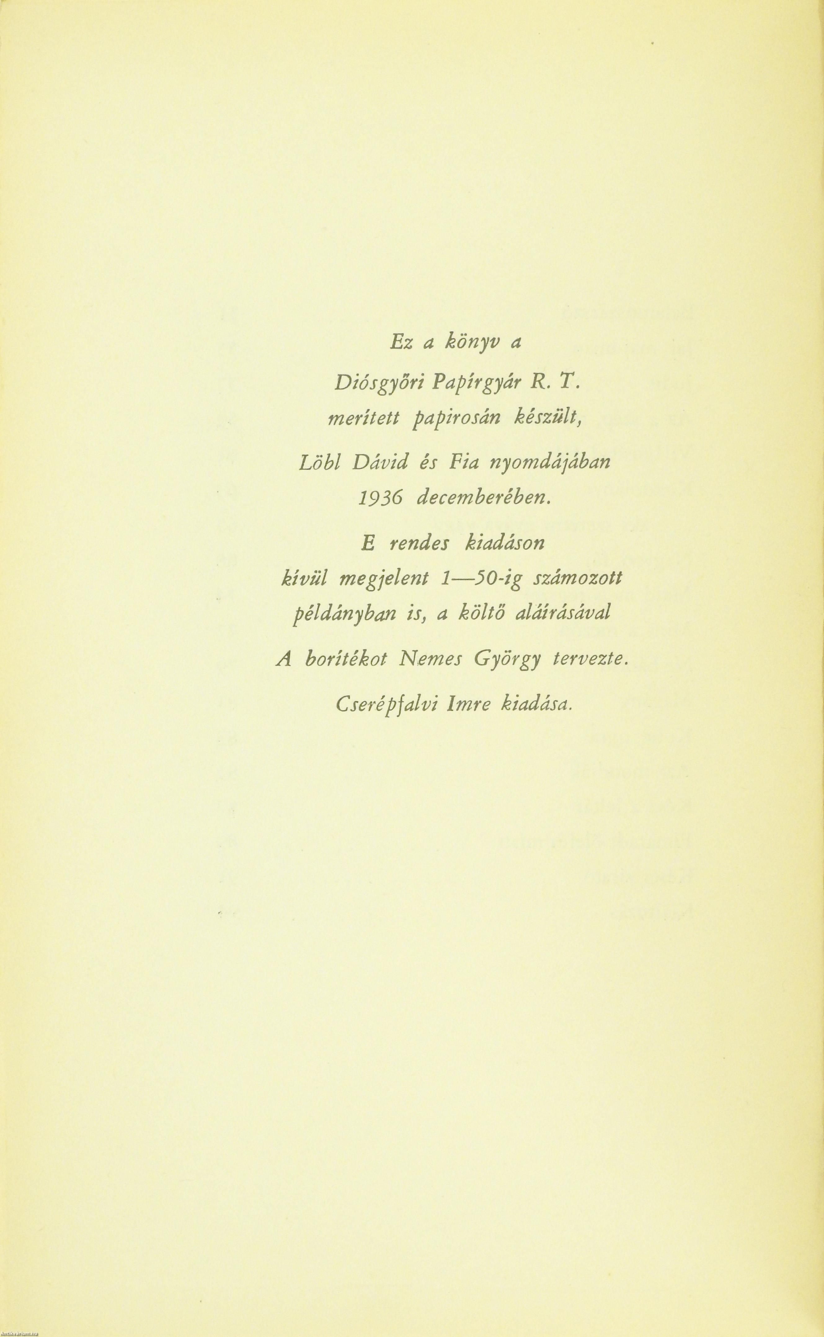 "Ez a könyv a Diósgyőri Papírgyár R. T. merített papirosán készült, Löbl Dávid és Fia nyomdájában 1936 decemberében. E rendes kiadáson kívül megjelent 1-50-ig számozott példányban is, a költő aláírásával. A borítékot Nemes György tervezte. Cserépfalvi Imre kiadása."