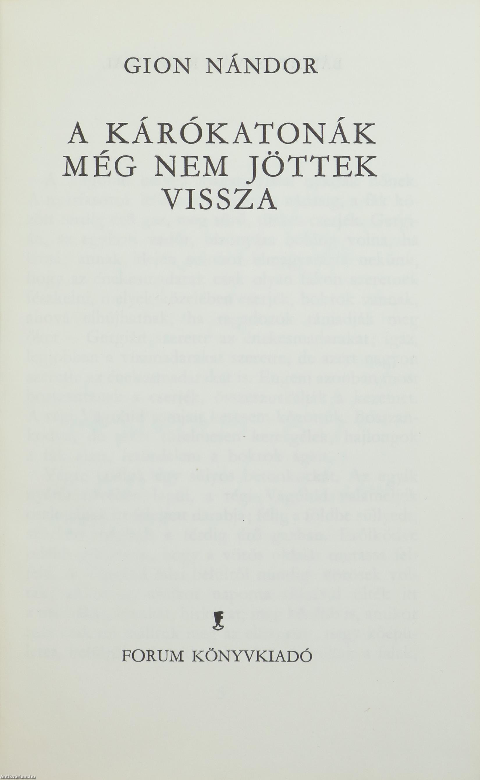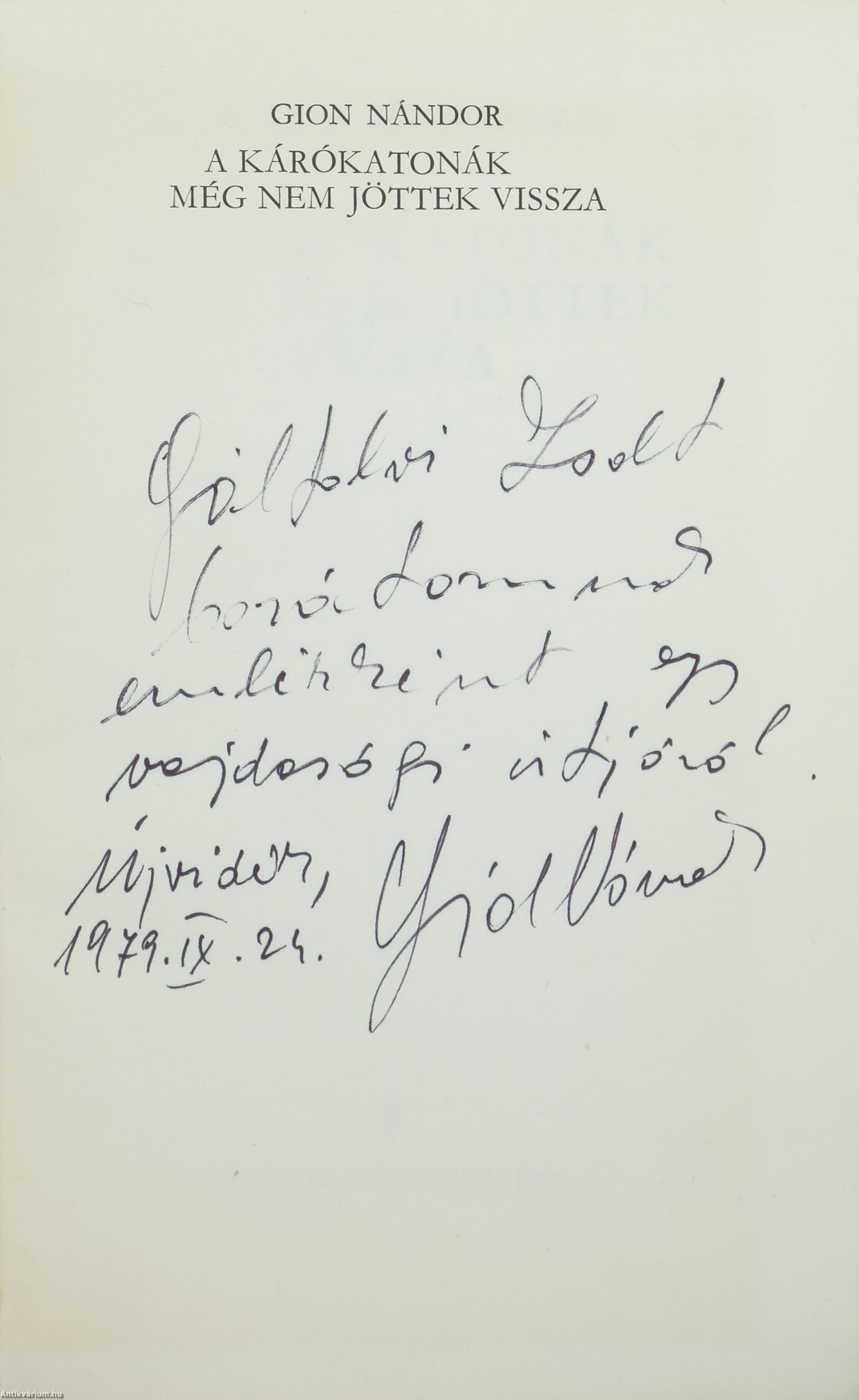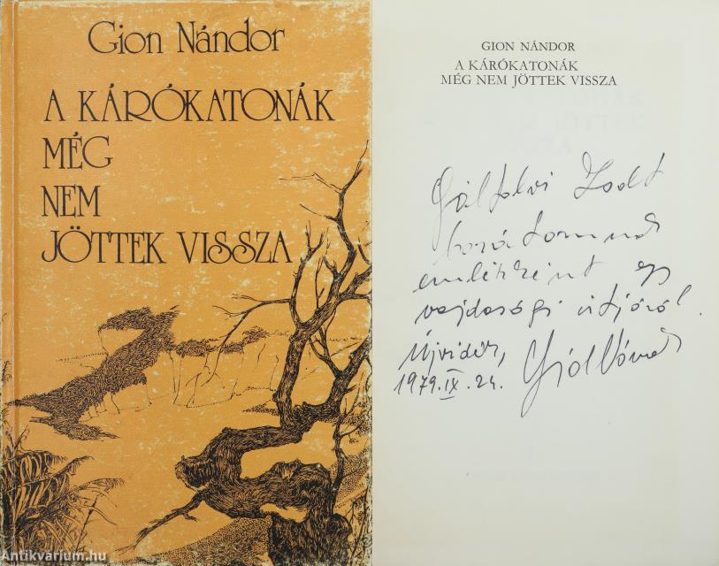 Szerző által dedikált példány. Első kiadás. A kárókatonák még nem jöttek vissza. Írta: Gion Nándor. Szerkesztő: Fuderer Gyula. Az előlapon a szerző, Gion Nándor tollal beírt, névre szóló dedikációja olvasható: "P. Zs. barátomnak emlékként egy vajdasági útjáról Gion Nándor. Újvidék, 1979. IX. 24." Bálint István szöveg közti, fekete-fehér rajzaival illusztrált, valamint bevezetéssel ellátott kötet. A fedőlapot Bálint István tervezte. Nyomtatta a Fórum Lap- és Könyvkiadó Vállalat nyomdája, Újvidéken. Kiadói fűzött kemény papírkötésben lévő példány feliratozott, illusztrációval ellátott címfedéllel és könyvgerinccel, illusztrált hátlappal, hiánytalan állapotban. A kötet szerzője, Gion Nándor (Szenttamás, 1941. február 1. – Szeged, 2002. augusztus 27.) József Attila-díjas vajdasági magyar író, újságíró, forgatókönyvíró, tanár, az újvidéki rádió magyar főszerkesztője. Első sikerét az 1968-ban megjelenő Kétéltűek a barlangban című regényével érte el, majd az 1969-es Testvérem, Joáb c. regényéért a Forum Kiadó első díját kapta meg. 1969-től az Új Symposion szerkesztőségének tagja, és a megújuló vajdasági magyar irodalom egyik kiemelkedő képviselője lett Tolnai Ottó mellett. 1993-tól Magyarországon élt és dolgozott. Életművében jelentős részt képeznek a jugoszláviai és magyarországi rendszerváltásokat feldolgozó művek.