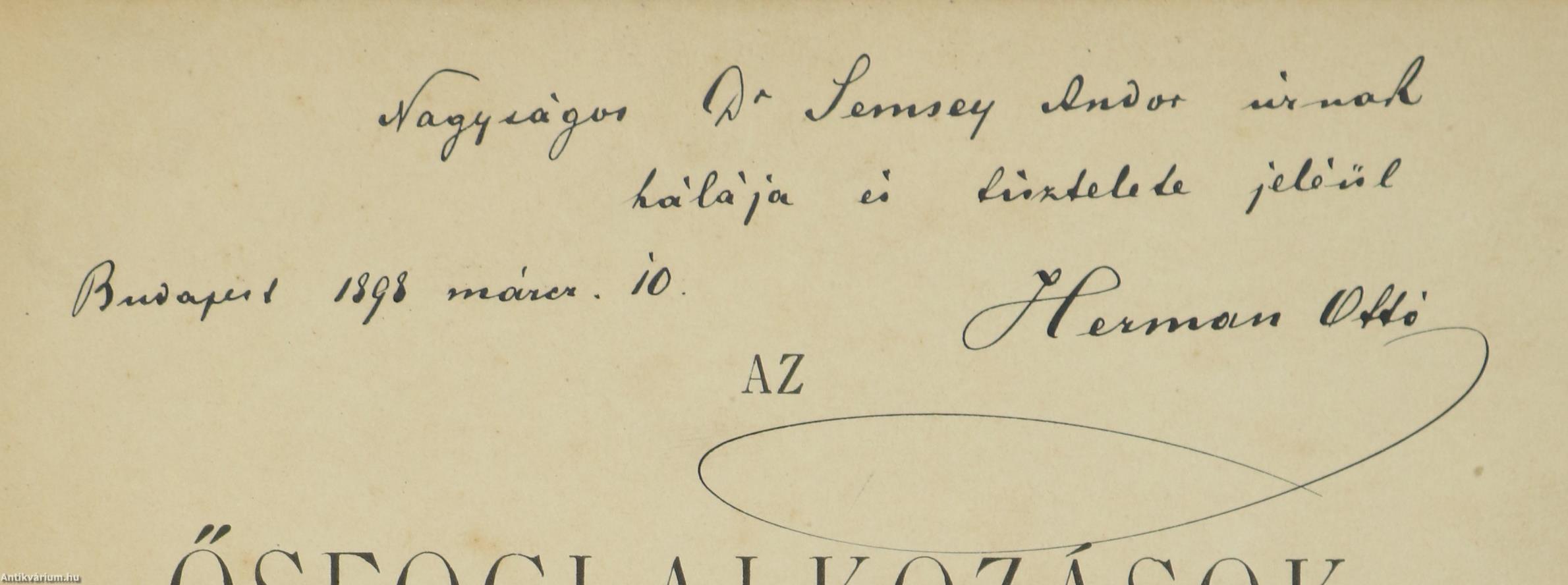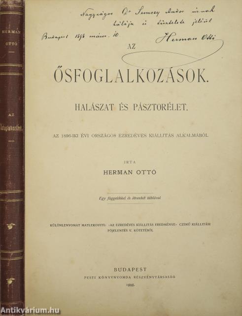 Szerző által dedikált példány. Az ősfoglalkozások. Halászat és pásztorélet. Írta: Herman Ottó. A címlapon a szerző, Herman Ottó tollal beírt dedikációja olvasható: "Nagyságos Dr. Semsey Andor úrnak hálája és tisztelete jeléül Herman Ottó Budapest 1898. márcz. 10."