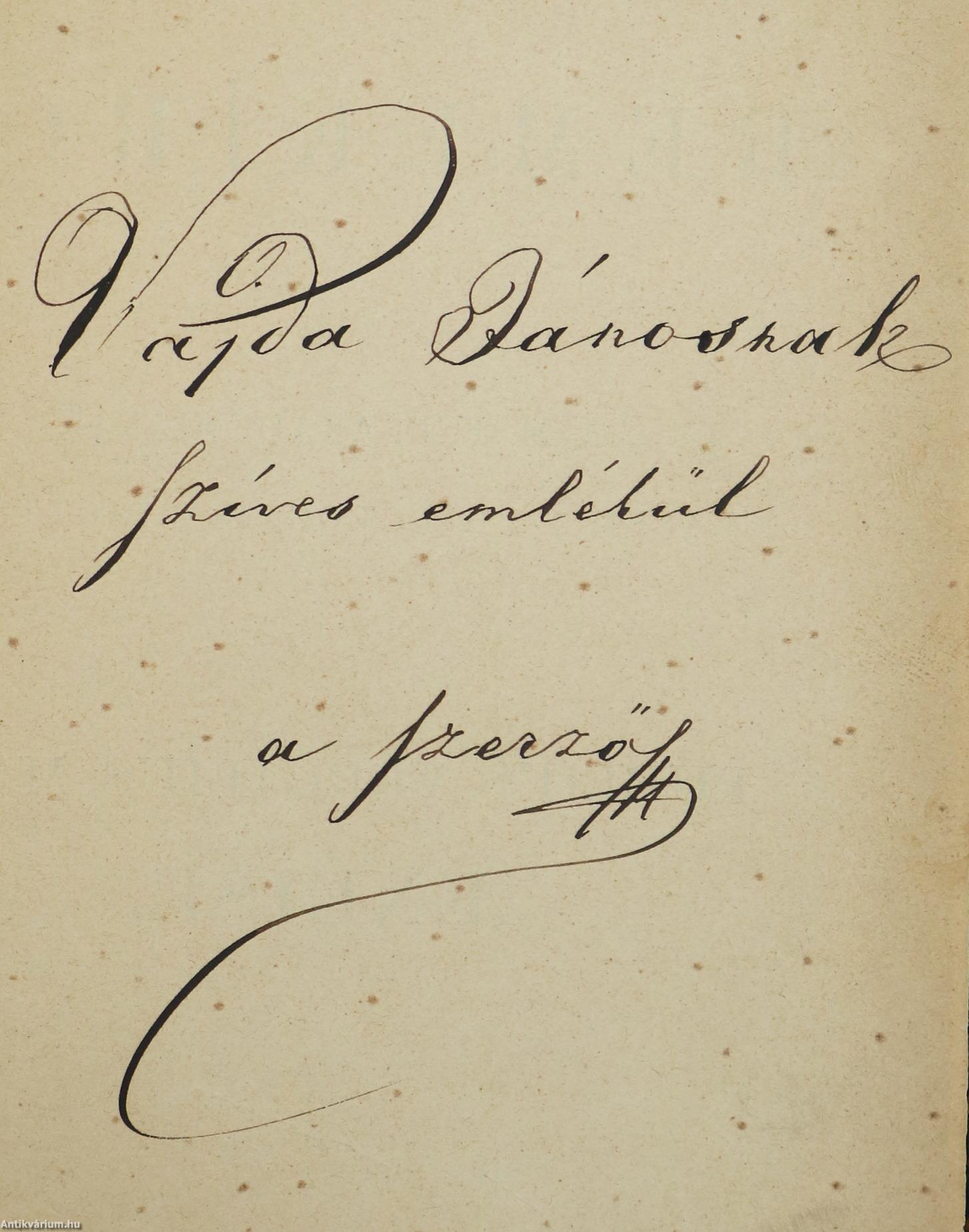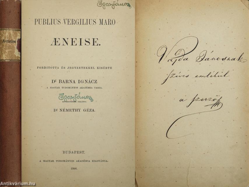 Vajda Jánosnak dedikált példány. Görög és latin remekírók c. sorozatban számjelzés nélkül megjelent mű. Kiadja a M. Tud. Akadémiának Classica-Philologiai Bizottsága. Publius Vergilius Maro Aeneise. Fordította és jegyzetekkel kísérte: Dr. Barna Ignácz a Magyar Tudományos Akadémia tagja. Bevezetéssel ellátta: Dr. Némethy Géza. Az előlapon Vajda Jánosnak írt dedikáció olvasható: "Vajda Jánosnak szíves emlékül a szerző". A dedikáció címzettje, Vajda János (1827-1897) költő, hírlapíró, műfordító, a márciusi ifjak egyike, a Kisfaludy Társaság rendes tagja. 1848-ban a Pilvax törzsvendégeként részt vett a pesti forradalomban, augusztusban önként jelentkezett honvédnek. A szabadságharc bukása után besorozták az osztrák hadseregbe. 1850 után előbb vidéken, majd Pesten hivatalnokoskodott, később újságíróként dolgozott. Miután úgy gondolta, hogy a forradalom ügye már elveszett, politikailag teljesen elszigetelődött, és a 48-as eszmék árulójának kiáltották ki. Később ismét szembekerült a domináns politikai irányvonallal – ezúttal a Deák-féle párttal –, mivel nem támogatta a kiegyezést. Állandó konfrontációi időről időre megnehezítették anyagi boldogulását, ami költészetére is rányomta bélyegét. Természeti képekben gazdag, érzelmileg telített, filozofikus lírája élesen eltért korának irodalmi ízlésétől; a szimbolizmus előfutárának tartják. Előszóval, jegyzetekkel, tájszavak jegyzékével és tartalomjegyzékkel kiegészített kötet. A címlapon és néhány oldalon tulajdonosi bélyegzés látható. Nyomtatta a Frankilin-Társulat Nyomdája. Korabeli félvászon kötésben lévő példány feliratozatlan, mintás címfedéllel és hátlappal, feliratos könyvgerinccel, mintázott lapélekkel, hiánytalan állapotban. A szerző, Publius Vergilius Maro (i. e. 70. október 15. – i. e. 19. szeptember 21.) római költő, Ovidius és Horatius mellett az augustusi aranykor epikus költője. Legismertebb művei közé tartozik az Aeneis című eposz és a Georgica című tanköltemény. Rómában tanult, majd a római polgárháború idején Athénba menekült. Később visszatért Rómába, ahol Augustus császár felszólította, hogy írjon egy tankölteményt. Ez volt a Georgica, mely elsősorban a földművelés dicséretét, a császár politikájának elismertetését célozza, valamint magasztalja a társadalom stabilitását megalapozó változásokat. A mű sikeressége után a császár megbízta Vergiliust egy a római nép őstörténetét magába foglaló költemény megírásával, mely az Aeneis címet kapta és a római klasszicista költészet kimagasló darabja volt. Tíz éven át íródott a költemény. E művét sajnos a költő nem tudta befejezni, kisebb részek töredékesen maradtak fenn.