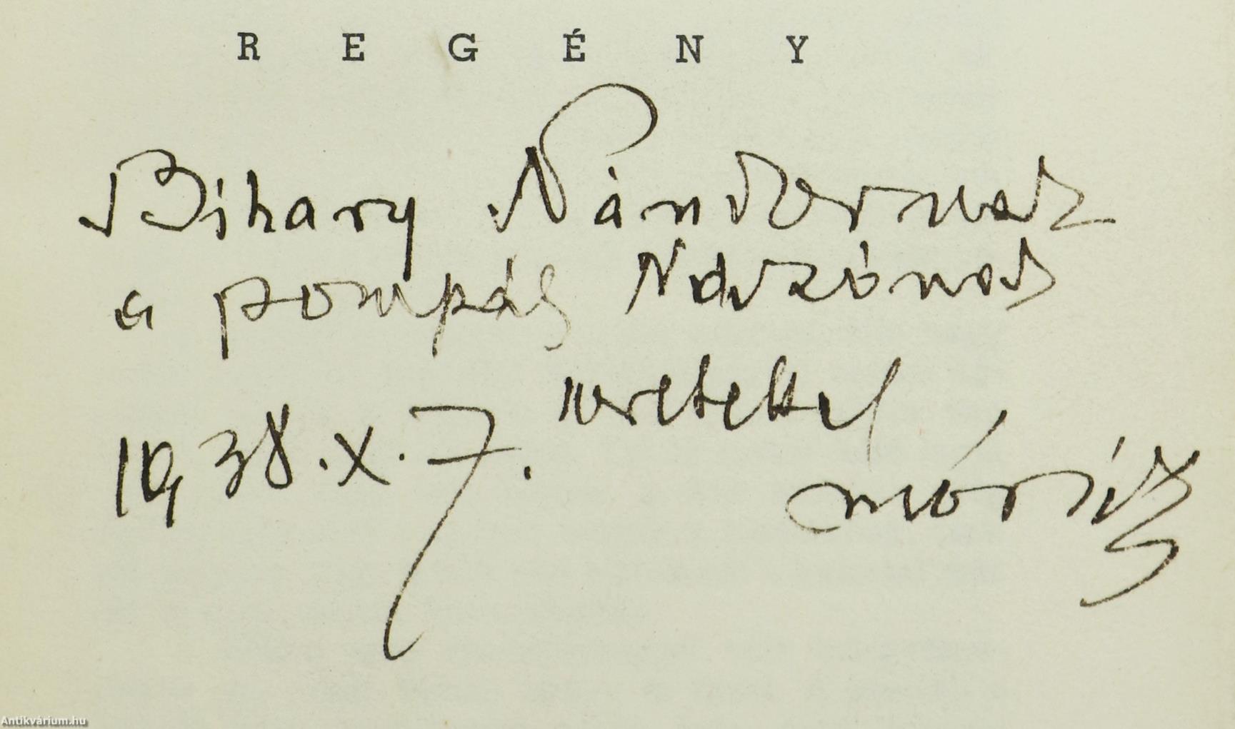 Bihary Nándornak / a pompás Názónak / szeretettel / Móricz / 1938. X. 7.