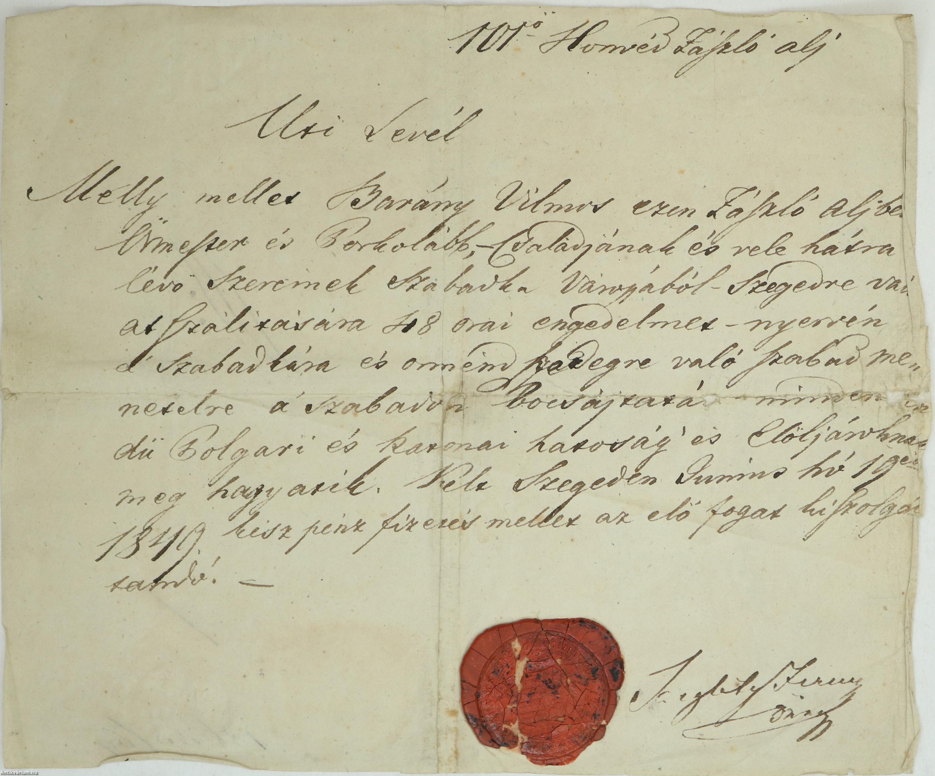 Kelt Szegeden Junius hó 19-én 1849. kész pénz fizetés mellet az elő fogat kiszolgál..."