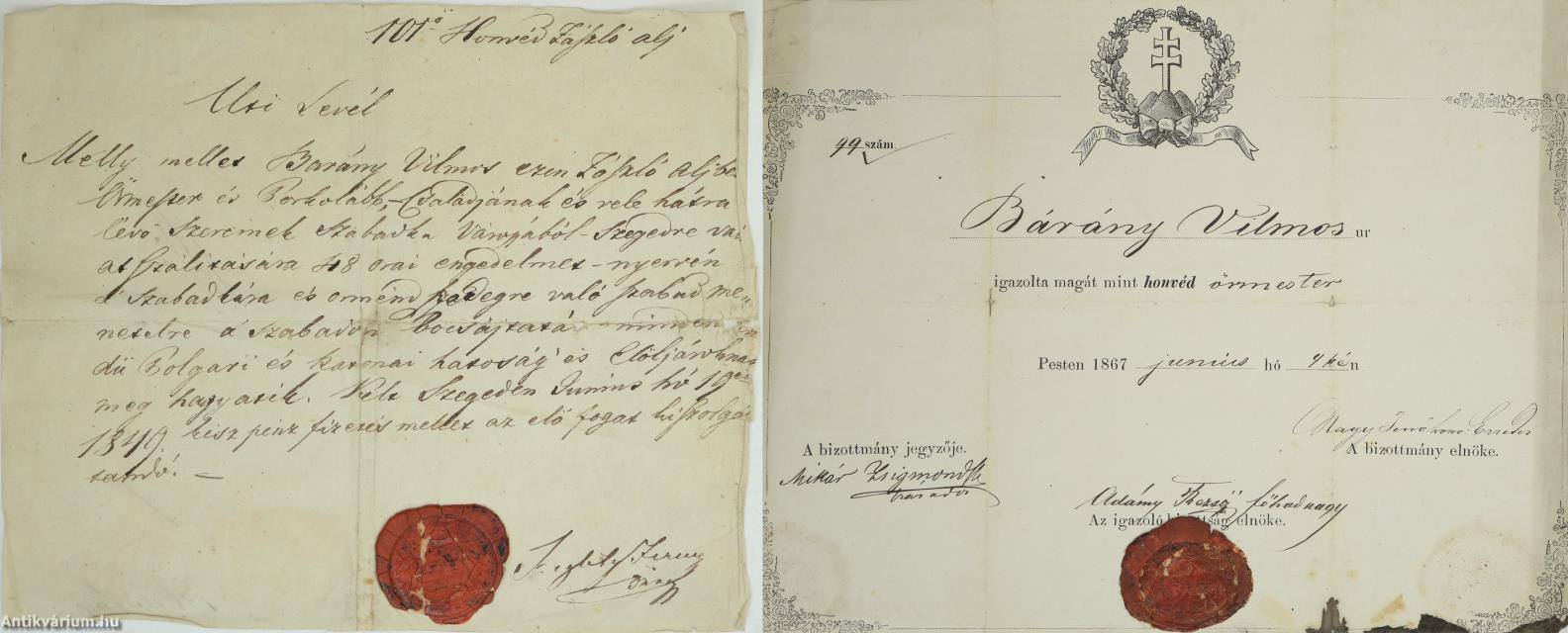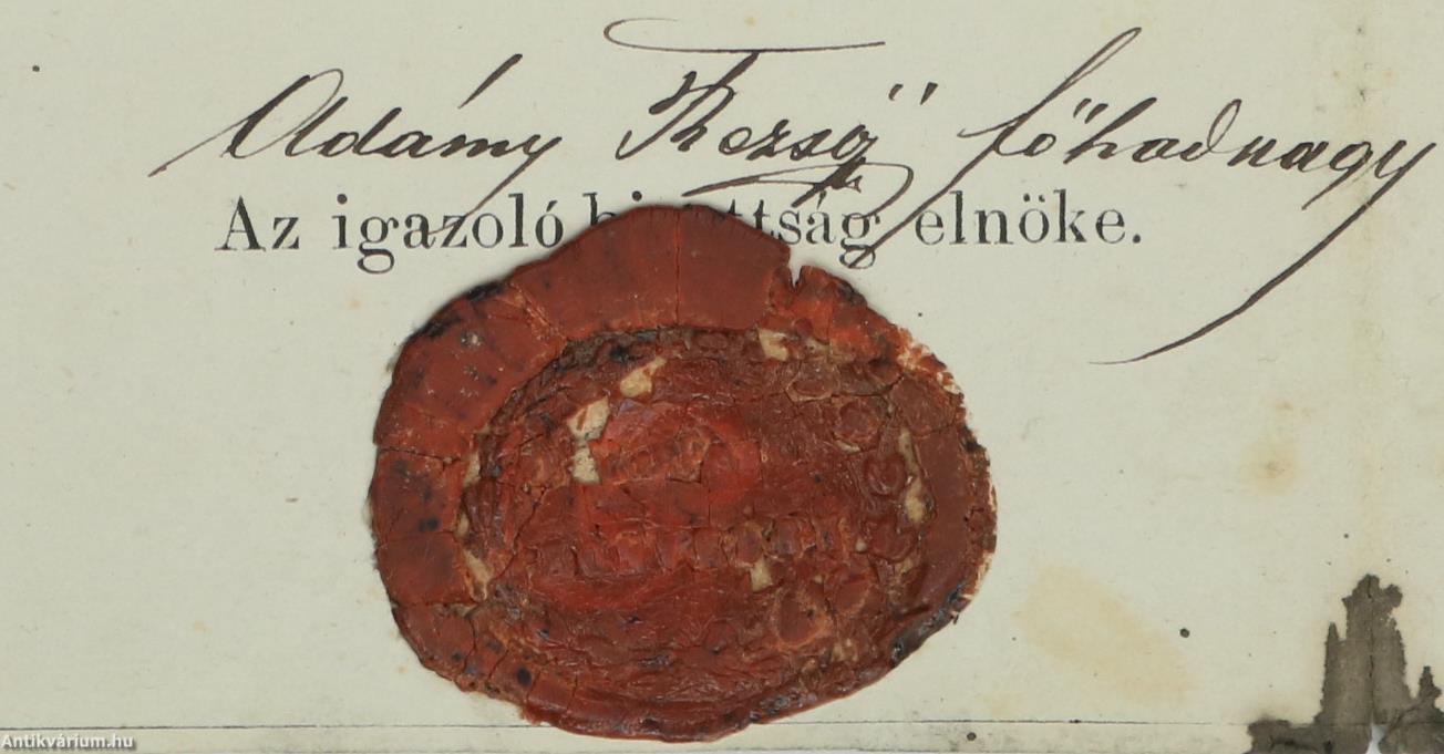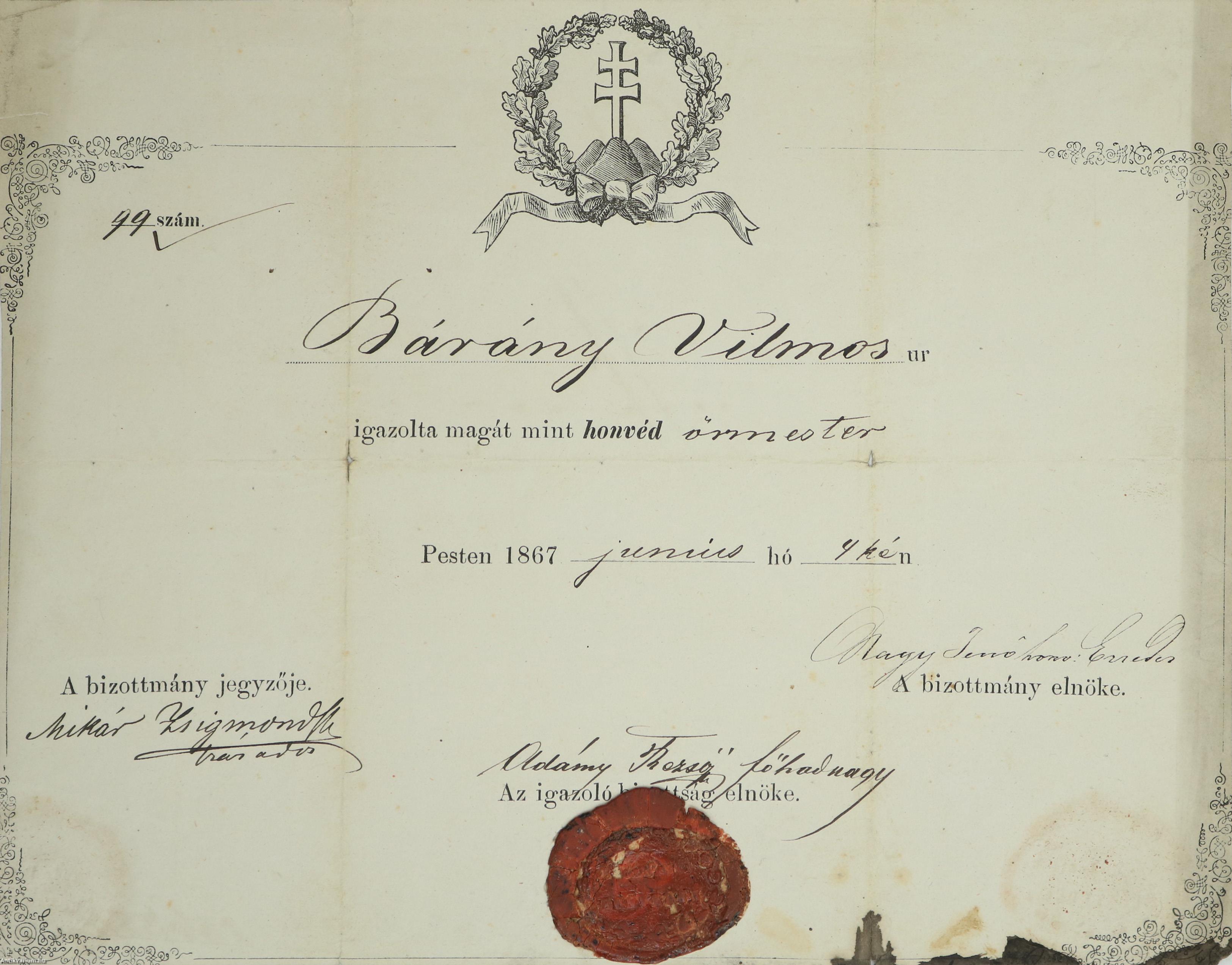 Nyomtatott, kézzel kitöltött, hajtogatott, a Buda-Pesti Honvédek viaszpecsétjével és szárazbélyegzőjével ellátott okirat, hátlapján jelzettel.
