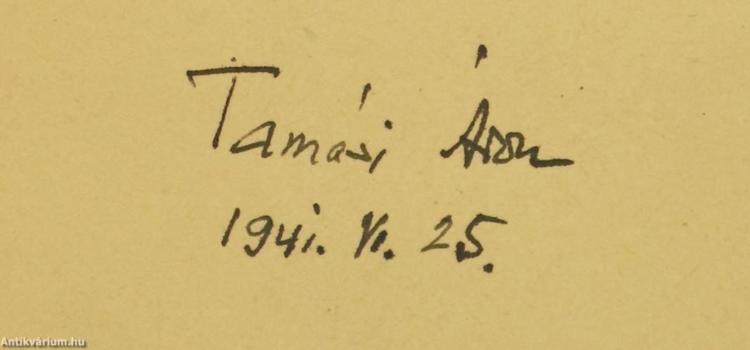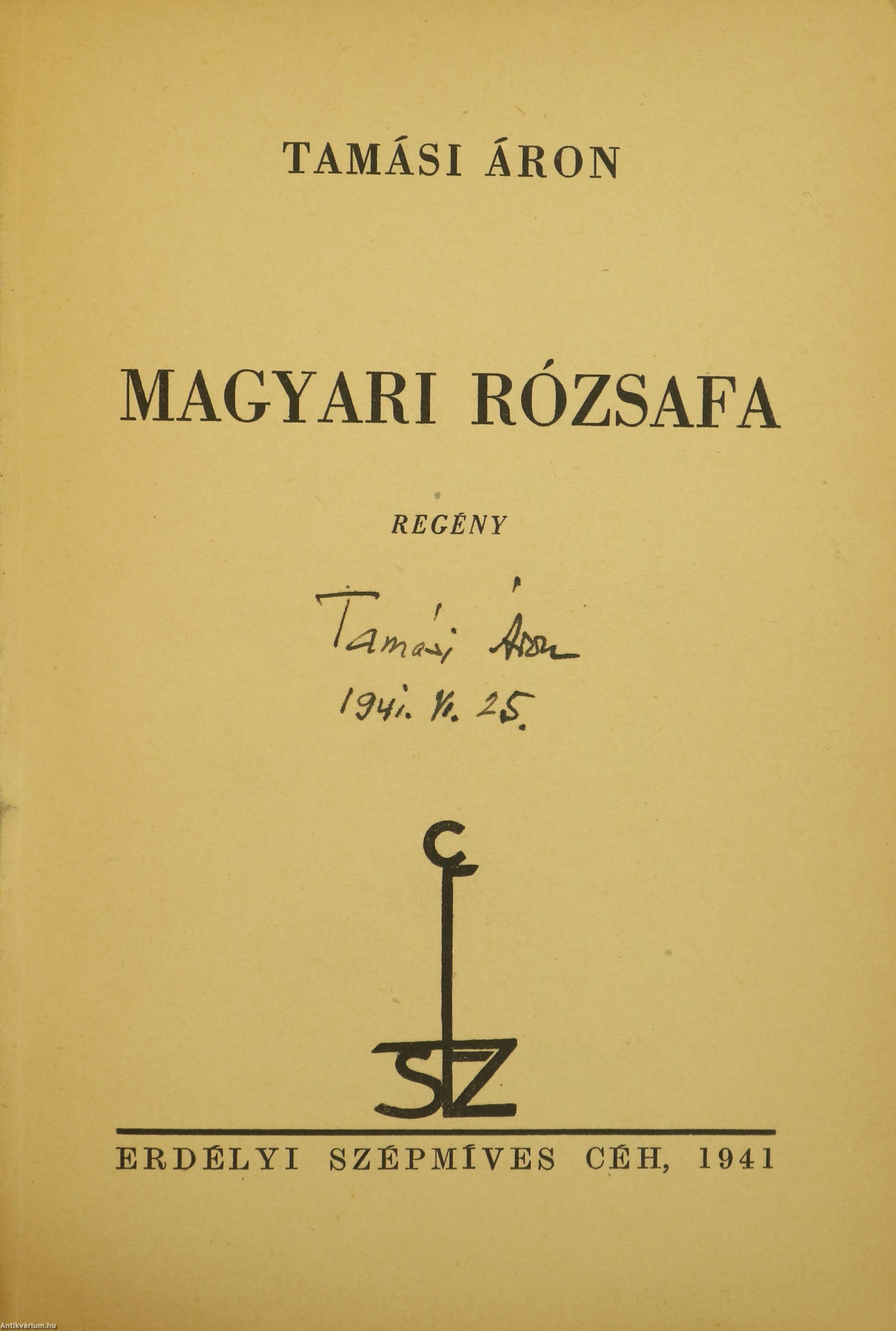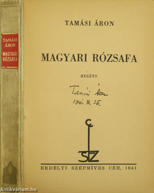 Szerző által aláírt példány. Első, számozott, bibliofil kiadás. Ez a könyv az Erdélyi Szépmíves Céh száznegyvenharmadik kiadványa, XII. sorozatának 20-21. számú könyve. Magyari rózsafa. Regény. Írta: Tamási Áron. A címlapon a szerző, Tamási Áron tollal beírt, jól olvasható aláírása látható. "E könyv első kiadása kizárólag az Erdélyi Szépmíves Céh tagjai számára készült. - Ez a 91. számú példány". Az Erdélyi Szépmíves Céh pártoló tagjainak névsorával kiegészített kötet. Nyomtatta a Révai Nyomda Budapesten. Kiadói félpergamen kötésben lévő példány, feliratozatlan, színes, mintás címfedéllel és hátlappal, aranyozott feliratozású könyvgerinccel, hiánytalan állapotban. A kötet szerzője, Tamási Áron (Farkaslaka, 1897. szeptember 20. – Budapest, 1966. május 26.) erdélyi magyar író. A két háború között több novelláskötete és regénye is megjelent. Az elsők között "A szűzmáriás királyfi", amit javarészt még Amerikában írt, de csak a hazatelepülése után fejezett be. Ezután jött a Czímeresek, amiben az erdélyi világ feszültségeit írta meg. Ezt fő műve követte, az Ábel-trilógia; előbb az "Ábel a rengetegben", majd azt követően a folytatások: "Ábel az országban" és "Ábel Amerikában", melyek tartalmát javarészt saját életélményeiből merítette. Az Újság, az Ellenzék munkatársa, valamint az Erdélyi Helikon alapító tagja volt. Külön rovata volt a Brassói Lapokban „Tiszta beszéd” címmel. 1935-ben részt vett az Új Szellemi Front kísérletében. Később a "Cselekvő Ifjúság" cikksorozatában az „erdélyi gondolatot” igyekezett megújítani.