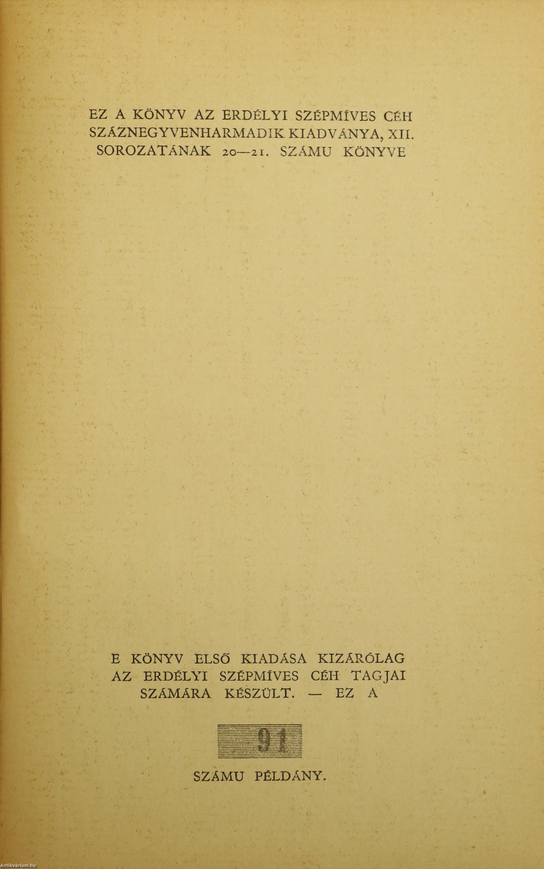 [Kolozsvár], 1941, Erdélyi Szépmíves Céh (Révai Nyomda, Budapest) 194 p. + [2] p. + IV p.