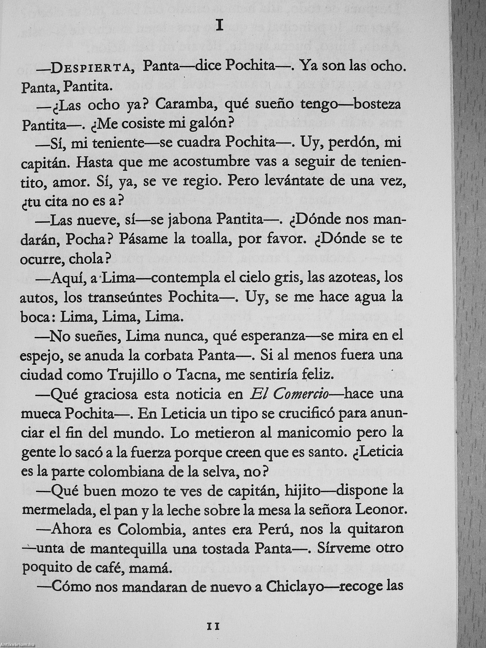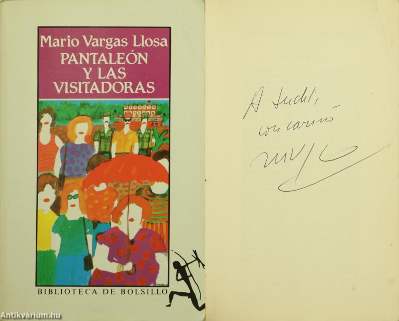 Az előlapon a szerző, Mario Vargas Llosa tollal beírt, névre szóló, spanyol nyelvű dedikációja olvasható: "A J., con carinó Mario Vargas Llosa. / Juditnak szeretettel Mario Vargas Llosa".