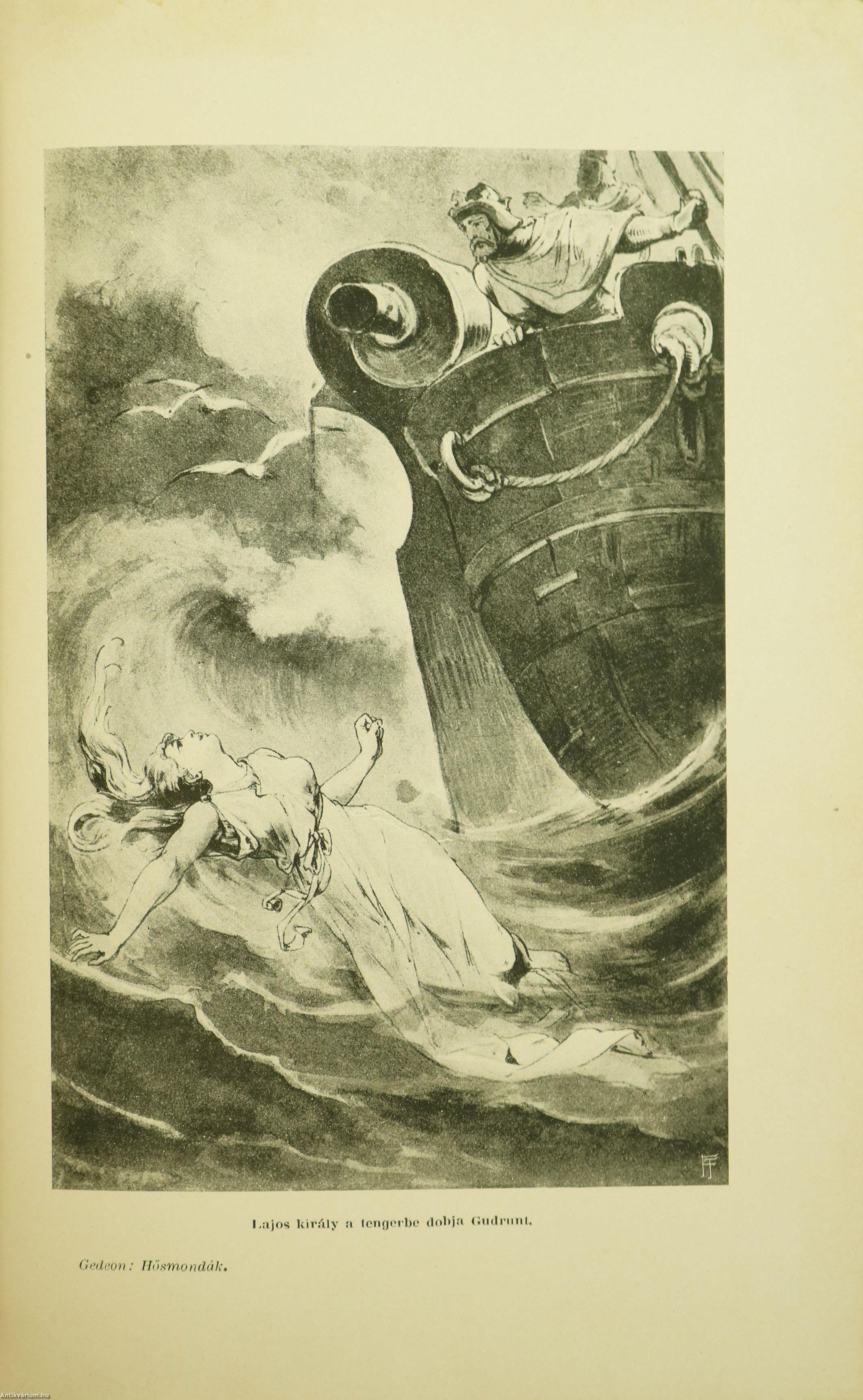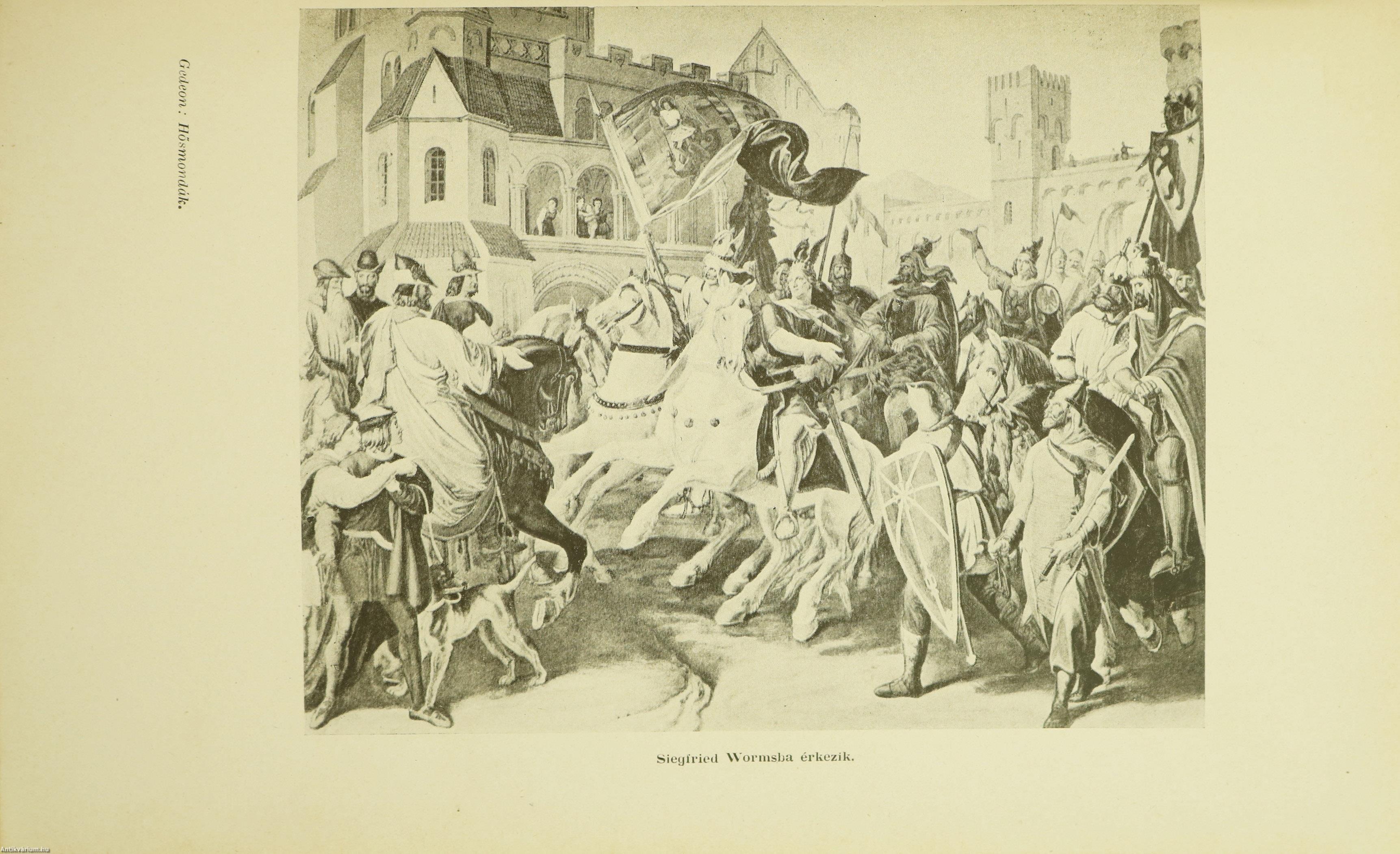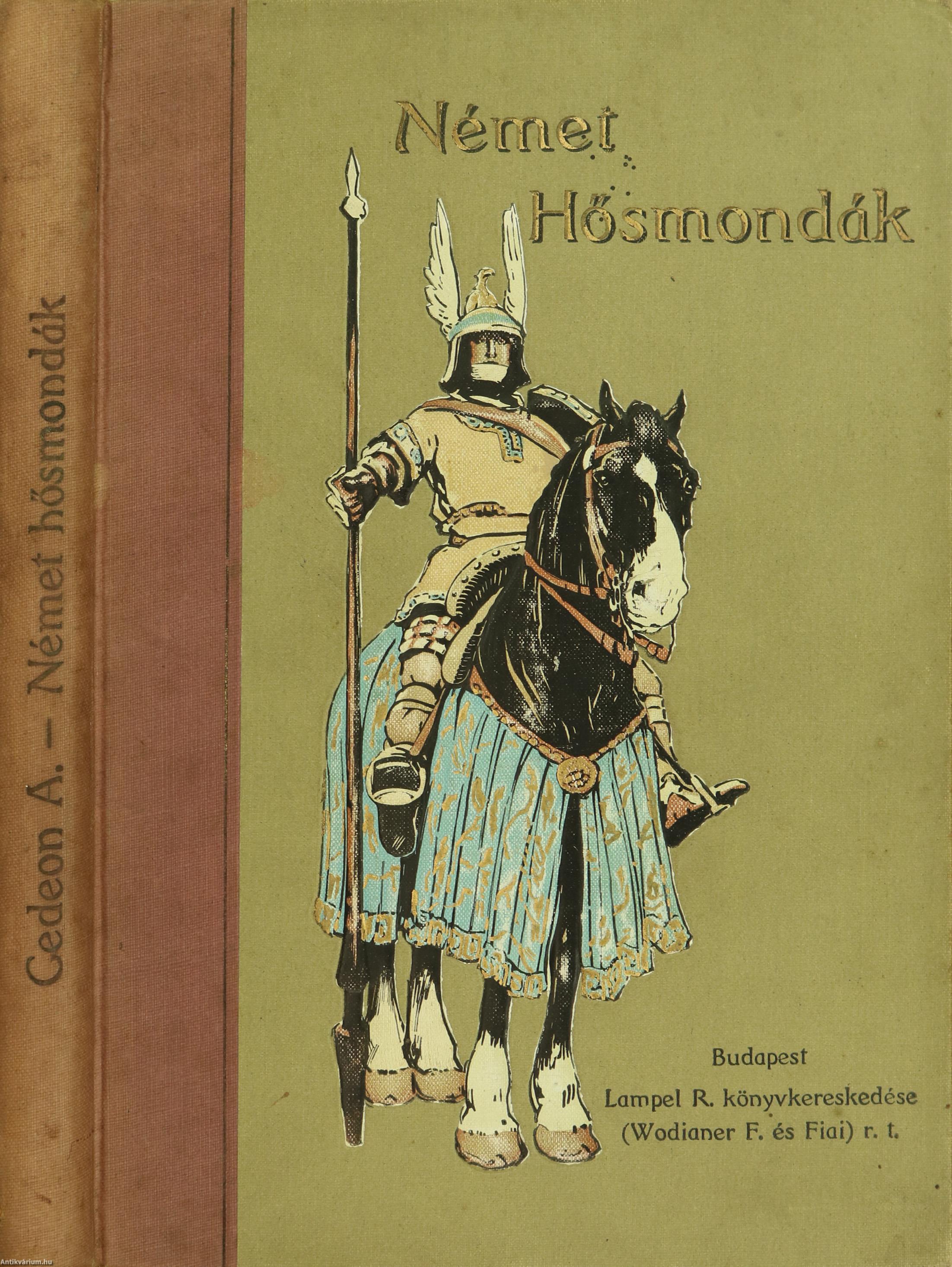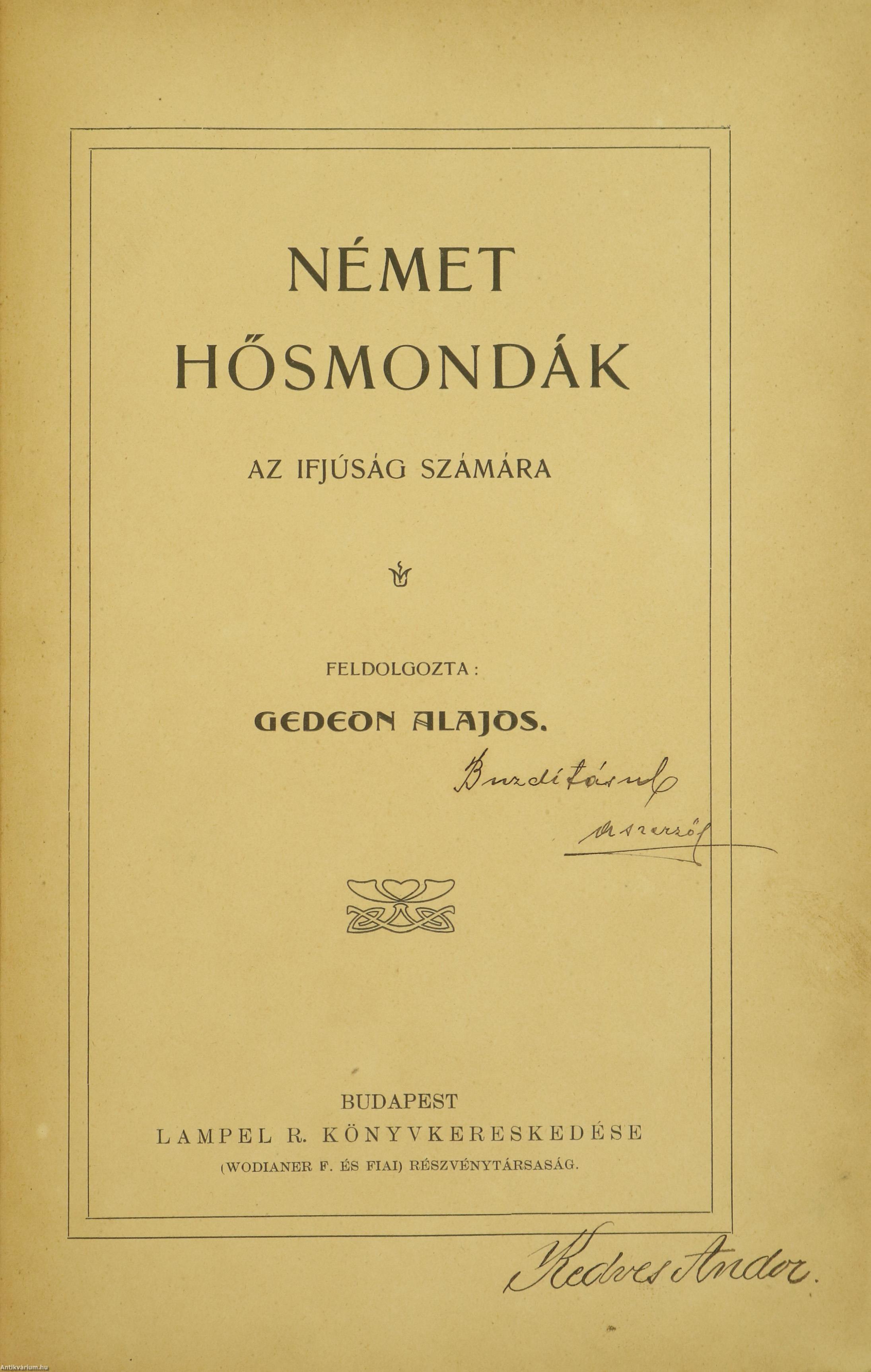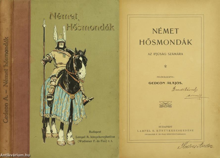 A feldolgozó által dedikált példány. Első kiadás. Német hősmondák. Az ifjúság számára. Feldolgozta: Gedeon Alajos. A címlapon a feldolgozó, Gedeon Alajos tollal írt dedikációja olvasható: "Buzdításul a szerző". Tizenöt, fekete-fehér, hártyapapírral védett képtáblával illusztrált, valamint előszóval és tartalomjegyzékkel kiegészített kötet. A címlapon tollal írt tulajdonosi bejegyzés. Nyomatott Wodianer F. és Fiainál Budapesten. Kiadói egészvászon kötésben lévő példány, aranyozott feliratozású, színes, dombornyomott illusztrációval ellátott címfedéllel, feliratos könyvgerinccel, növénymotívumokkal díszített kiadói előzéklapokkal (az egyiken ragasztott címkével), hiánytalan állapotban. A kötetet feldolgozta, Gedeon Alajos (Alsó-Mecenzéf, 1875. augusztus 6. – Makó, 1926. március 2.) író, tanár. Miután befejezte tanulmányait, miniszteri megbízásból tanulmányútra indult, járt Franciaországban, Ausztriában, Németországban és Olaszországban is. Később Nagyváradra ment, és ott reáliskolai igazgató és tankerületi főigazgató-helyettes lett. A megszálló román csapatok érkezésekor megtagadta az együttműködést és a hűségesküt, ezért folyamatosan atrocitások érték. Ezt követően Makóra ment, ahol 1920-ban kinevezték a Csanád Vezér Reálgimnázium igazgatójának. Vezetésének köszönhetőn az intézményben megszilárdult a tanulmányi és a fegyelmi helyzet.