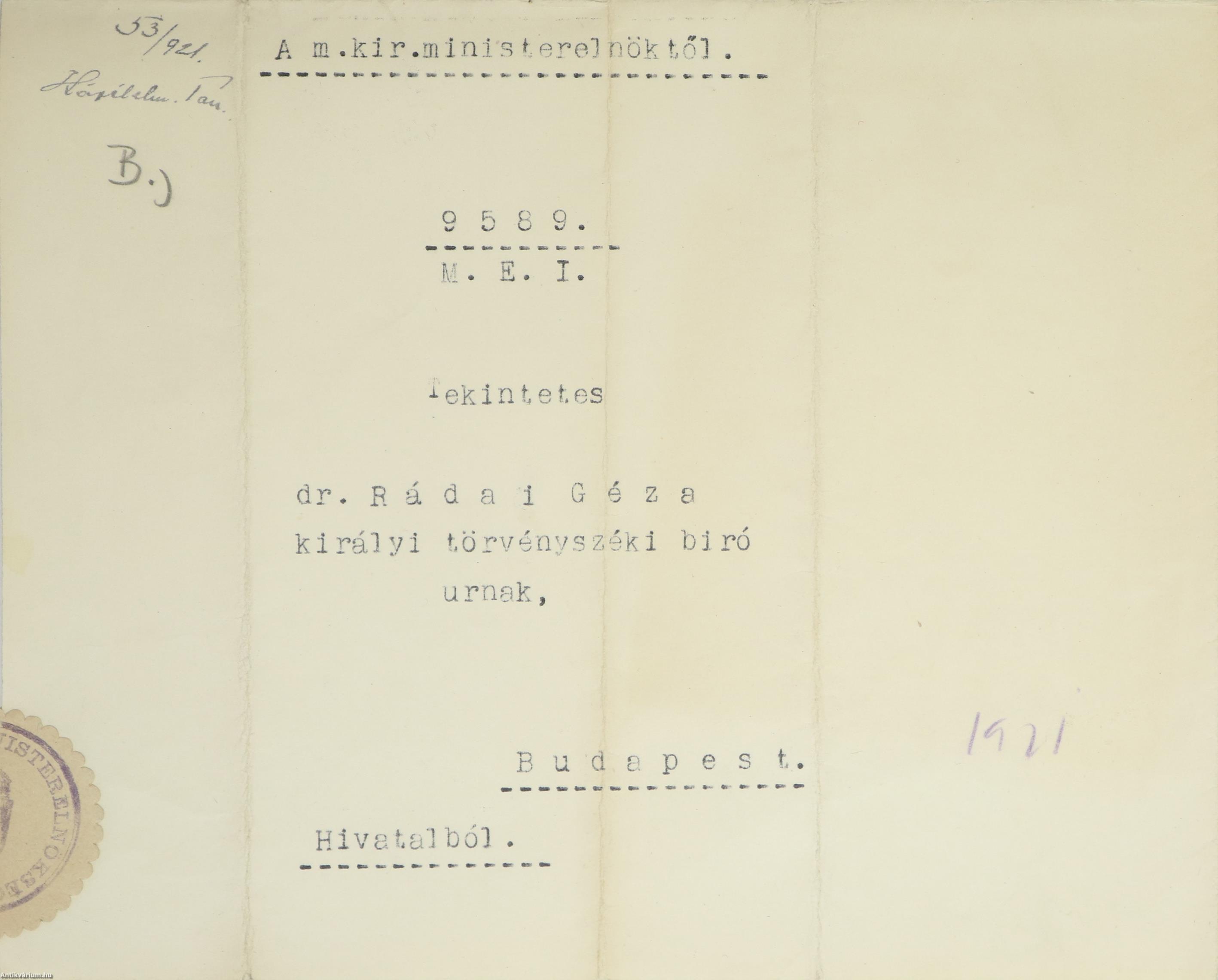 A magyar királyi ministerelnökség dombornyomott fejléces levélpapírjára géppel írt, hajtogatott, a magyar királyi ministerelnökség ostyapecsétjével ellátott, 9589/M. E. I. iktatószámmal rendelkező, hiánytalan, jó állapotú dokumentum.