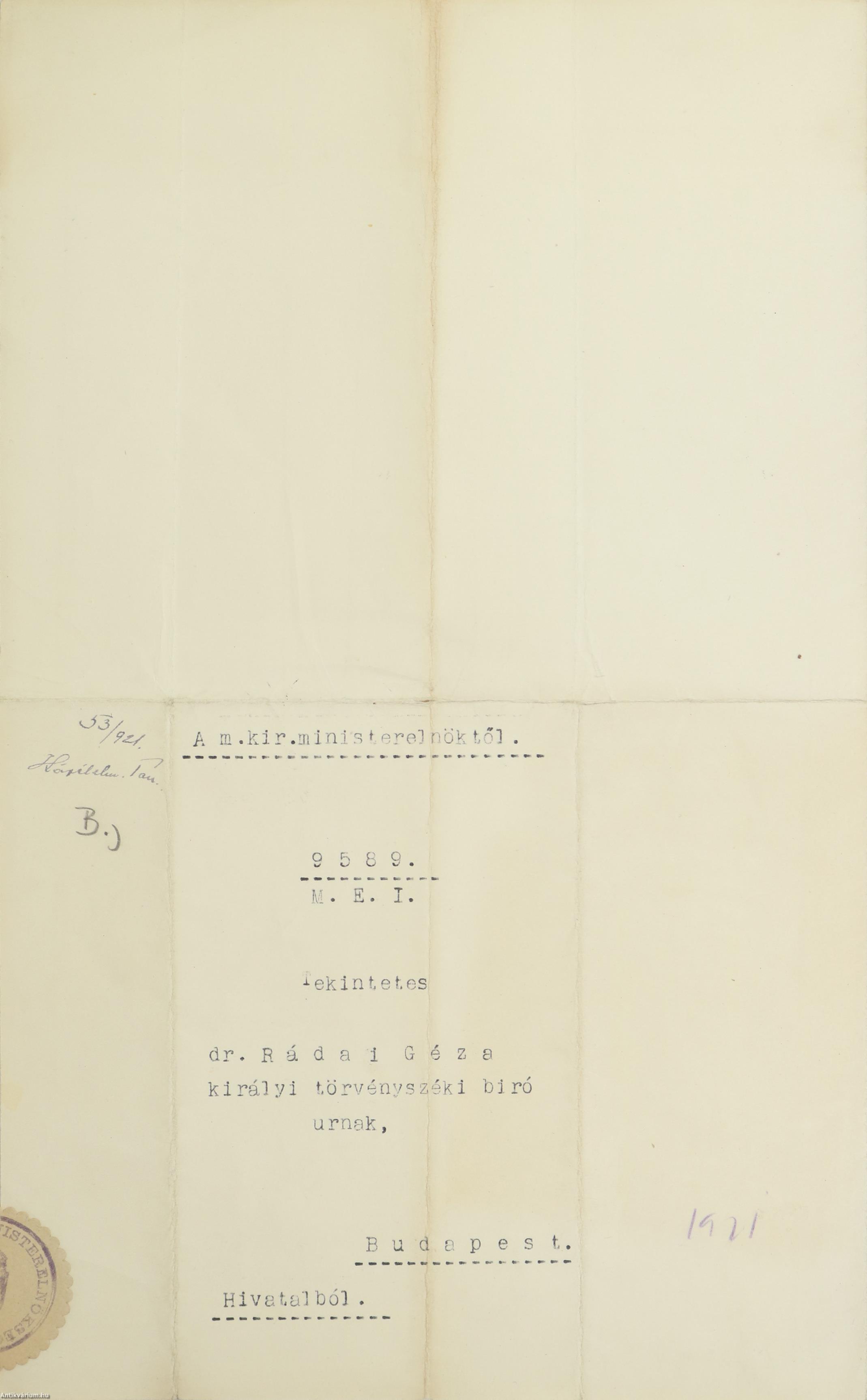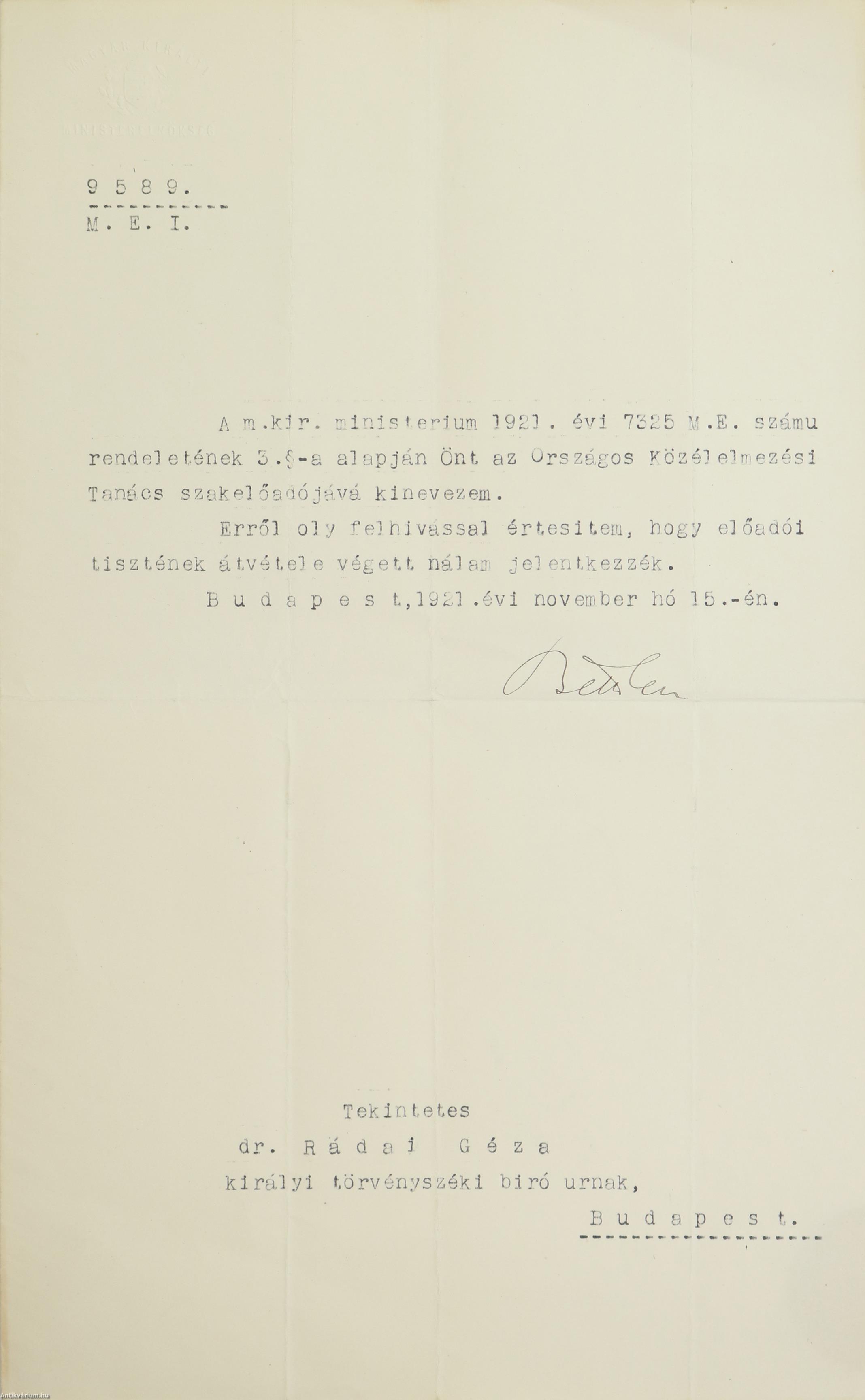 A magyar királyi ministerelnökség által Dr. Rádai Géza királyi törvényszéki bíró úr részére kiállított, az Országos Közélelmezési Tanács szakelőadójává való kinevezésről szóló okiratot aláírásával hitelesítette