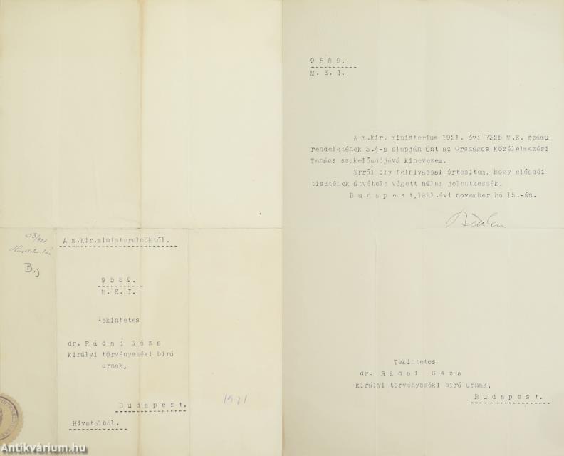 "A m. kir. ministerium 1921. évi 7325 M. E. számu rendeletének 3. §-a alapján Önt az Országos Közélelmezési Tanács szakelőadójává kinevezem.