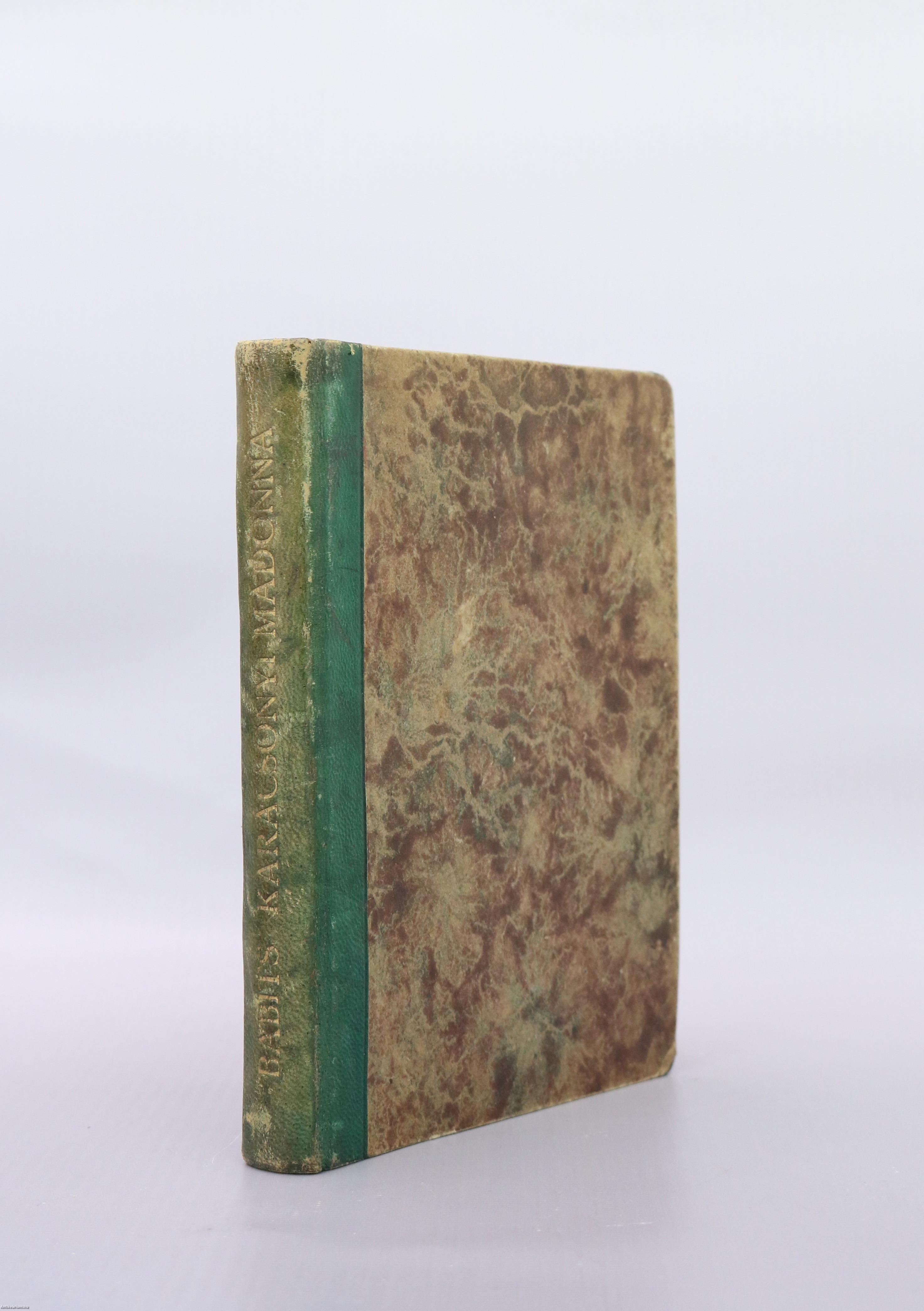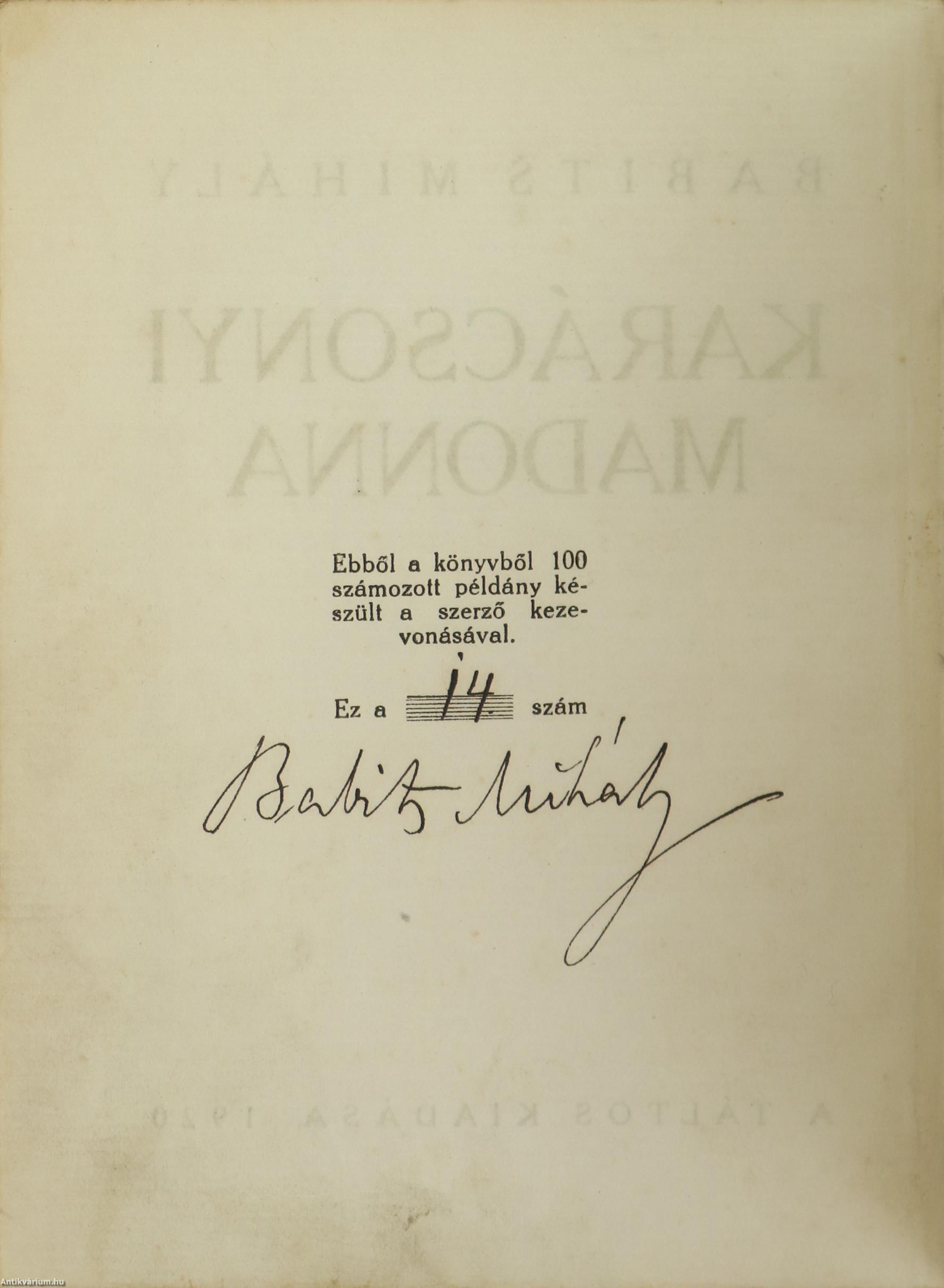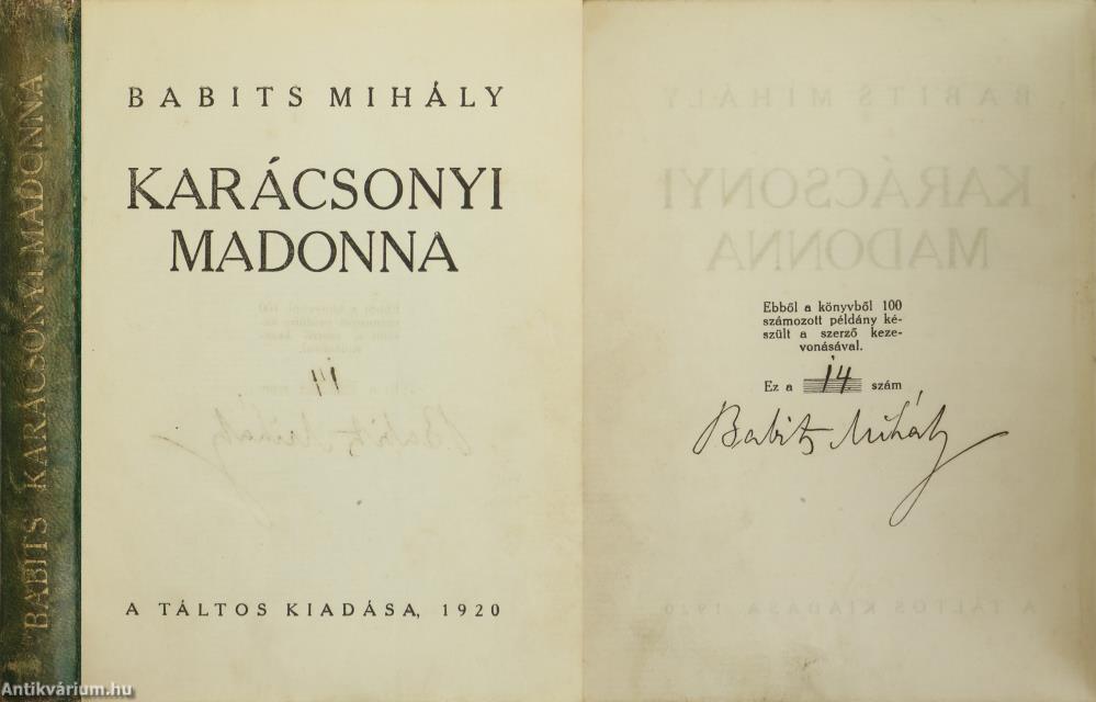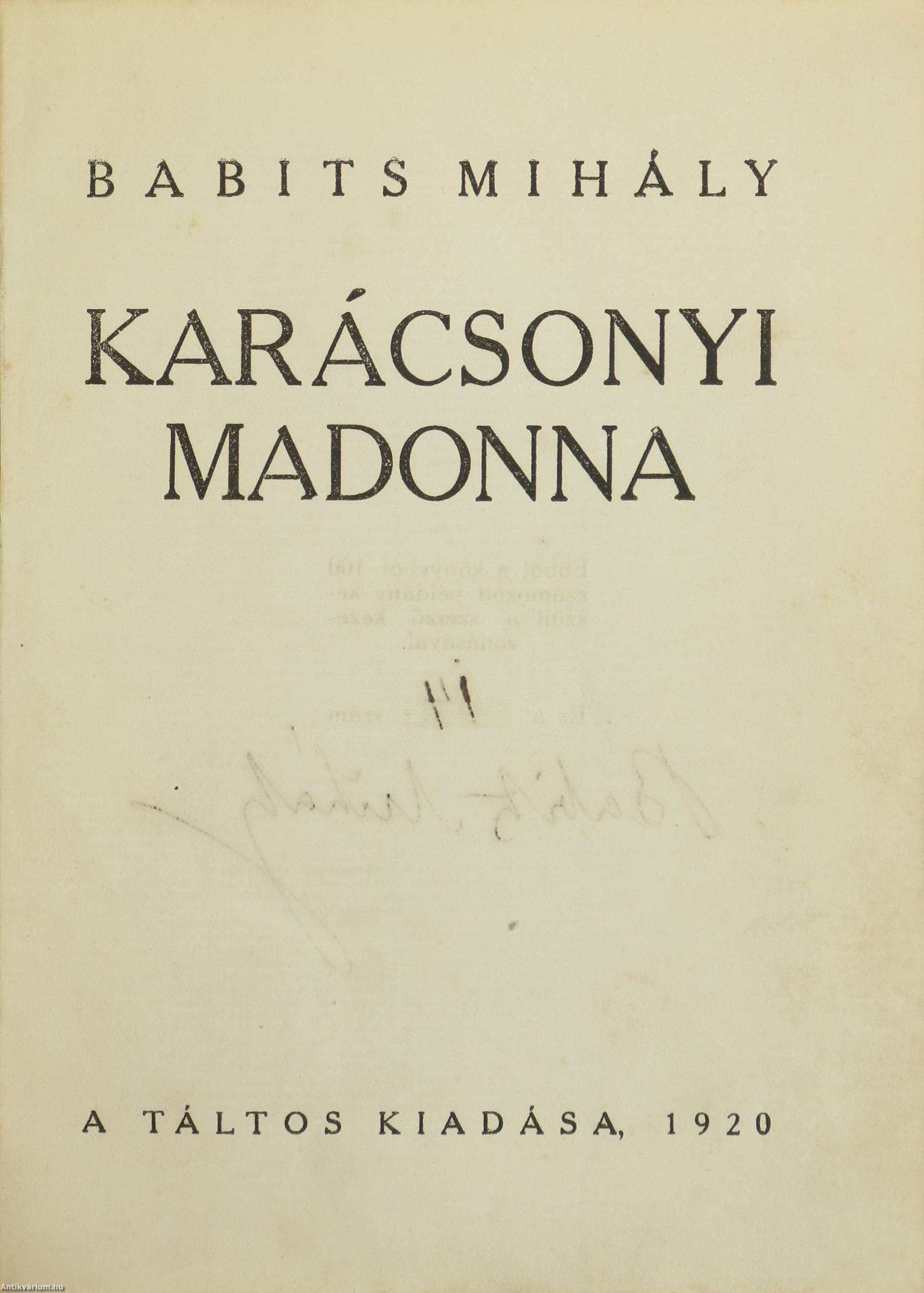 Szerző által aláírt példány.Első, számozott, bibliofil kiadás. Karácsonyi Madonna. Írta: Babits Mihály. A címlap hátoldalán a szerző, Babits Mihály tollal beírt, jól olvasható aláírása látható. "Ebből a könyvből 100 számozott példány készült a szerző kezevonásával. Ez a 14. szám." A költő novelláinak gyűjteménye. Tartalomjegyzékkel ellátott kötet.