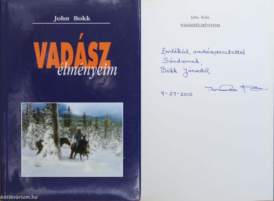 Az előlapon a szerző, John Bokk [Bökk János] erdélyi származású magyar vadászíró tollal beírt, névre szóló dedikációja olvasható: "Emlékül, vadászszeretettel S.-nak; Bökk Jánostól John Bokk 9-27-2010."