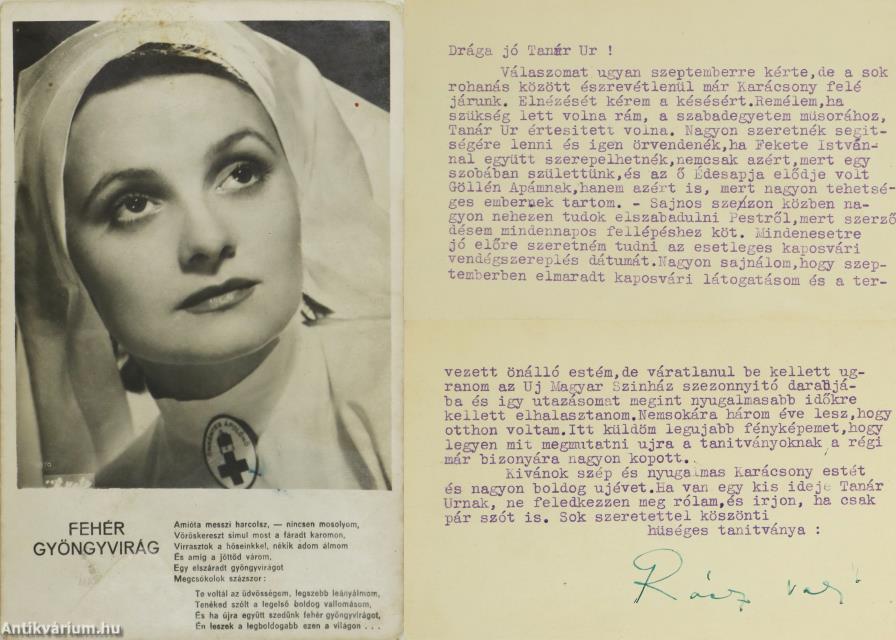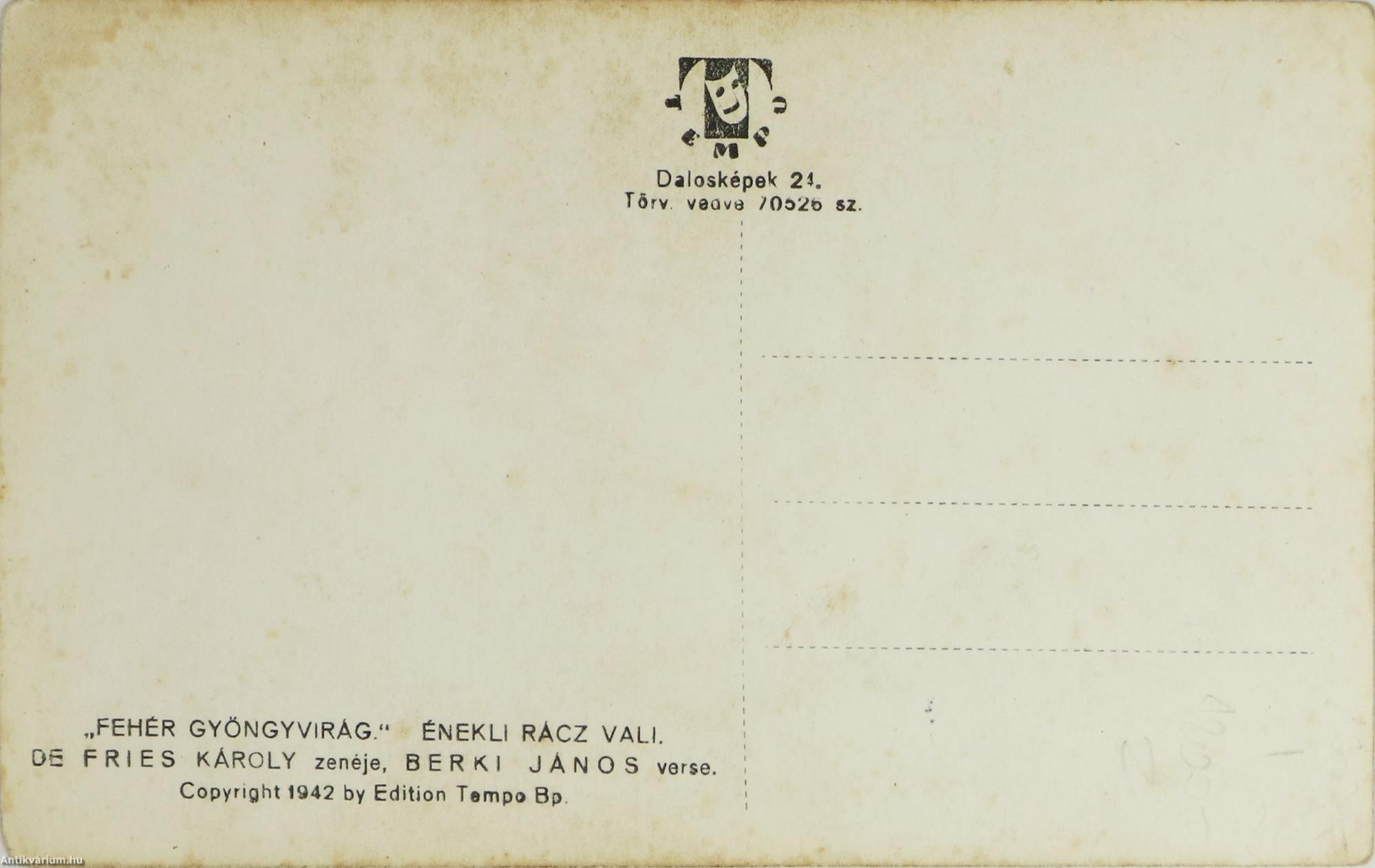 Rácz Valit ábrázoló fekete-fehér fényképpel és a a Fehér gyöngyvirág c. dal szövegével ellátott, osztott hátlappal rendelkező, jó állapotú képeslap.