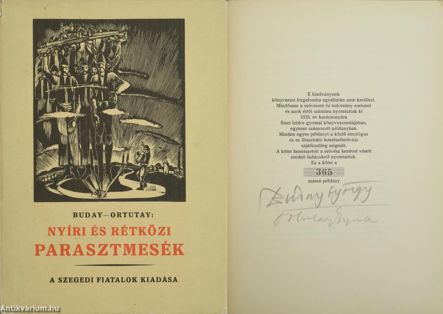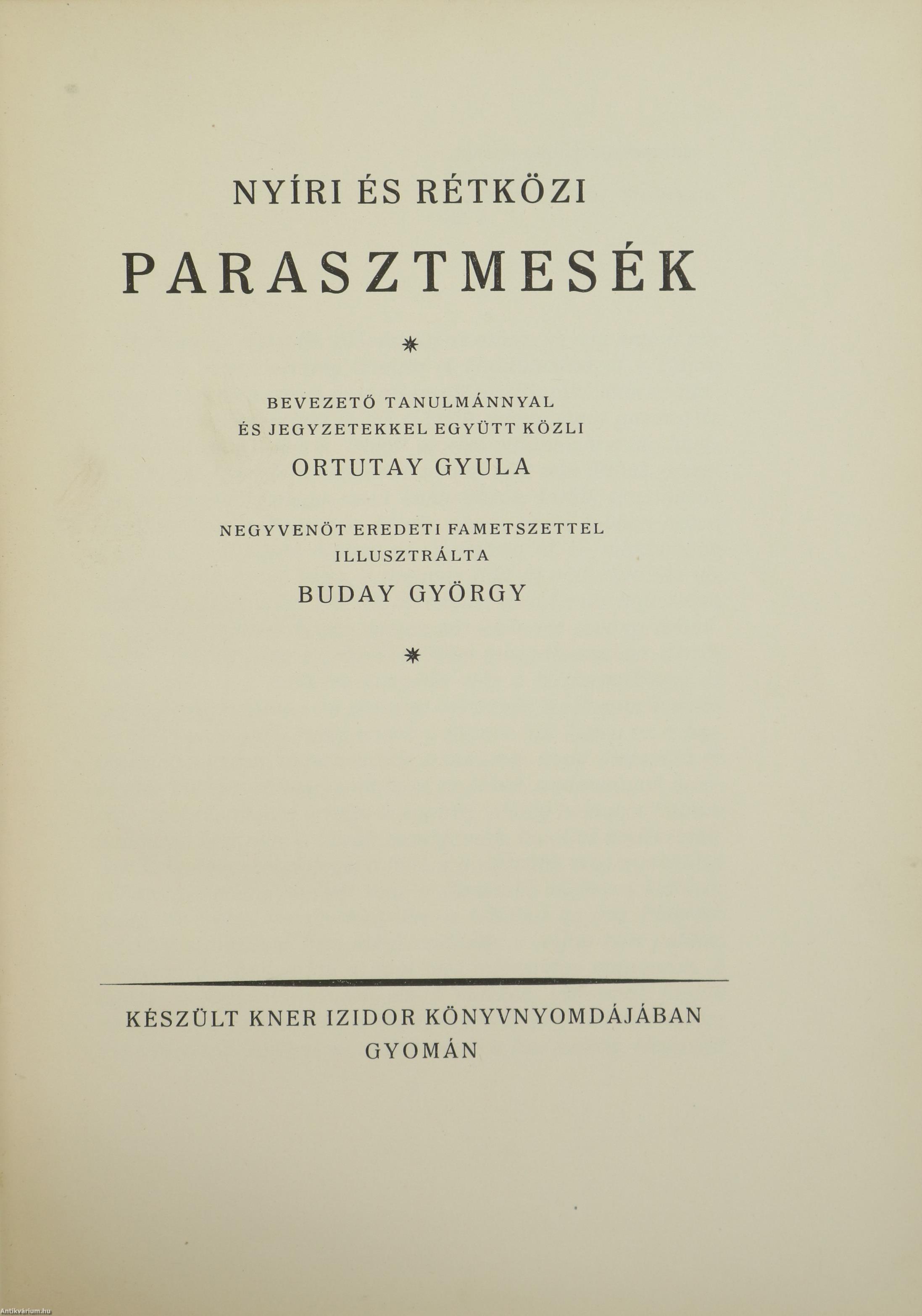 Első kiadás. A Szegedi Fiatalok Művészeti Kollégiuma tizenhatodik számú kiadványa. Nyíri és rétközi parasztmesék. Bevezető tanulmánnyal és jegyzetekkel együtt közli: Ortutay Gyula. Negyvenöt eredeti fametszettel illusztrálta: Buday György.
