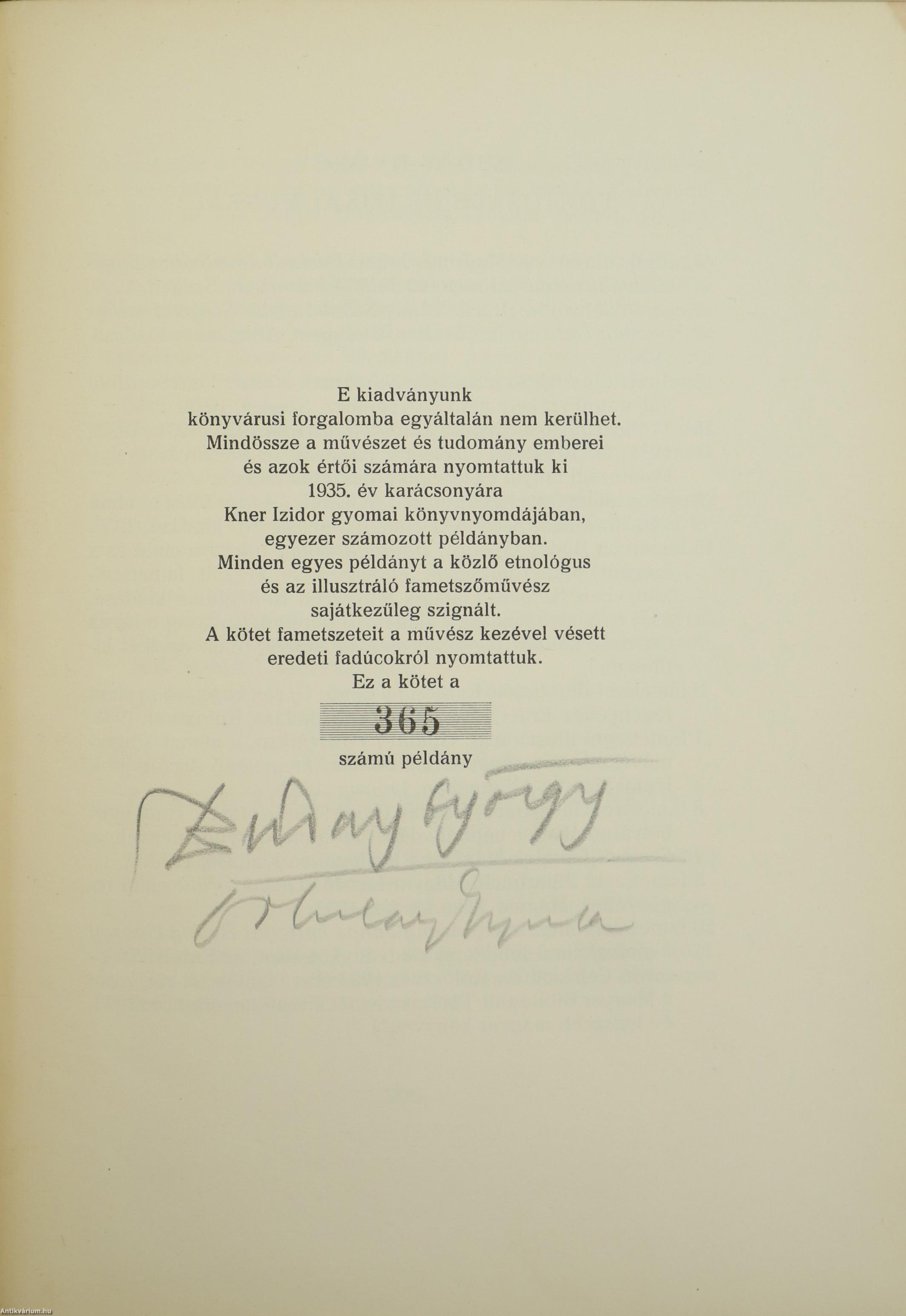 "E kiadványunk könyvárusi forgalomba egyáltalán nem kerülhet. Mindössze a művészet és tudomány emberei és azok értői számára nyomtattuk ki 1935. év karácsonyára Kner Izidor gyomai könyvnyomdájában, egyezer számozott példányban. Minden egyes példányt a közlő etnológus és az illusztráló fametszőművész sajátkezűleg szignált. A kötet fametszeteit a művész kezével vésett eredeti fadúcokról nyomtattuk. Ez a kötet a 365. számú példány."